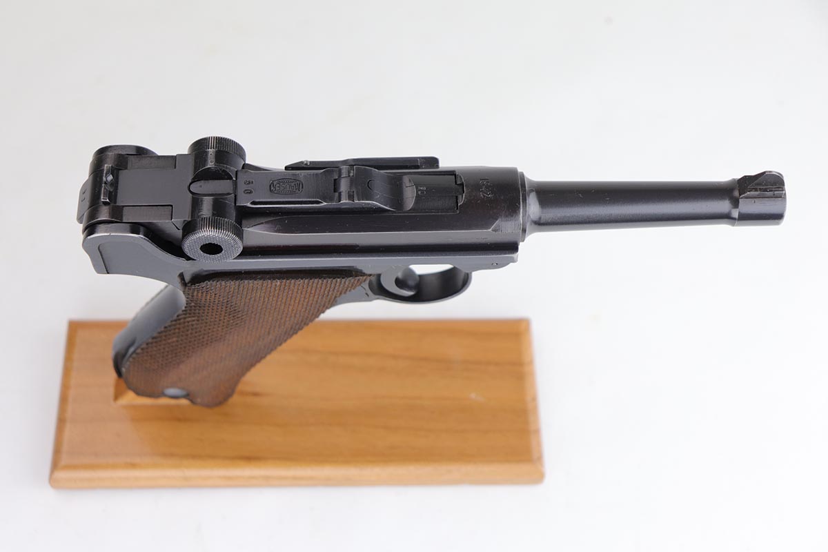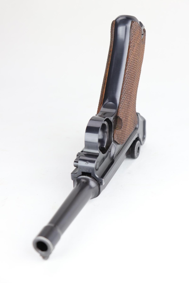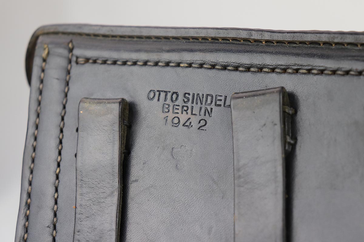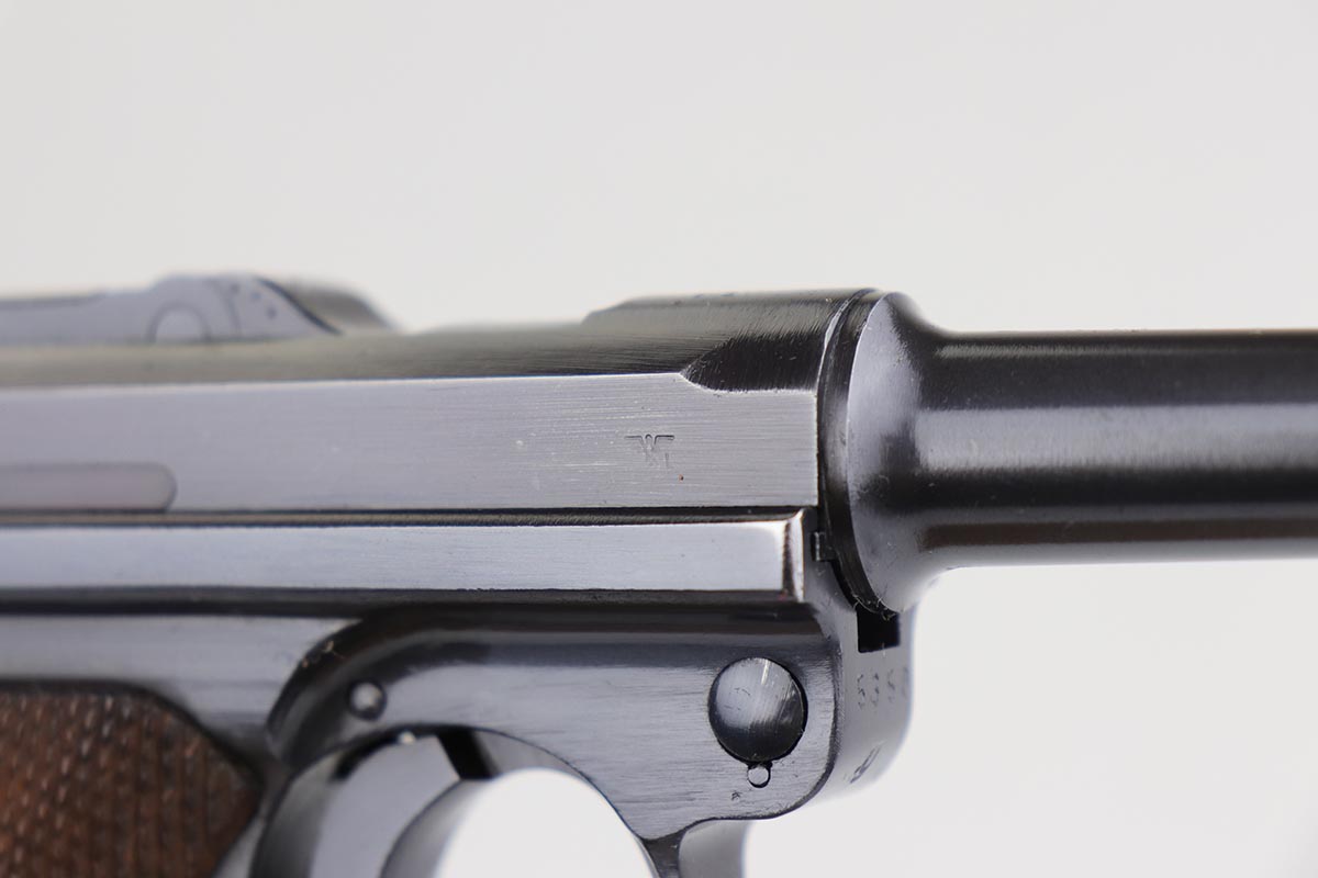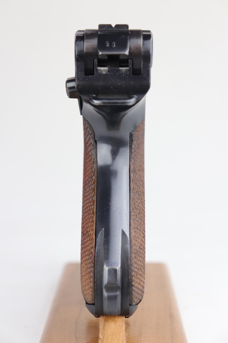 3/3/20 – This is an exceptional and complete Police Mauser Luger rig from 1942, with both matching magazines, and matching numbered holster and tool. There were only about 4,700 of this variation produced. The pistol has 99% of the original blue remaining, with only minor high point wear from the holster. Everything in this listing is numbered and matching, including the grips. Pistol has a mint bore and the grips are nearly as nice. The holster is 1942 dated with Otto Sindel maker mark, and is numbered to the gun in the upper right corner. Tool is unmarked other than the matching serial of the pistol.