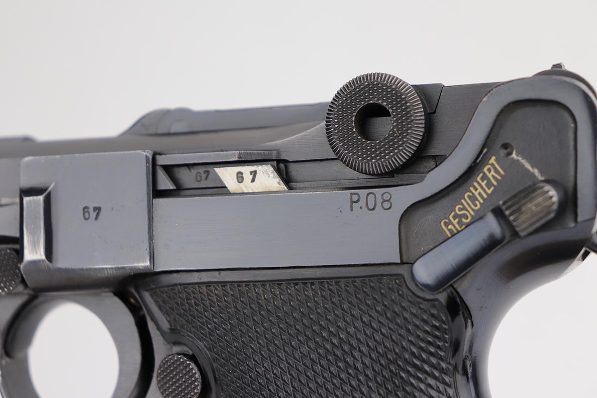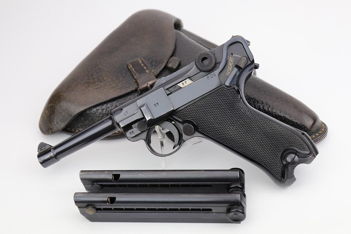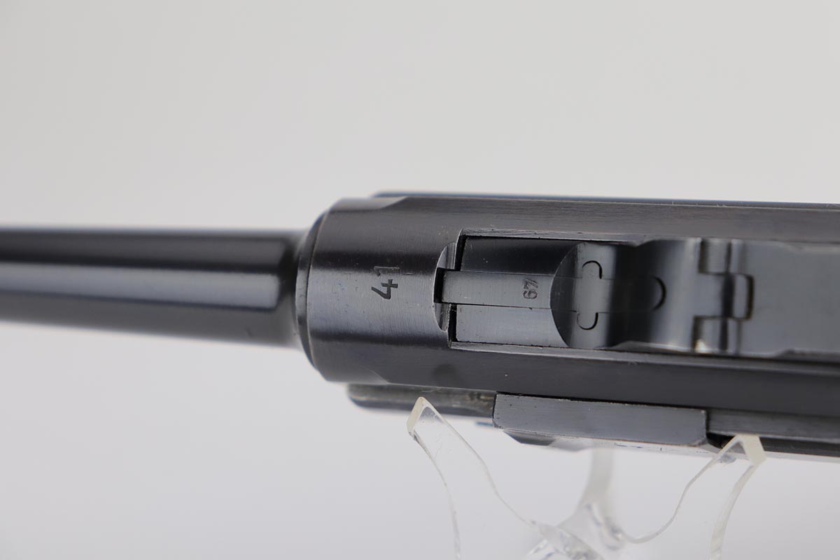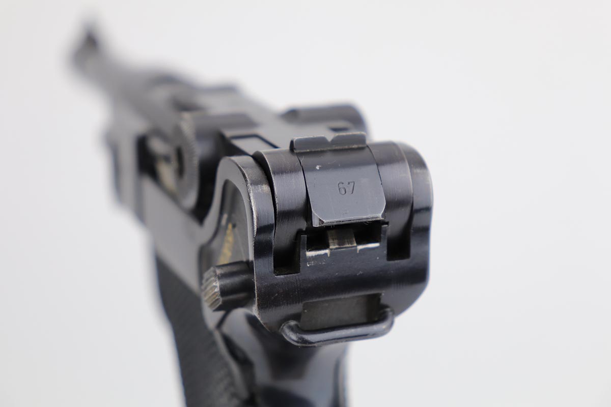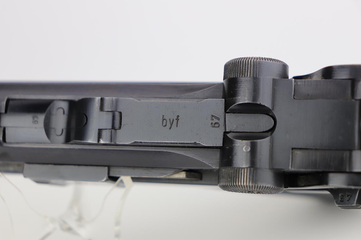 8/8/19 – This is an exceptional and complete Black Widow Mauser Luger rig from 1941. The pistol is all matching and original with desirable two-digit serial, and bluing that rates at 98%. It has just minor holster wear on the muzzle and sideplate, but is otherwise gorgeous. The rig includes two original Black Widow style magazines, and the pistol has excellent Black Widow grips. The holster is a rare and desirable pebble grain variant with ’41 date and ‘bdq’ maker mark. Original tool is present and has the same waffenamts as the pistol receiver. Excellent bore.