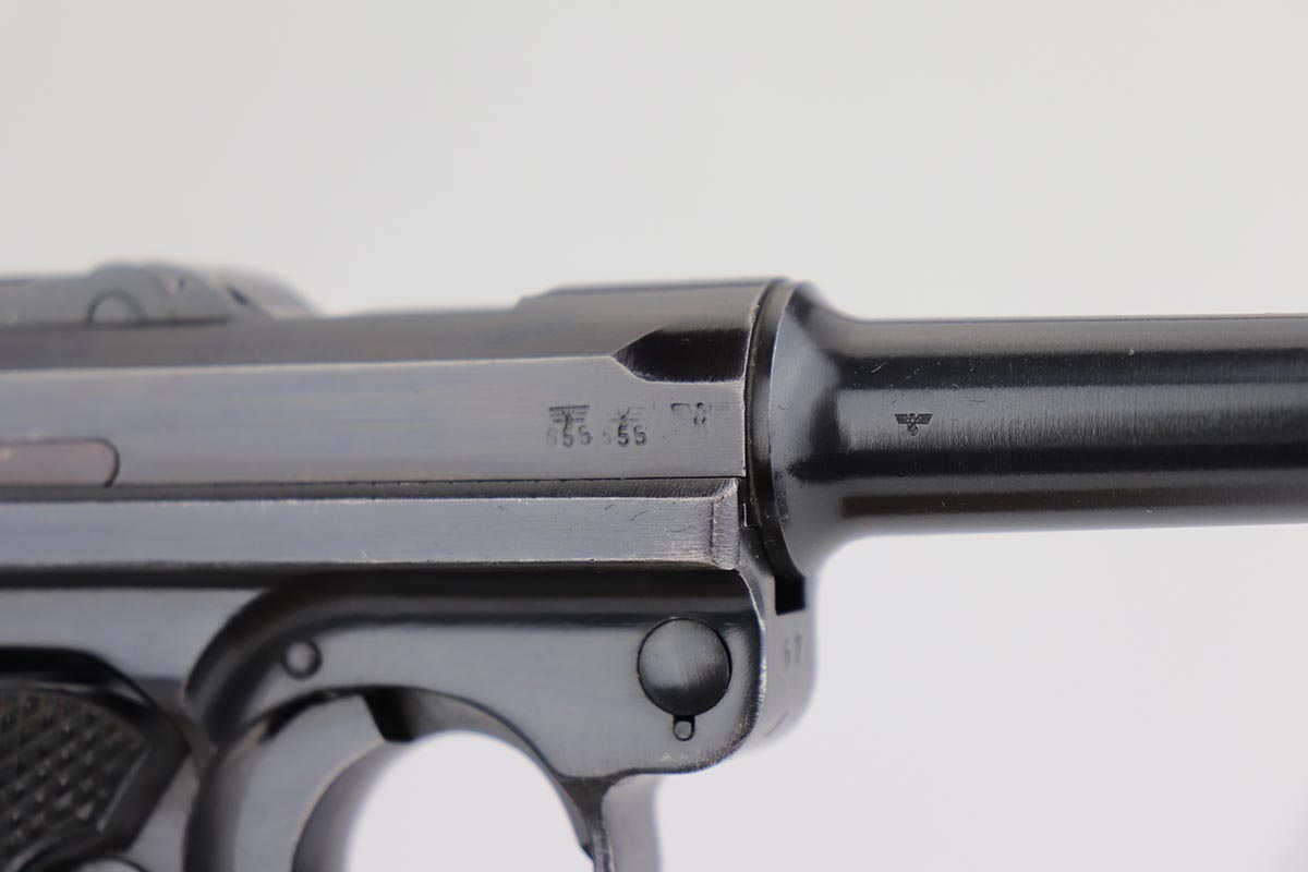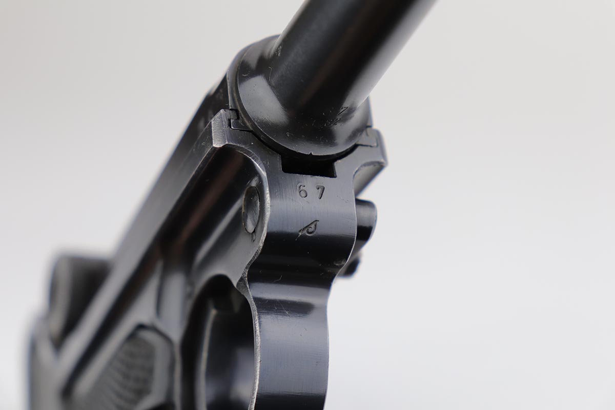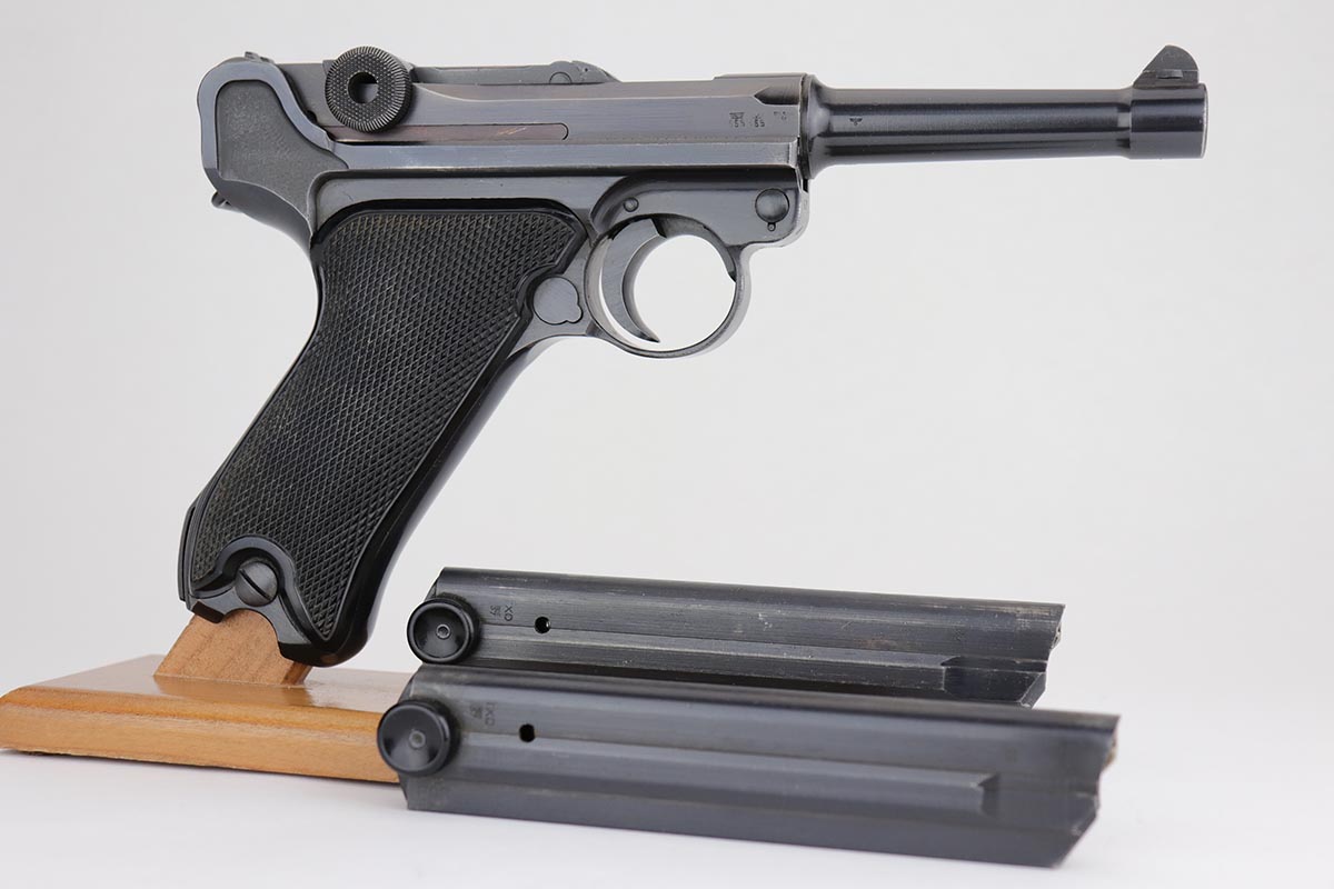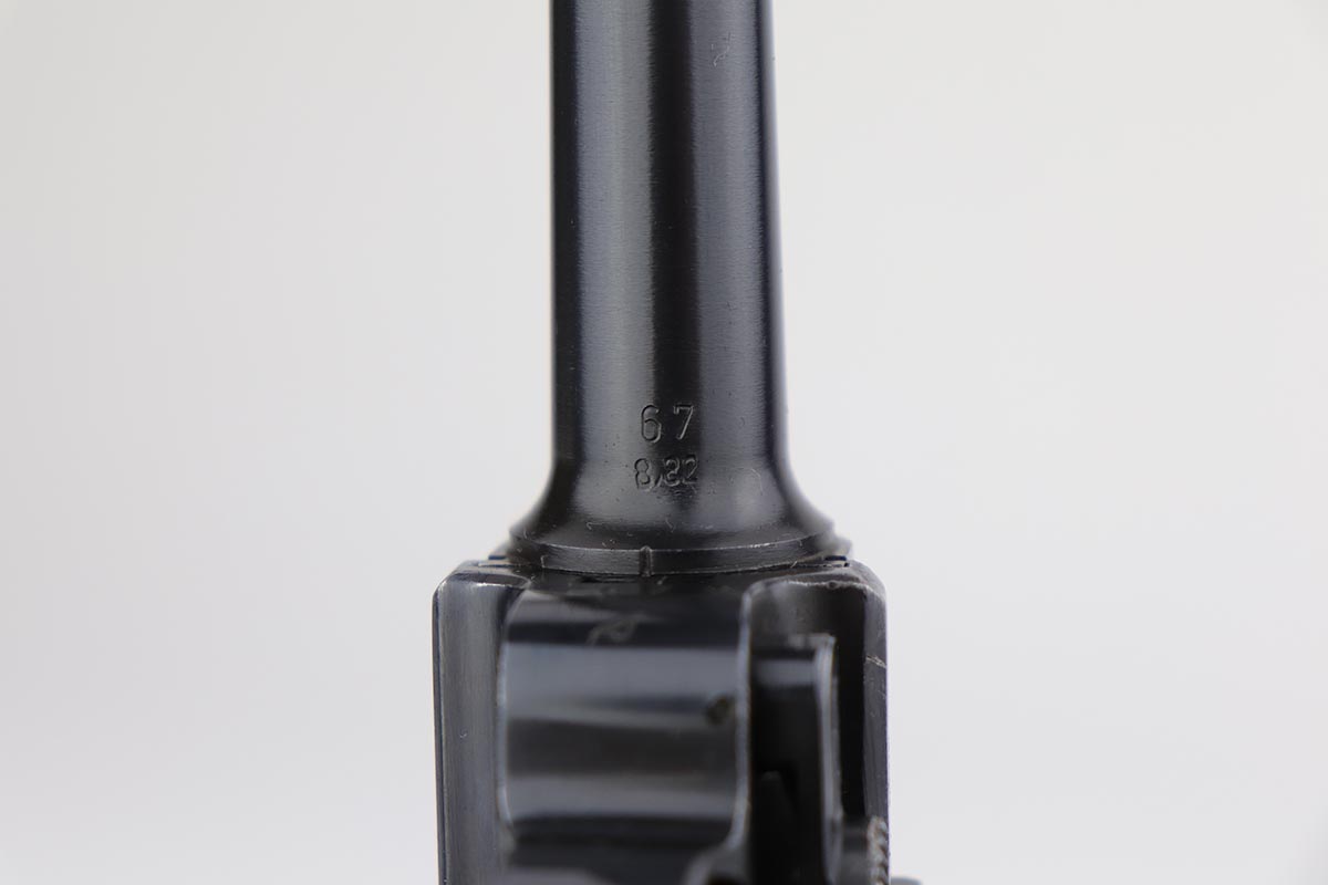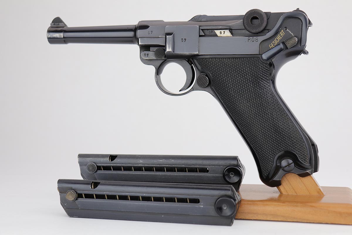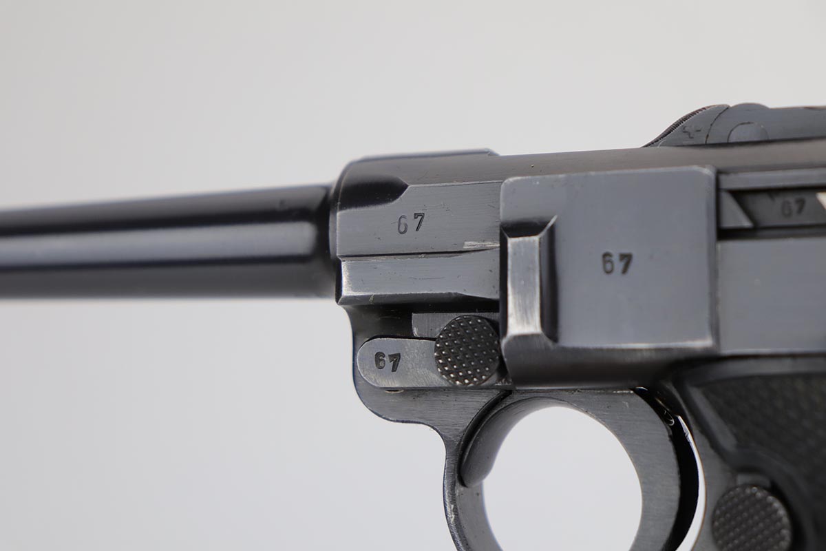 8/8/19 – This is an exceptional and complete Black Widow Mauser Luger rig from 1941. The pistol is all matching and original with desirable two-digit serial, and bluing that rates at 98%. It has just minor holster wear on the muzzle and sideplate, but is otherwise gorgeous. The rig includes two original Black Widow style magazines, and the pistol has excellent Black Widow grips. The holster is a rare and desirable pebble grain variant with ’41 date and ‘bdq’ maker mark. Original tool is present and has the same waffenamts as the pistol receiver. Excellent bore.