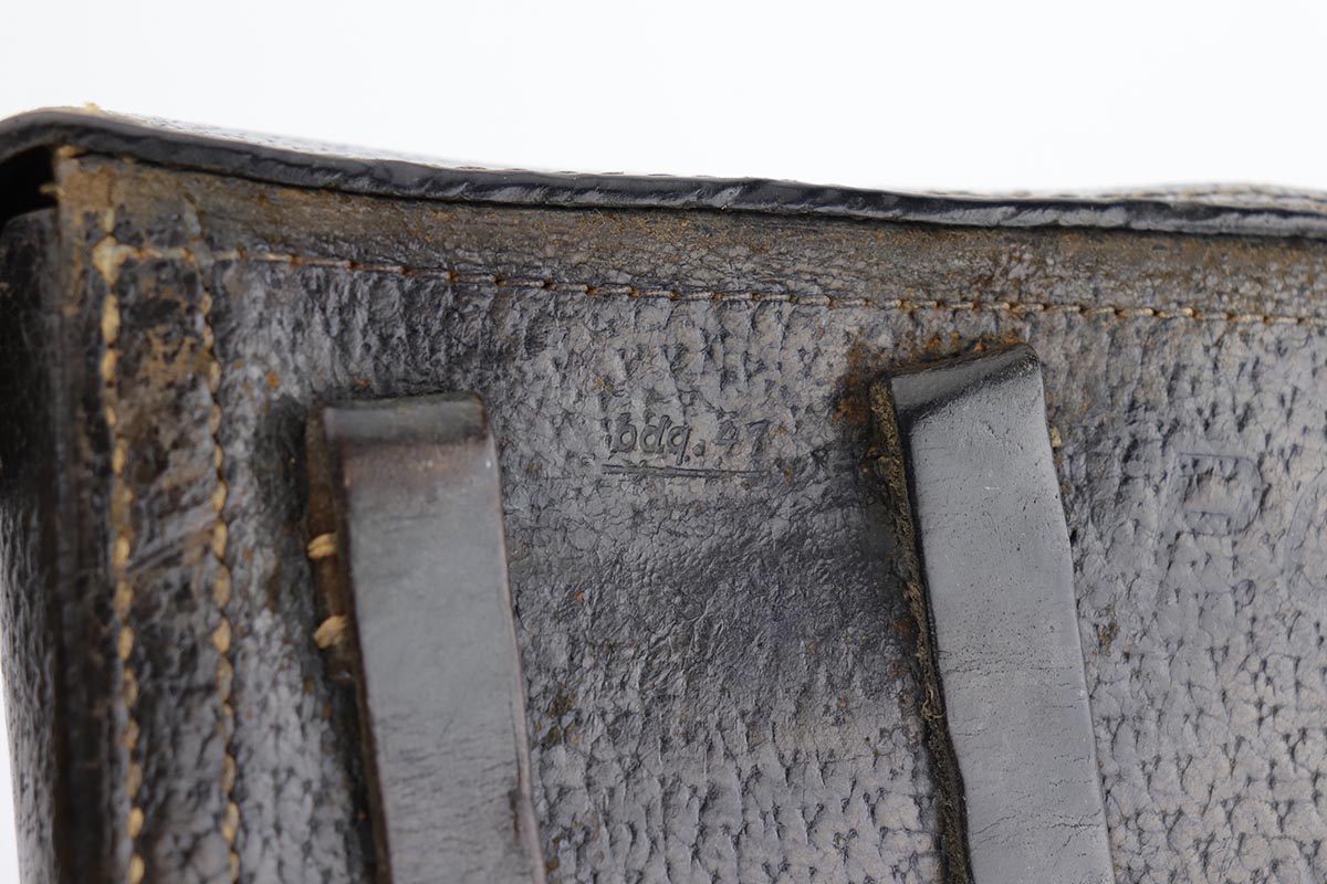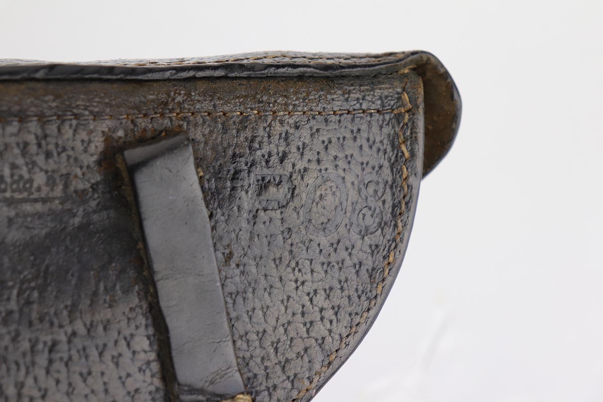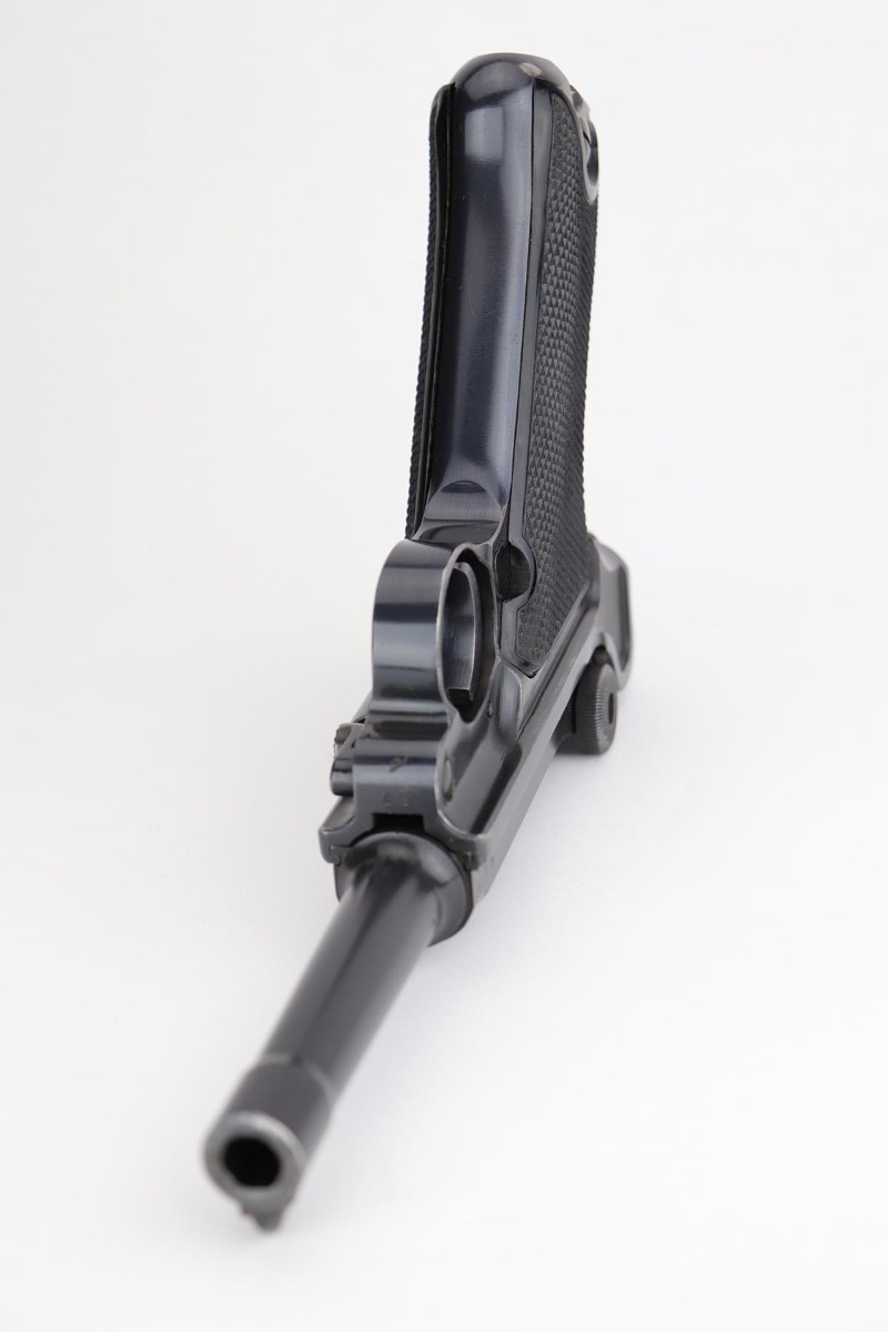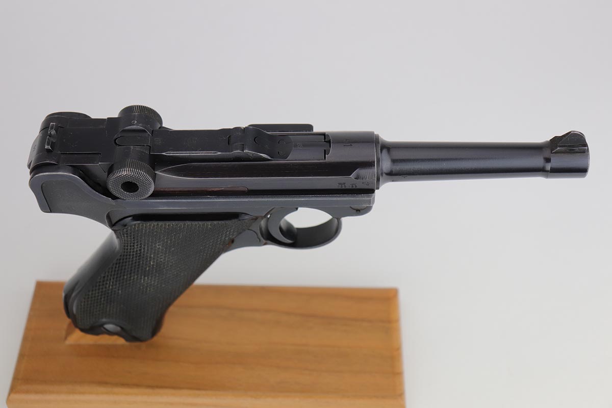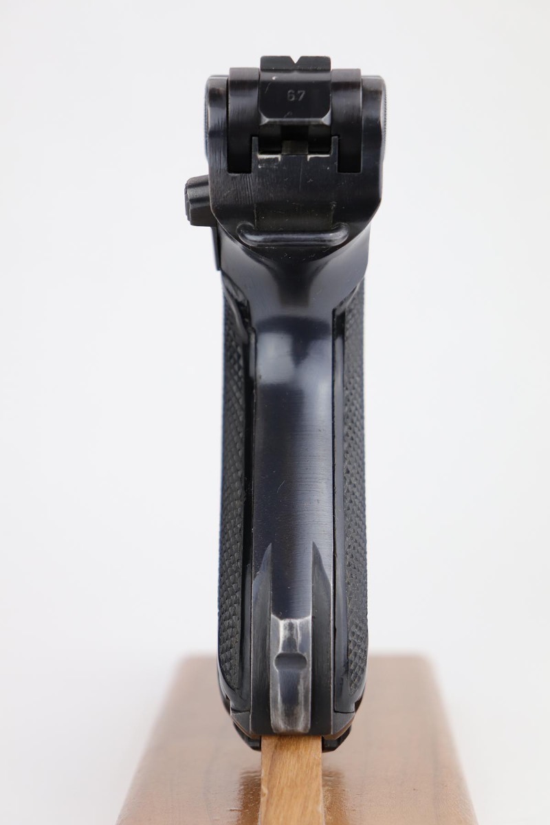 8/8/19 – This is an exceptional and complete Black Widow Mauser Luger rig from 1941. The pistol is all matching and original with desirable two-digit serial, and bluing that rates at 98%. It has just minor holster wear on the muzzle and sideplate, but is otherwise gorgeous. The rig includes two original Black Widow style magazines, and the pistol has excellent Black Widow grips. The holster is a rare and desirable pebble grain variant with ’41 date and ‘bdq’ maker mark. Original tool is present and has the same waffenamts as the pistol receiver. Excellent bore.