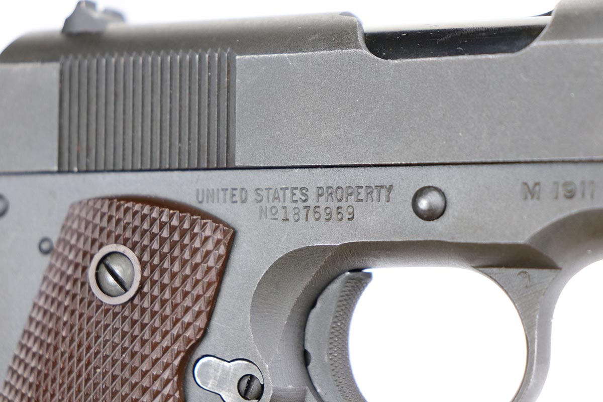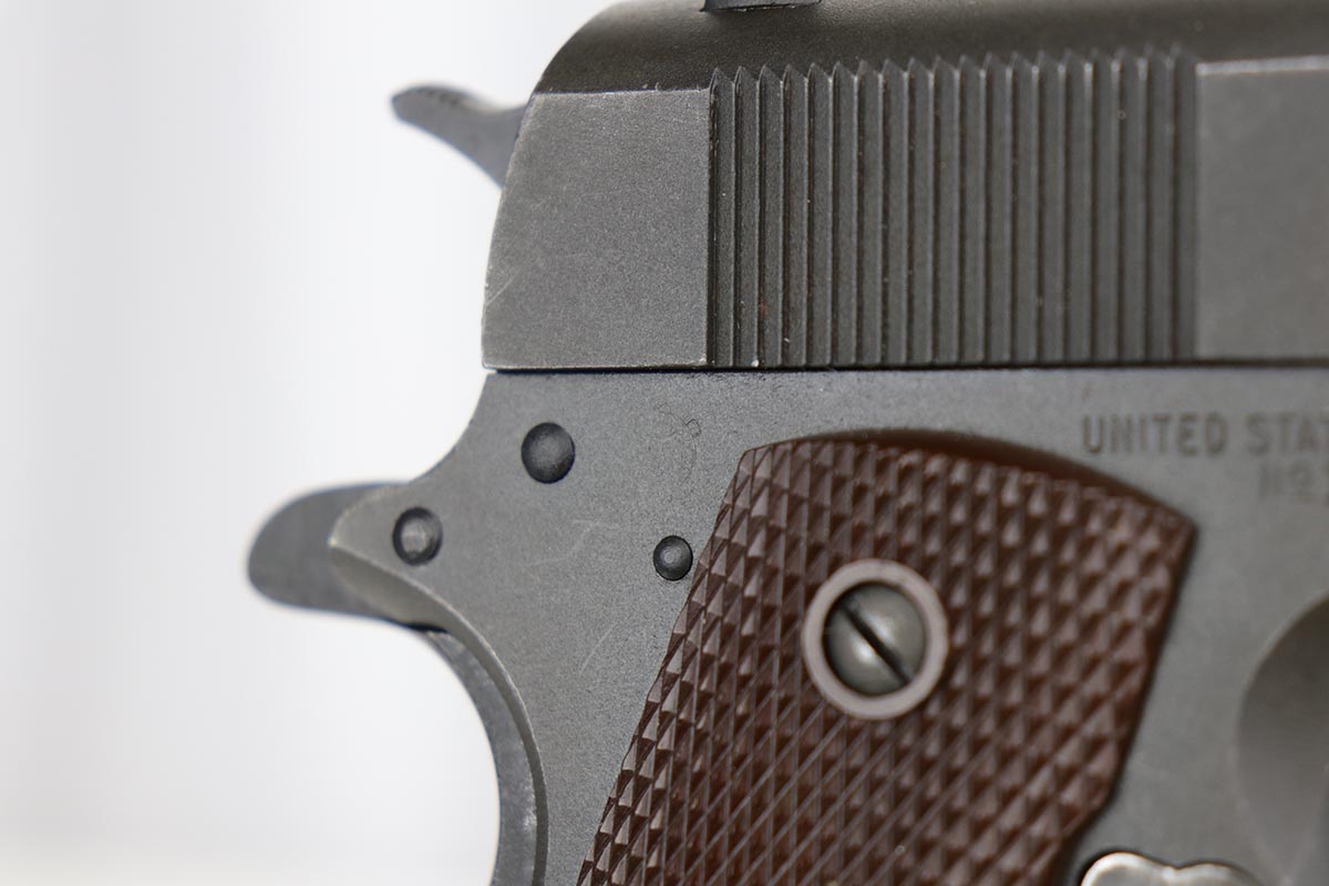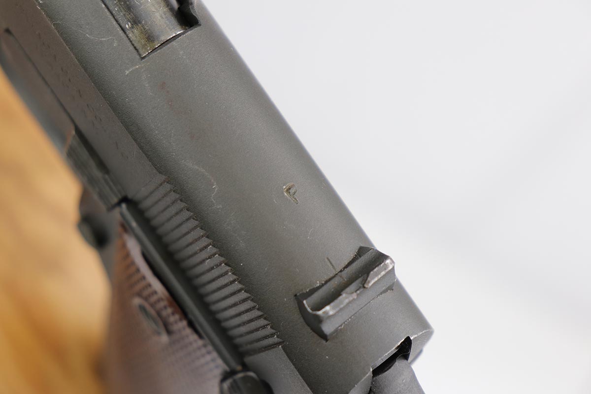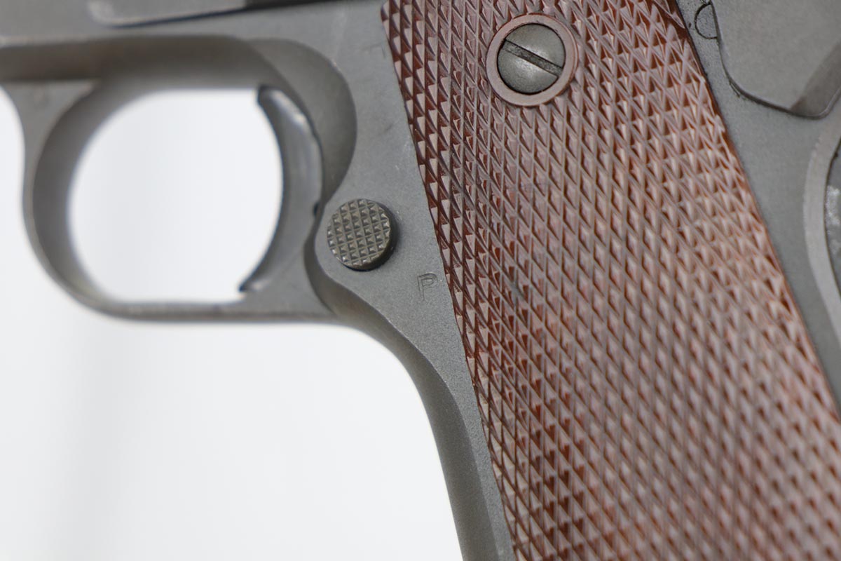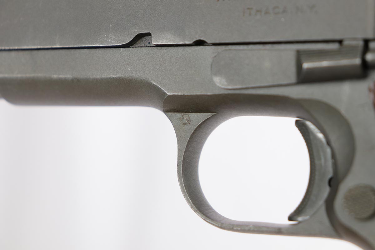 2/11/20 – This is an original and near-mint Ithaca 1911A1 from 1944. There is a hint of muzzle wear on the left side of the slide, and very slight edge wear on the top of the slide. Proper FJA inspection mark and P on slide and frame. Harold Haws inspector mark on left side of trigger guard. Proper HS barrel with excellent bore. Grips are in similar condition. ‘L’ marked magazine.