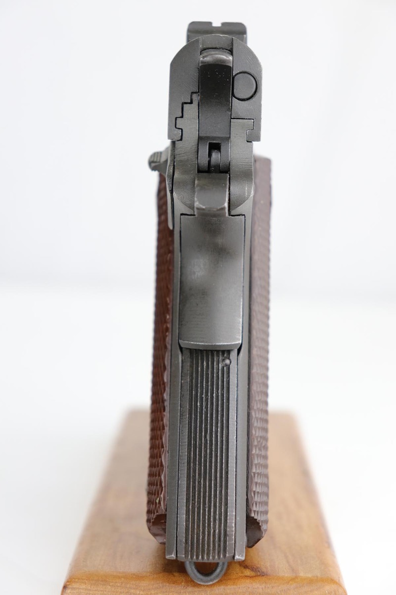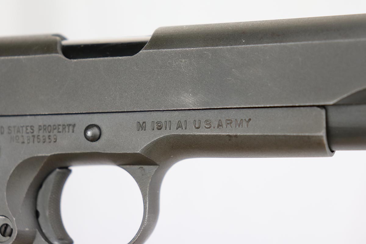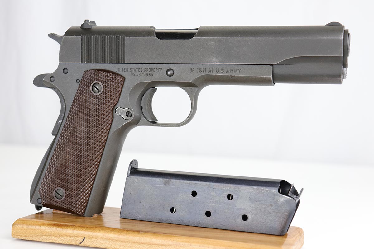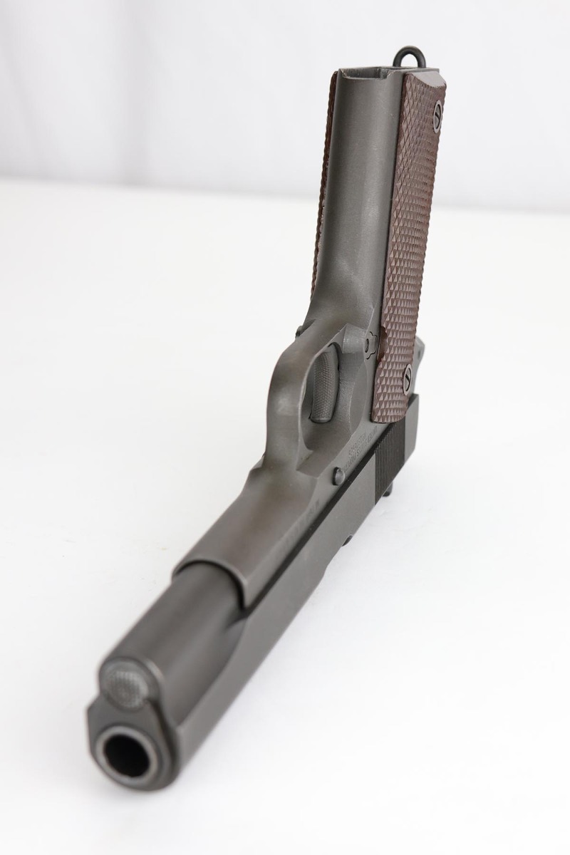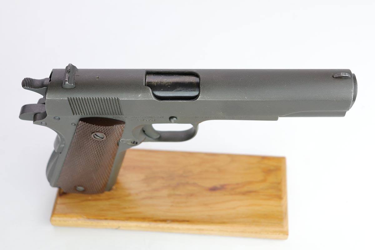 2/11/20 – This is an original and near-mint Ithaca 1911A1 from 1944. There is a hint of muzzle wear on the left side of the slide, and very slight edge wear on the top of the slide. Proper FJA inspection mark and P on slide and frame. Harold Haws inspector mark on left side of trigger guard. Proper HS barrel with excellent bore. Grips are in similar condition. ‘L’ marked magazine.