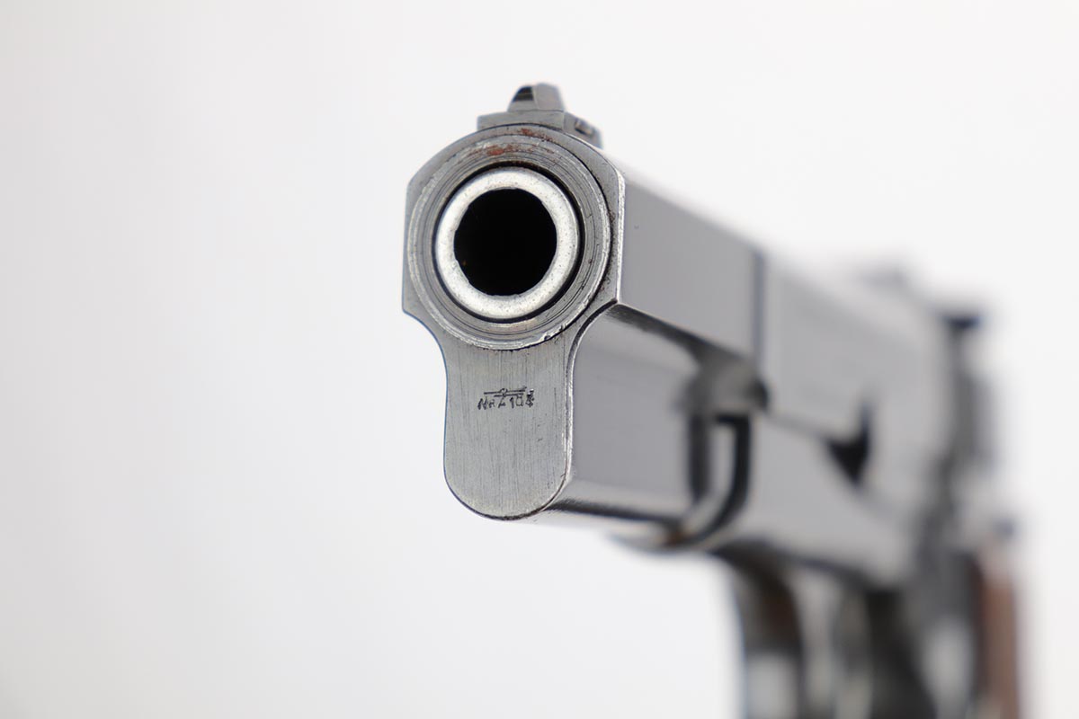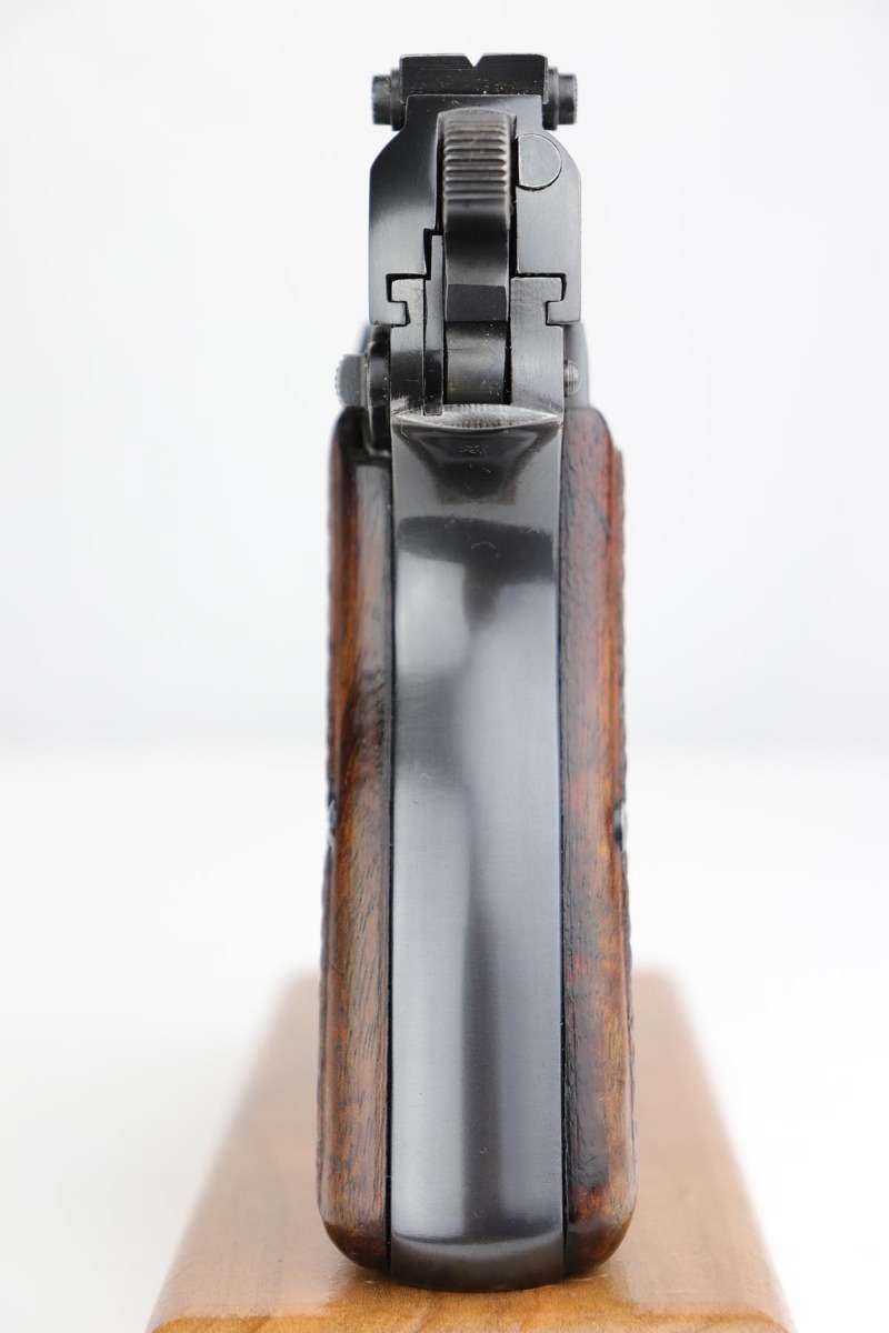 10/25/19 – This is one of the finest examples we’ve encountered of an early Nazi occupation FN Browning Hi Power with desirable tangent sight. The bluing rates at 99% with hardly a hint of edge wear on the high edges. Frame and slide have WaA103 proofs. Terrific grips and bore. Magazine is later variant and is unmarked.