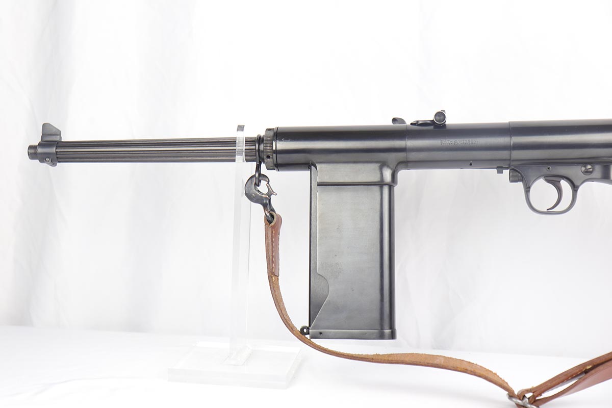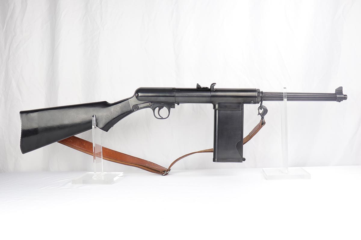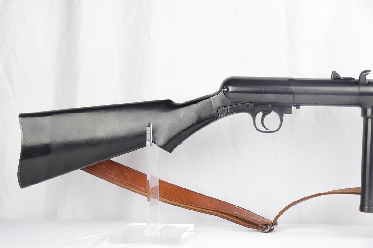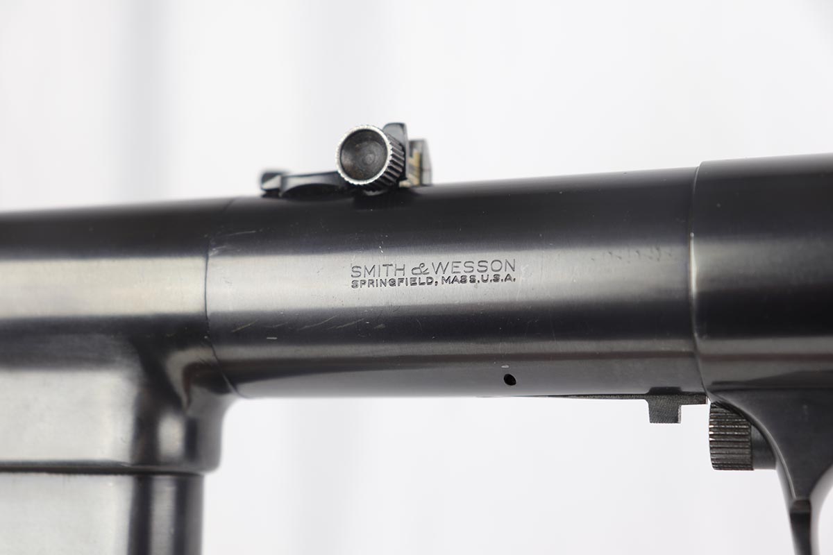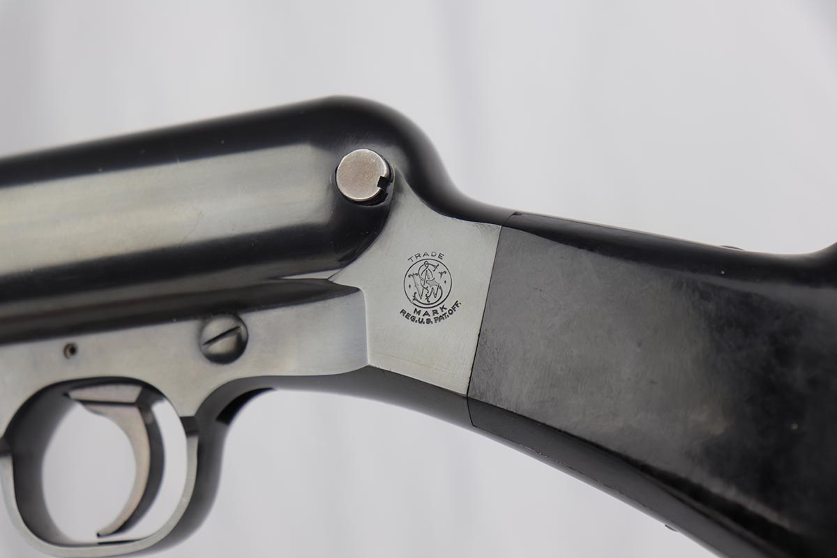 In early 1939 the British government asked Smith & Wesson to design a light rifle firing the 9×19mm Parabellum cartridge for military use. The British government advanced one million dollars toward production of the design following receipt of prototypes. Testing at the Royal Small Arms Factory revealed the rifle had been designed for cartridges as loaded by United States civilian cartridge companies, and the higher pressure United Kingdom military loads caused broken receivers after as few as 1,000 rounds. The British government required redesign so rifles would withstand firing 5,000 rounds without failure. The receiver was strengthened with an external sleeve to meet that requirement. Rifles with the strengthened receiver were designated Mark II and rifles with original receivers were subsequently referred to as Mark I. This rifle is one of the original Mark I examples in exquisite, original condition. The British government cancelled the production contract after receiving 60 prototypes and 950 rifles. Approximately 750 were Mark I rifles, and about 200 were the stronger Mark II design. The rifles were not issued to the armed forces and most were cut in half and dumped at sea when the second world war ended. Five were saved for display in museums including the Tower of London. Smith & Wesson continued production with serial numbers as high as 2200 and the rifle was tested by the United States Army at Aberdeen Proving Ground. The Army rejected the design because the rifle was chambered for what was then a non-standard cartridge for the United States military. There was some discussion about redesign to permit full-automatic fire, but production was halted after a total of 1,227 rifles had been manufactured. The short-barreled weapons were considered unsuitable for sale to civilians under the National Firearms Act, so an inventory of 217 remained at the Smith & Wesson factory until a dealer negotiated Curio and Relic Firearms status with the Bureau of Alcohol, Tobacco, Firearms and Explosives in 1975. Firearms collectors subsequently purchased 137 Mark I and 80 Mark II rifles.