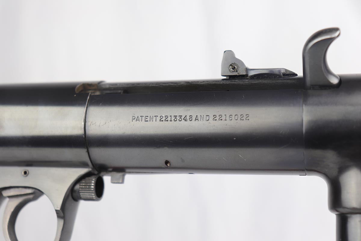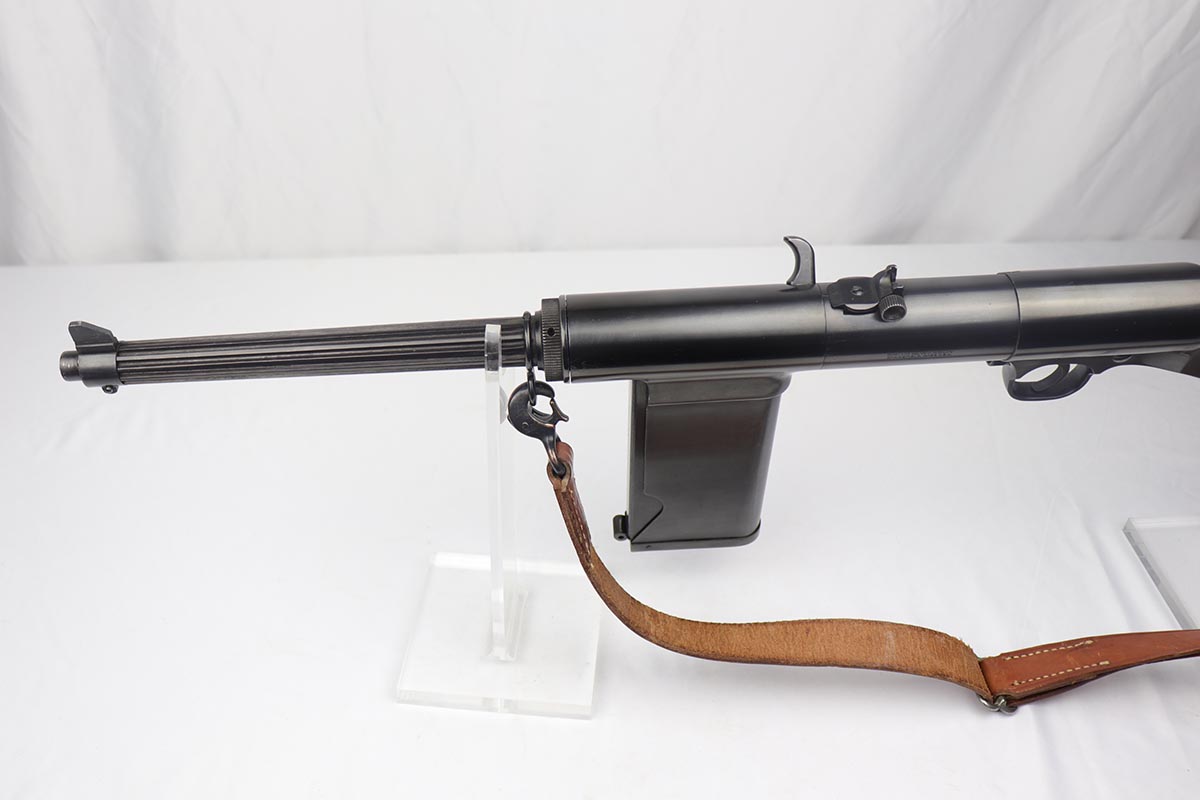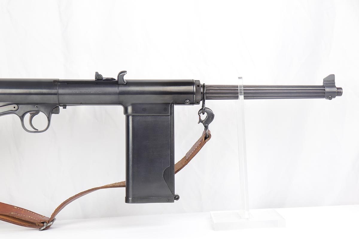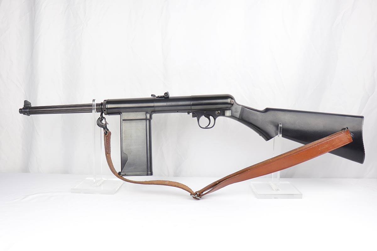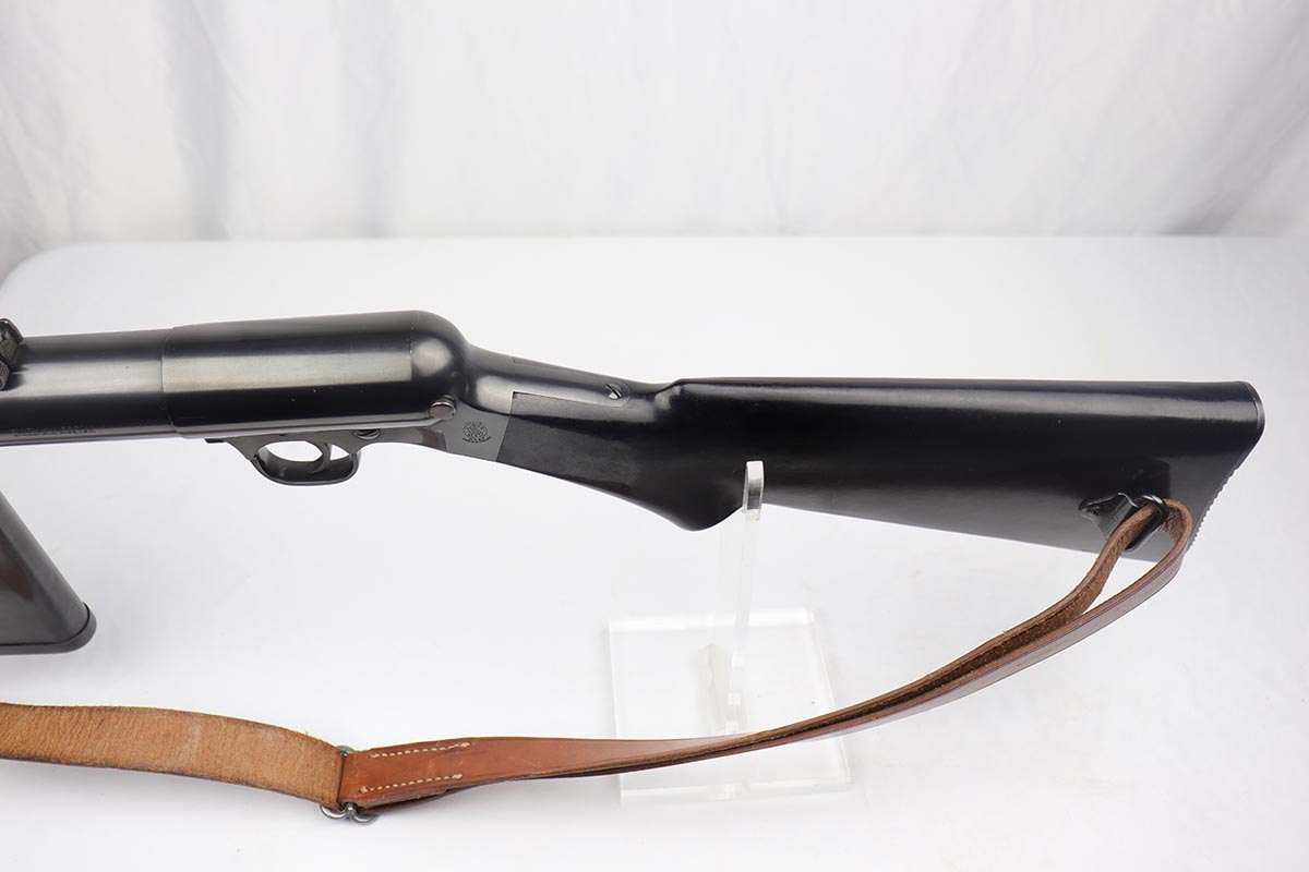 In early 1939 the British government asked Smith & Wesson to design a light rifle firing the 9×19mm Parabellum cartridge for military use. The British government advanced one million dollars toward production of the design following receipt of prototypes. Testing at the Royal Small Arms Factory revealed the rifle had been designed for cartridges as loaded by United States civilian cartridge companies, and the higher pressure United Kingdom military loads caused broken receivers after as few as 1,000 rounds. The British government required redesign so rifles would withstand firing 5,000 rounds without failure. The receiver was strengthened with an external sleeve to meet that requirement. Rifles with the strengthened receiver were designated Mark II and rifles with original receivers were subsequently referred to as Mark I. This rifle is one of the original Mark I examples in exquisite, original condition. The British government cancelled the production contract after receiving 60 prototypes and 950 rifles. Approximately 750 were Mark I rifles, and about 200 were the stronger Mark II design. The rifles were not issued to the armed forces and most were cut in half and dumped at sea when the second world war ended. Five were saved for display in museums including the Tower of London. Smith & Wesson continued production with serial numbers as high as 2200 and the rifle was tested by the United States Army at Aberdeen Proving Ground. The Army rejected the design because the rifle was chambered for what was then a non-standard cartridge for the United States military. There was some discussion about redesign to permit full-automatic fire, but production was halted after a total of 1,227 rifles had been manufactured. The short-barreled weapons were considered unsuitable for sale to civilians under the National Firearms Act, so an inventory of 217 remained at the Smith & Wesson factory until a dealer negotiated Curio and Relic Firearms status with the Bureau of Alcohol, Tobacco, Firearms and Explosives in 1975. Firearms collectors subsequently purchased 137 Mark I and 80 Mark II rifles.