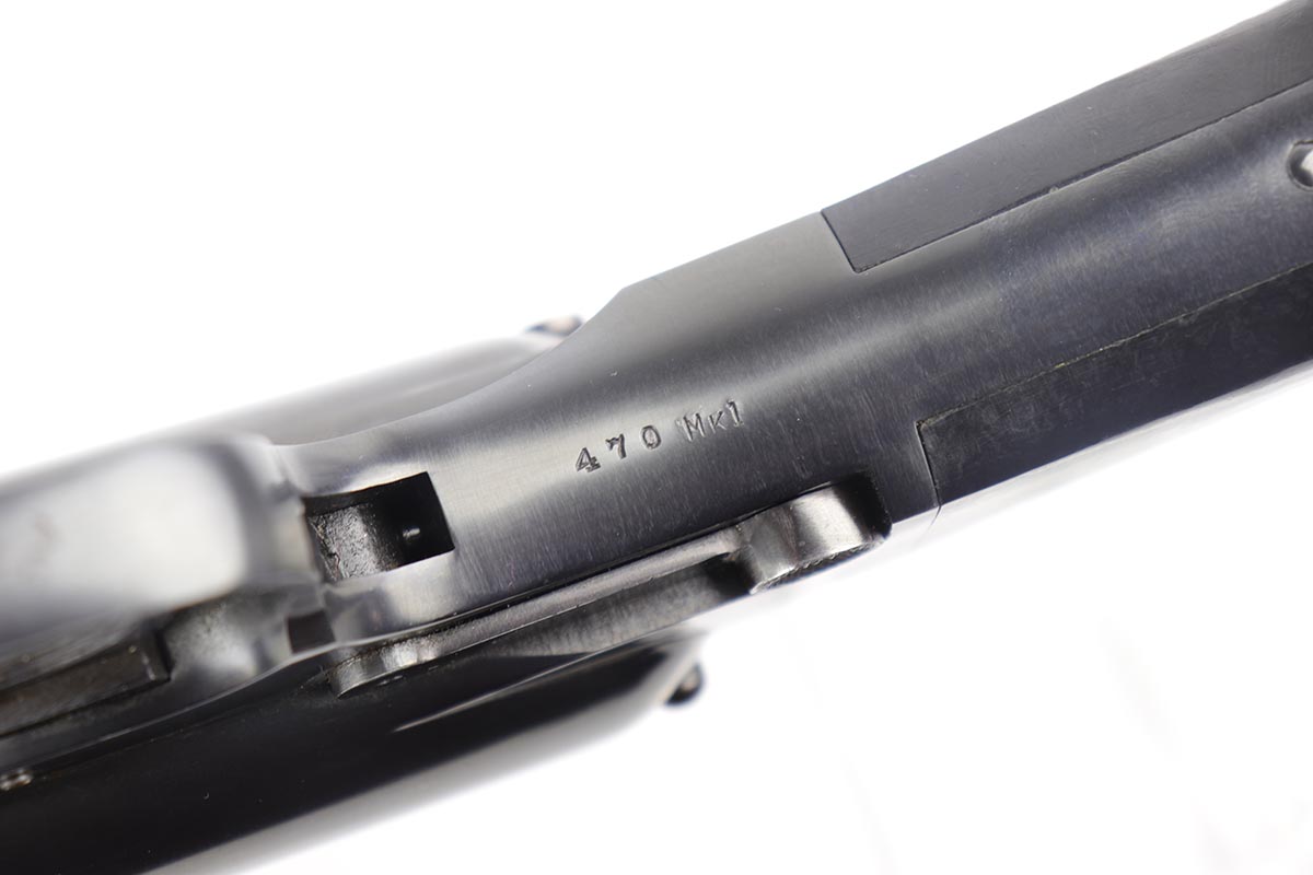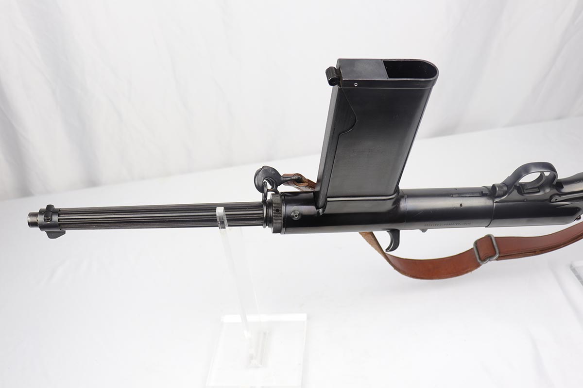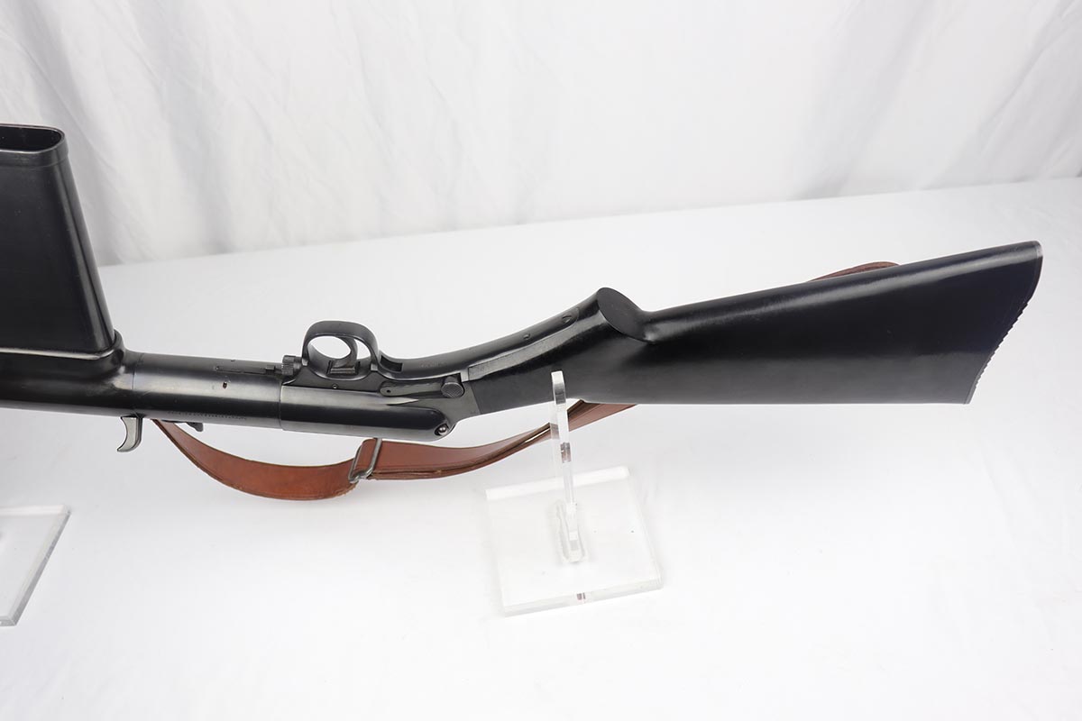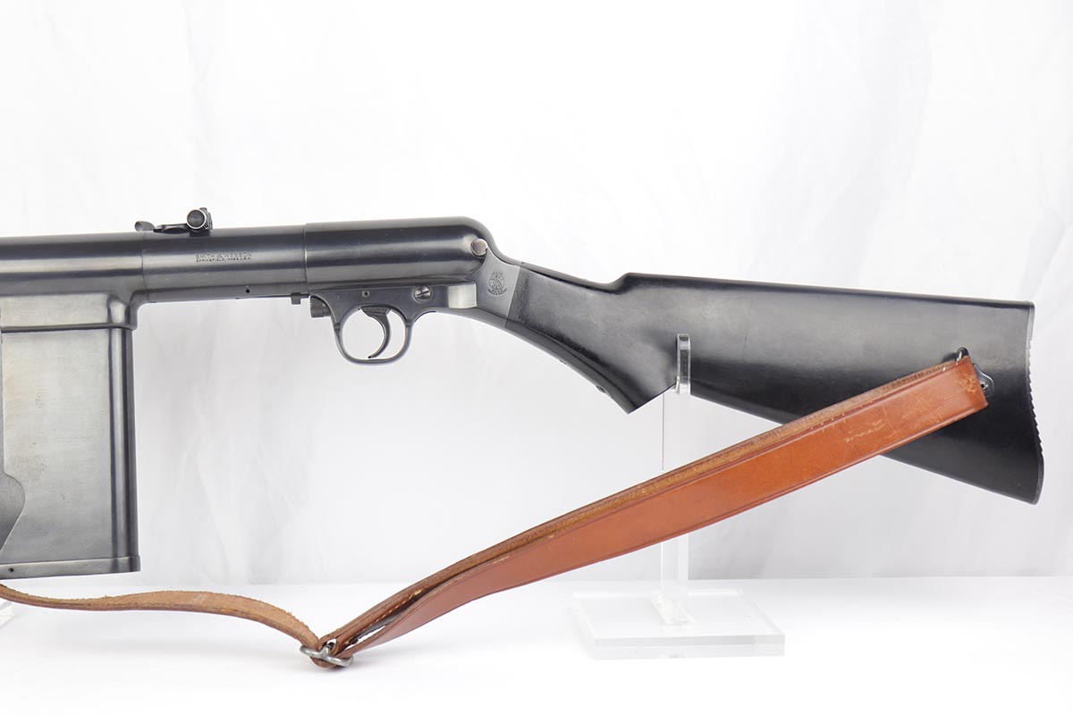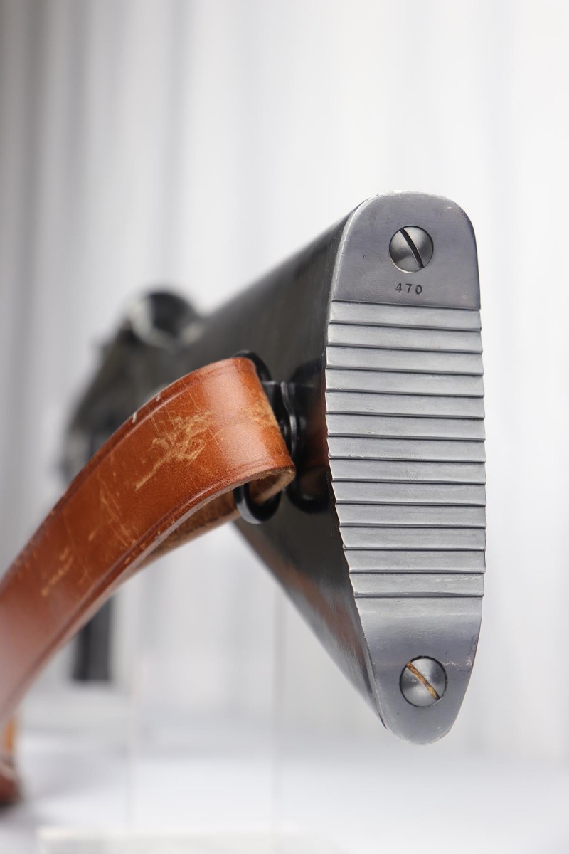 In early 1939 the British government asked Smith & Wesson to design a light rifle firing the 9×19mm Parabellum cartridge for military use. The British government advanced one million dollars toward production of the design following receipt of prototypes. Testing at the Royal Small Arms Factory revealed the rifle had been designed for cartridges as loaded by United States civilian cartridge companies, and the higher pressure United Kingdom military loads caused broken receivers after as few as 1,000 rounds. The British government required redesign so rifles would withstand firing 5,000 rounds without failure. The receiver was strengthened with an external sleeve to meet that requirement. Rifles with the strengthened receiver were designated Mark II and rifles with original receivers were subsequently referred to as Mark I. This rifle is one of the original Mark I examples in exquisite, original condition. The British government cancelled the production contract after receiving 60 prototypes and 950 rifles. Approximately 750 were Mark I rifles, and about 200 were the stronger Mark II design. The rifles were not issued to the armed forces and most were cut in half and dumped at sea when the second world war ended. Five were saved for display in museums including the Tower of London. Smith & Wesson continued production with serial numbers as high as 2200 and the rifle was tested by the United States Army at Aberdeen Proving Ground. The Army rejected the design because the rifle was chambered for what was then a non-standard cartridge for the United States military. There was some discussion about redesign to permit full-automatic fire, but production was halted after a total of 1,227 rifles had been manufactured. The short-barreled weapons were considered unsuitable for sale to civilians under the National Firearms Act, so an inventory of 217 remained at the Smith & Wesson factory until a dealer negotiated Curio and Relic Firearms status with the Bureau of Alcohol, Tobacco, Firearms and Explosives in 1975. Firearms collectors subsequently purchased 137 Mark I and 80 Mark II rifles.
