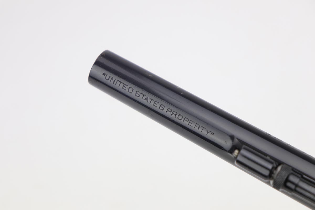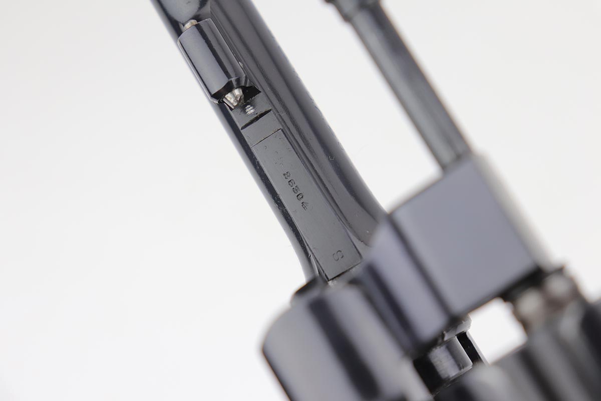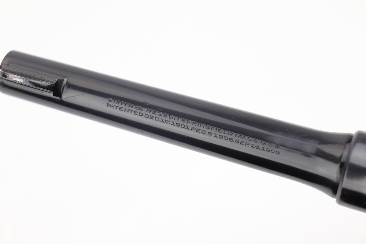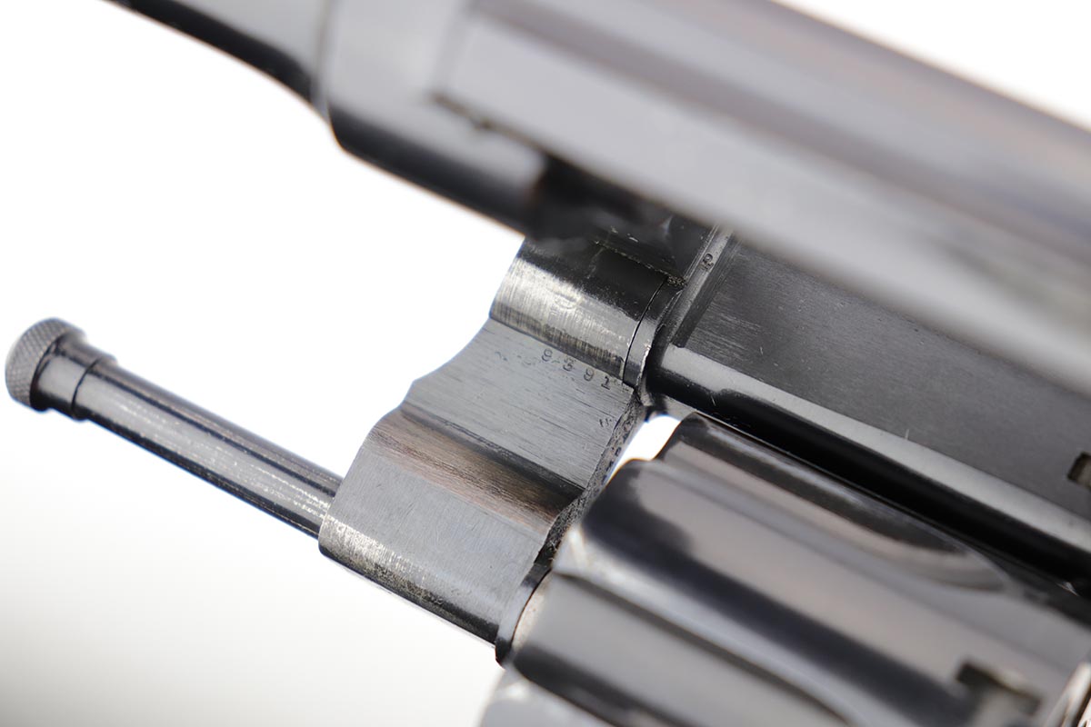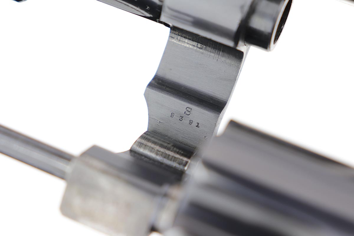 10/17/22 – This is an exceptional military Smith & Wesson M1917 revolver, perhaps the finest we’ve offered. The polished blue rates at ~98% with minor barrel and cylinder wear, but very few notable flaws. The frame has sharp inspector mark and the barrel is stamped UNITED STATES PROPERTY. Beautiful case hardening is present on the hammer and trigger. Mint bore and grips. The right panel is correctly hand numbered and matching to the gun.