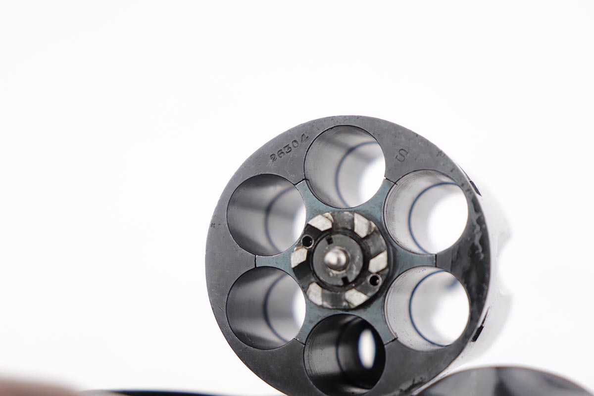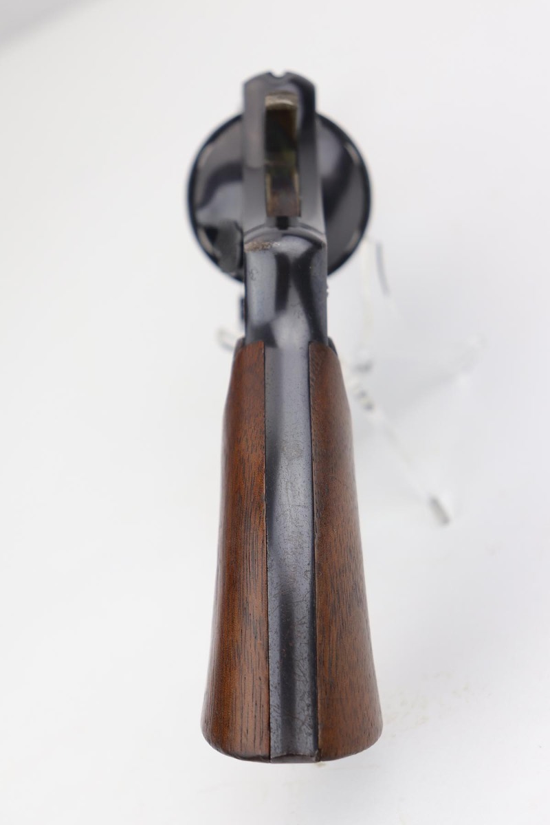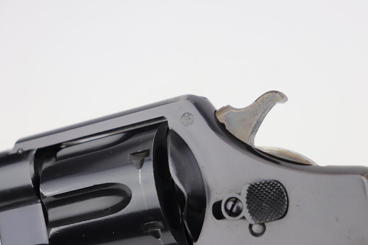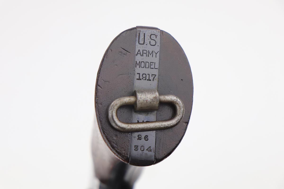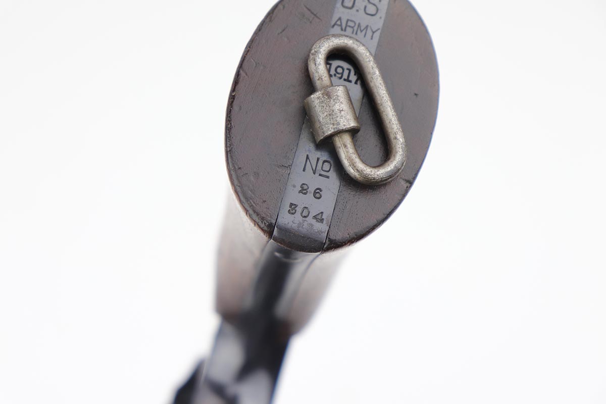 10/17/22 – This is an exceptional military Smith & Wesson M1917 revolver, perhaps the finest we’ve offered. The polished blue rates at ~98% with minor barrel and cylinder wear, but very few notable flaws. The frame has sharp inspector mark and the barrel is stamped UNITED STATES PROPERTY. Beautiful case hardening is present on the hammer and trigger. Mint bore and grips. The right panel is correctly hand numbered and matching to the gun.
