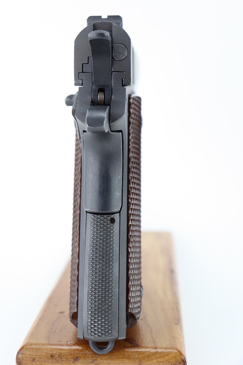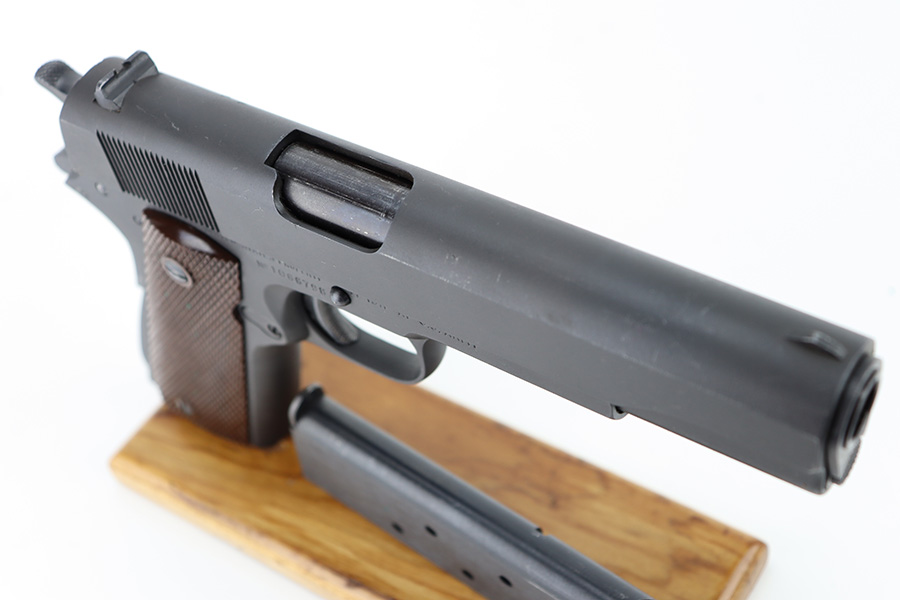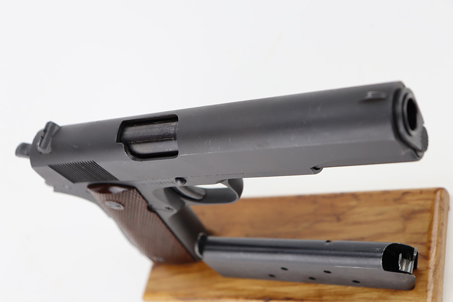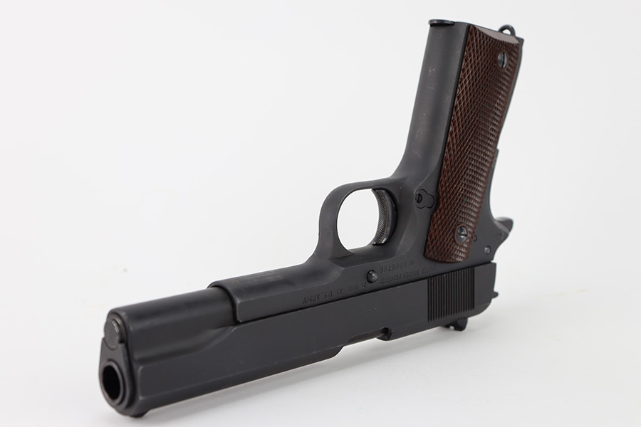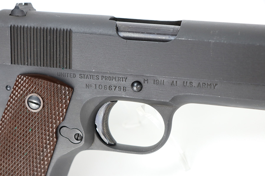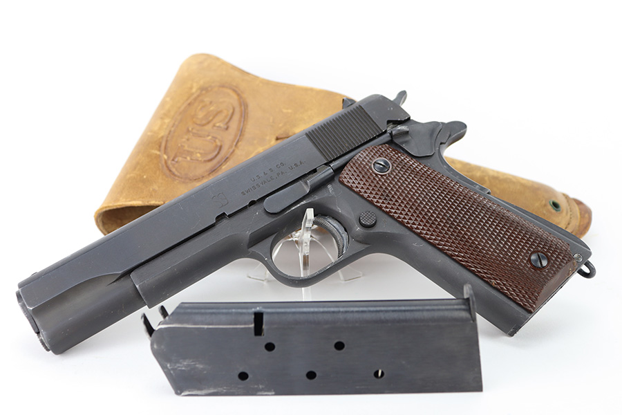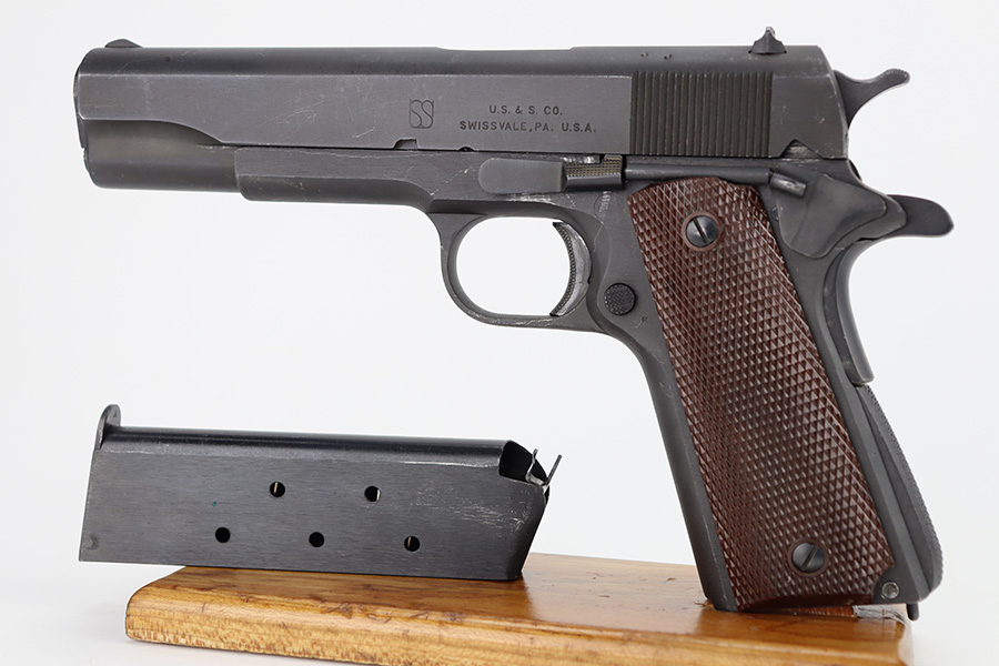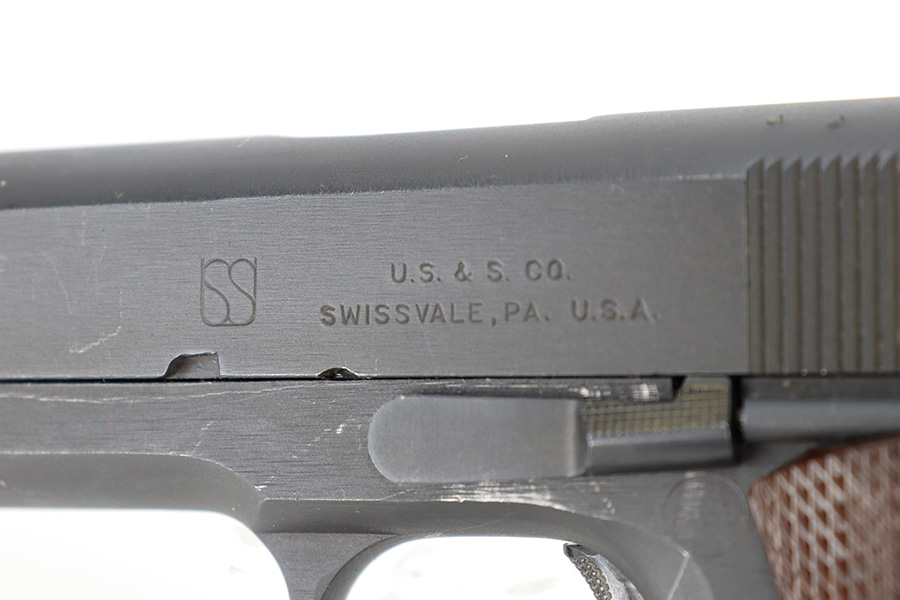 The Union Switch & Signal company of Swissvale Pennsylvania, primarily made railroad signaling equipment but received a contract on May 5, 1942 for the manufacture of M1911A1 pistols. The first pistols were accepted by Ordnance inspectors in January 1943, but the company received word that their contract would be canceled. Within a month U.S.&S. had signed a contract to supply carbine parts. On March 8, 1943 the company was officially notified that their contract had been cut back from 200,000 pistols to 30,000 pistols. However on June 26th, when the contract was nearly complete, and many of the workers had been transferred to Carbine operations, the company received a letter of intent to purchase an additional 25,000 pistols. The last of the pistols was shipped on November 27, 1943. 55,000 Union Switch and Signal pistols were delivered serial numbered from 1041405 to 1096404. U.S.&S. pistols are the second rarest of the M1911A1s (55,000 produced), only the Singer is rarer (500 produced). None of the Union Switch & Signal 1911A1s have the crossed cannons ordnance stamp. We are told these were issued to the Army Air Corps during the war.