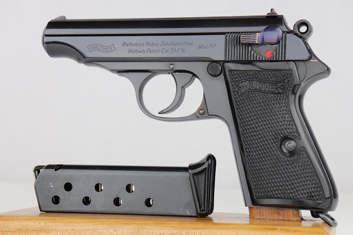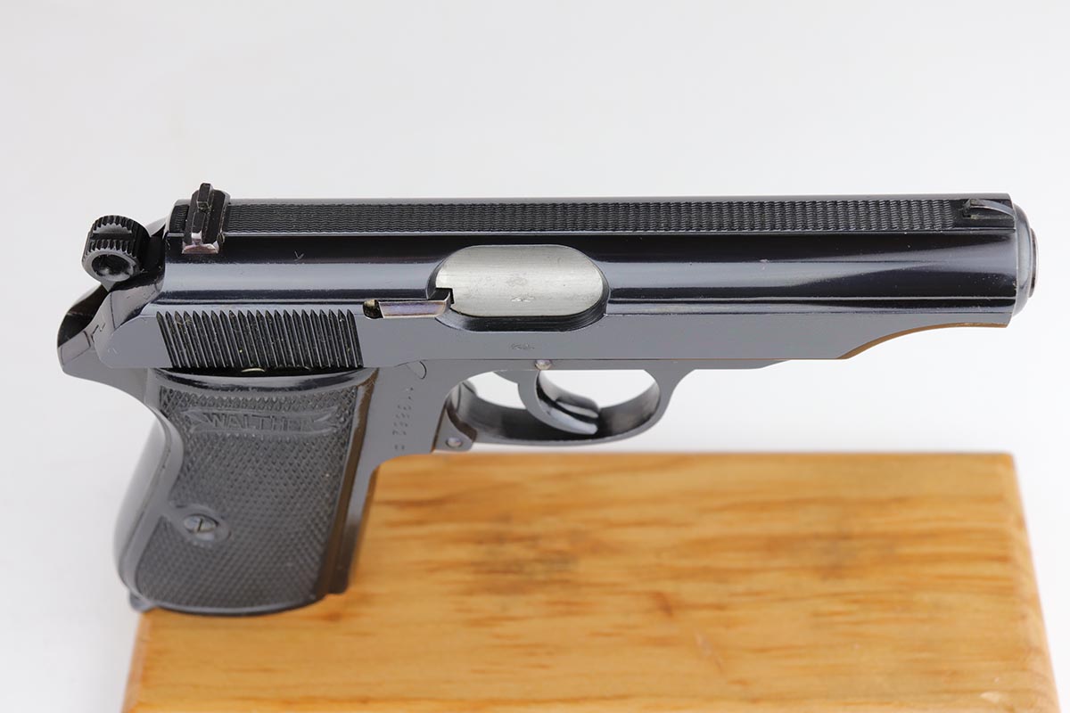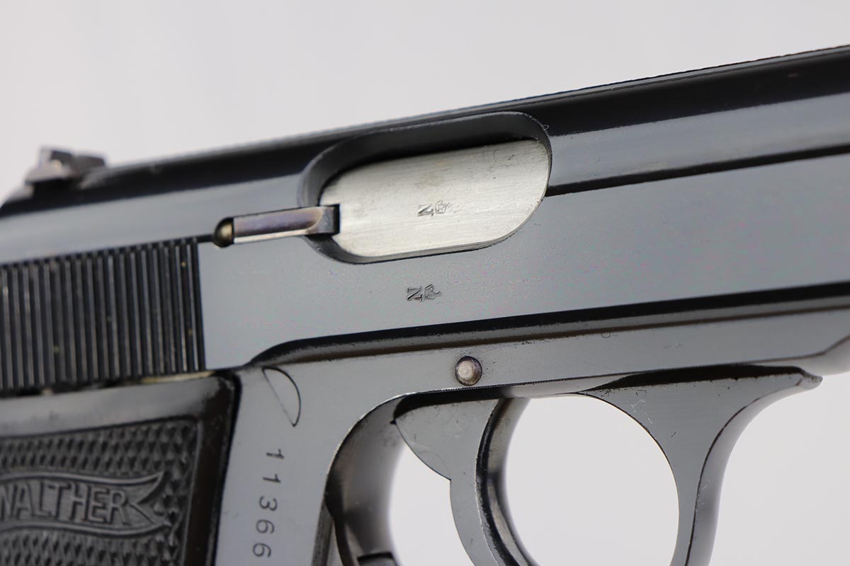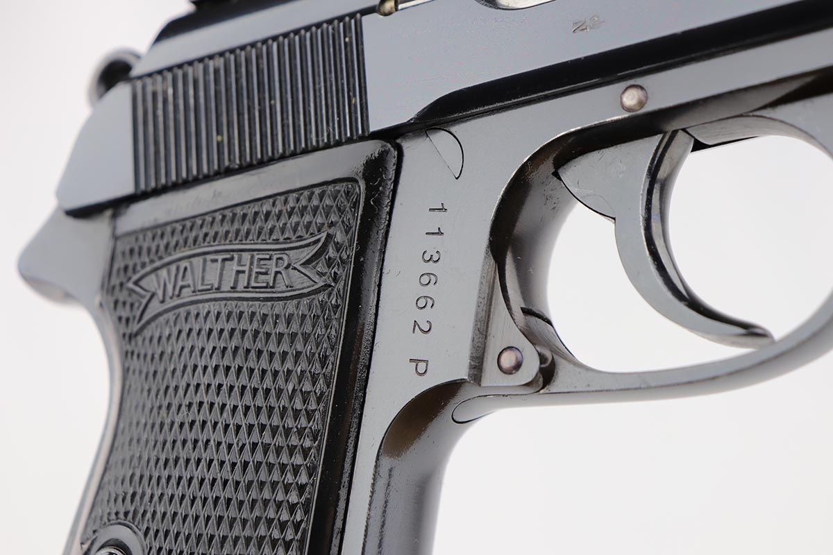 7/16/19 – This is an exquisite and all original Walther PP that was made in 1938 for the commercial market. The high-polish blue rates at 98-99% with just a hint of muzzle wear, and a couple small scratches on the front strap. Mint bore and excellent grips. Lanyard ring on frame. Excellent finger extension magazine.