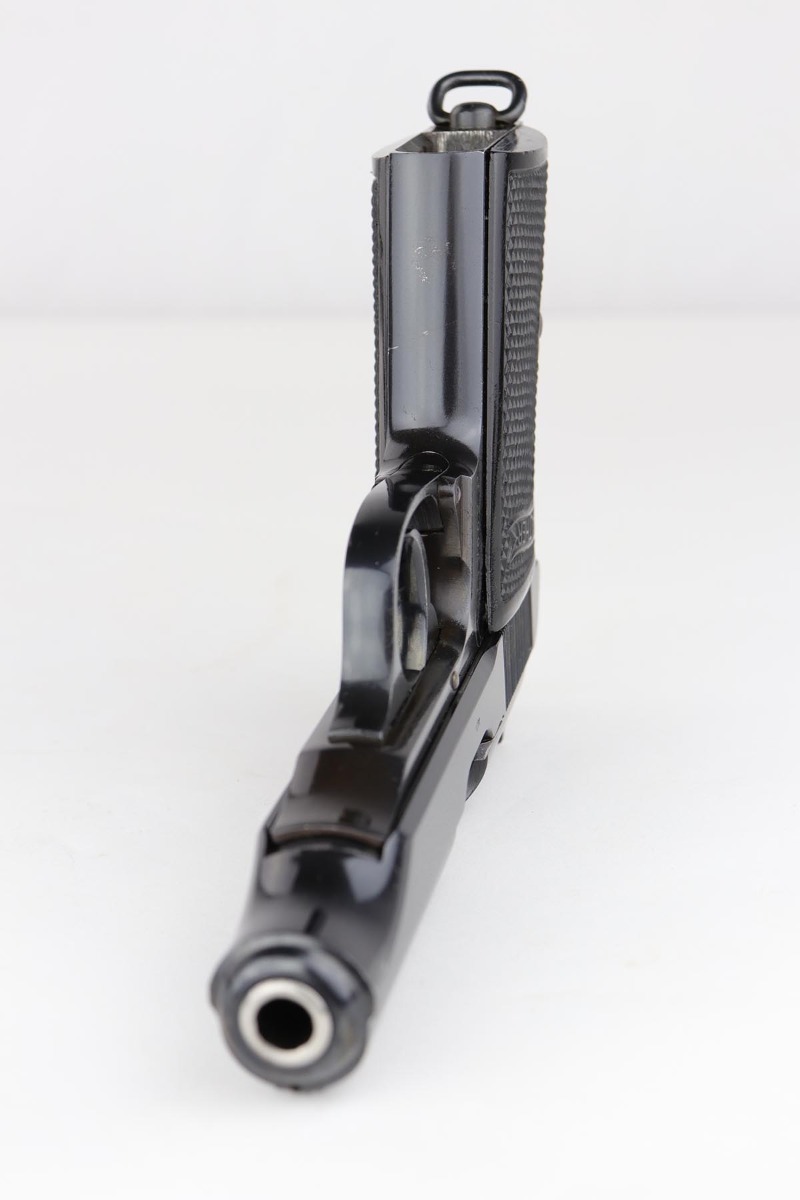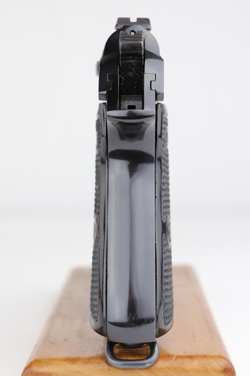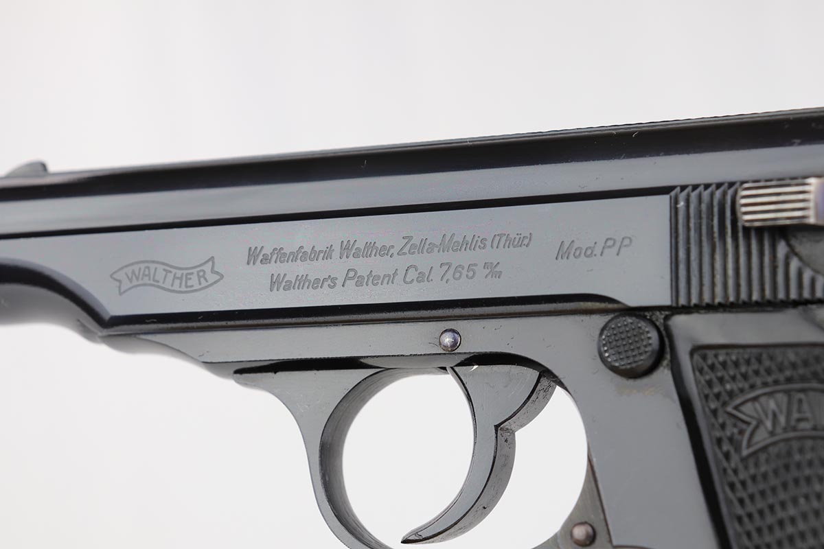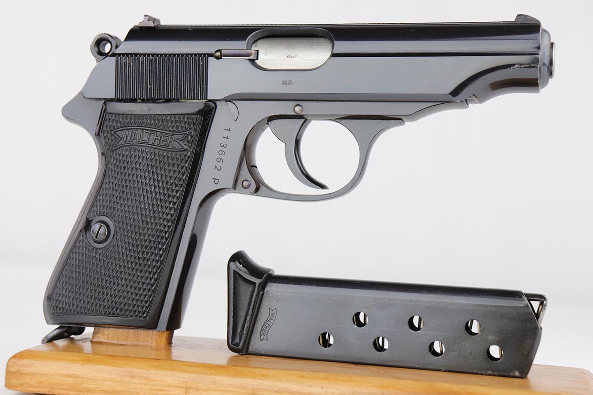 7/16/19 – This is an exquisite and all original Walther PP that was made in 1938 for the commercial market. The high-polish blue rates at 98-99% with just a hint of muzzle wear, and a couple small scratches on the front strap. Mint bore and excellent grips. Lanyard ring on frame. Excellent finger extension magazine.