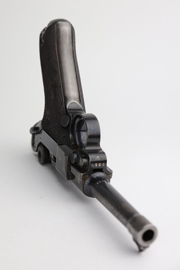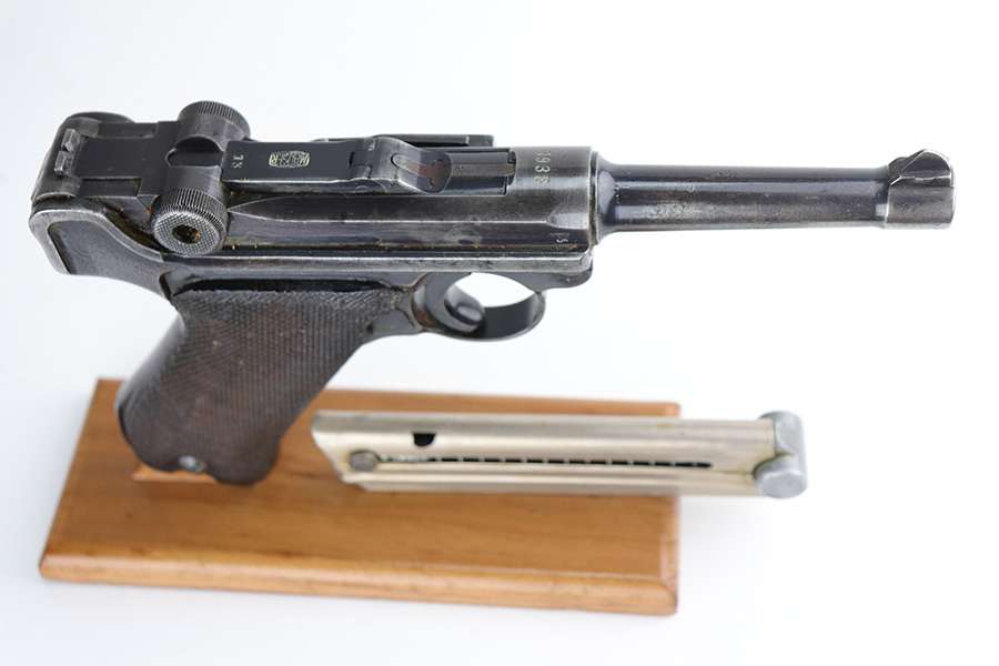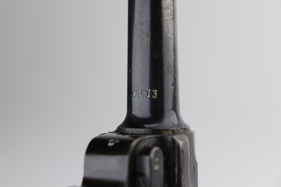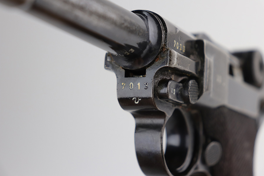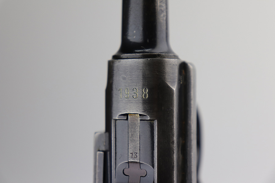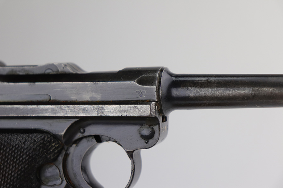 9/1/21 – This is an exceptionally rare Mauser Banner Luger issued to the Nazi Police force in 1938. It is all matching and has a police “Eagle K” marking on the right side of the slide. They only made 275 of this configuration! It comes with nice wood grips that do not match – they are minor dings on both sides. Also comes with a mismatched magazine. The gun has retained about 50% of its original finish. There is spotty wear and spotty oxidation throughout. Brown patina on the back strap. Areas of pin-pricking here and there most noticeable on the barrel. The rifling in the bore is a bit worn with pin-pricking throughout.
