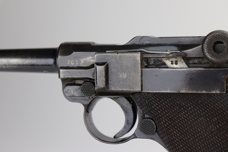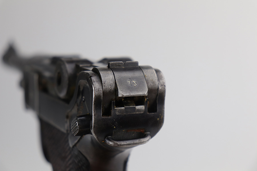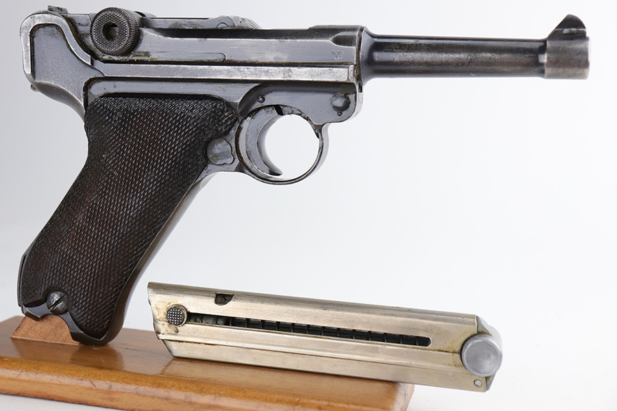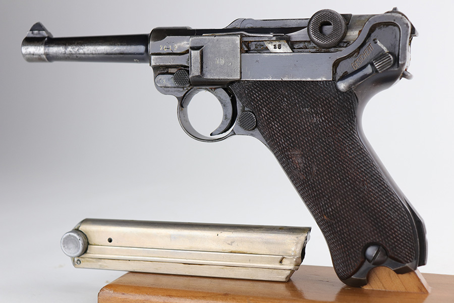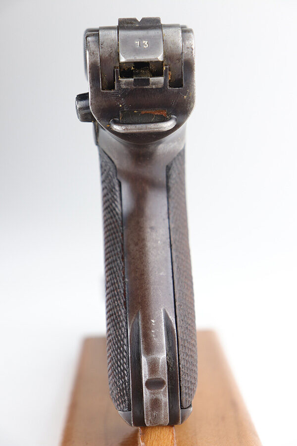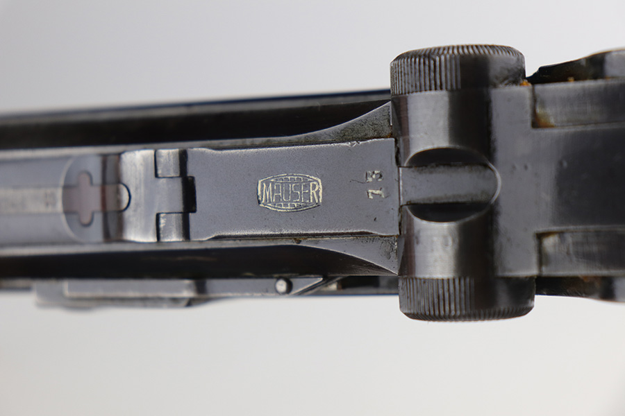 9/1/21 – This is an exceptionally rare Mauser Banner Luger issued to the Nazi Police force in 1938. It is all matching and has a police “Eagle K” marking on the right side of the slide. They only made 275 of this configuration! It comes with nice wood grips that do not match – they are minor dings on both sides. Also comes with a mismatched magazine. The gun has retained about 50% of its original finish. There is spotty wear and spotty oxidation throughout. Brown patina on the back strap. Areas of pin-pricking here and there most noticeable on the barrel. The rifling in the bore is a bit worn with pin-pricking throughout.
