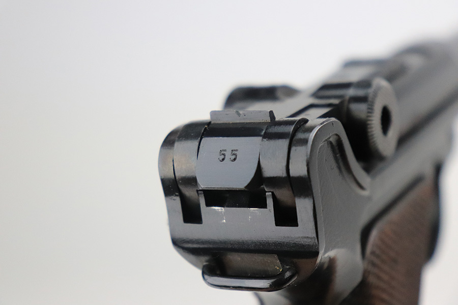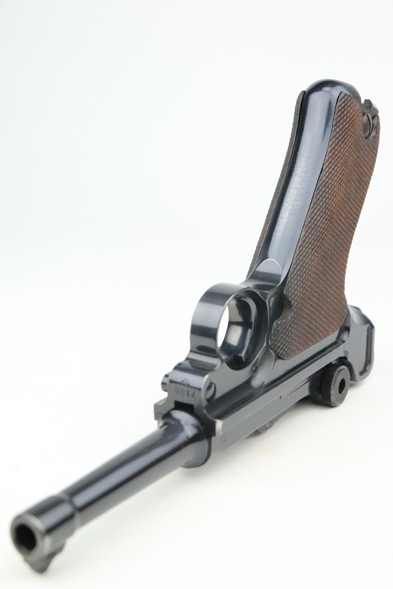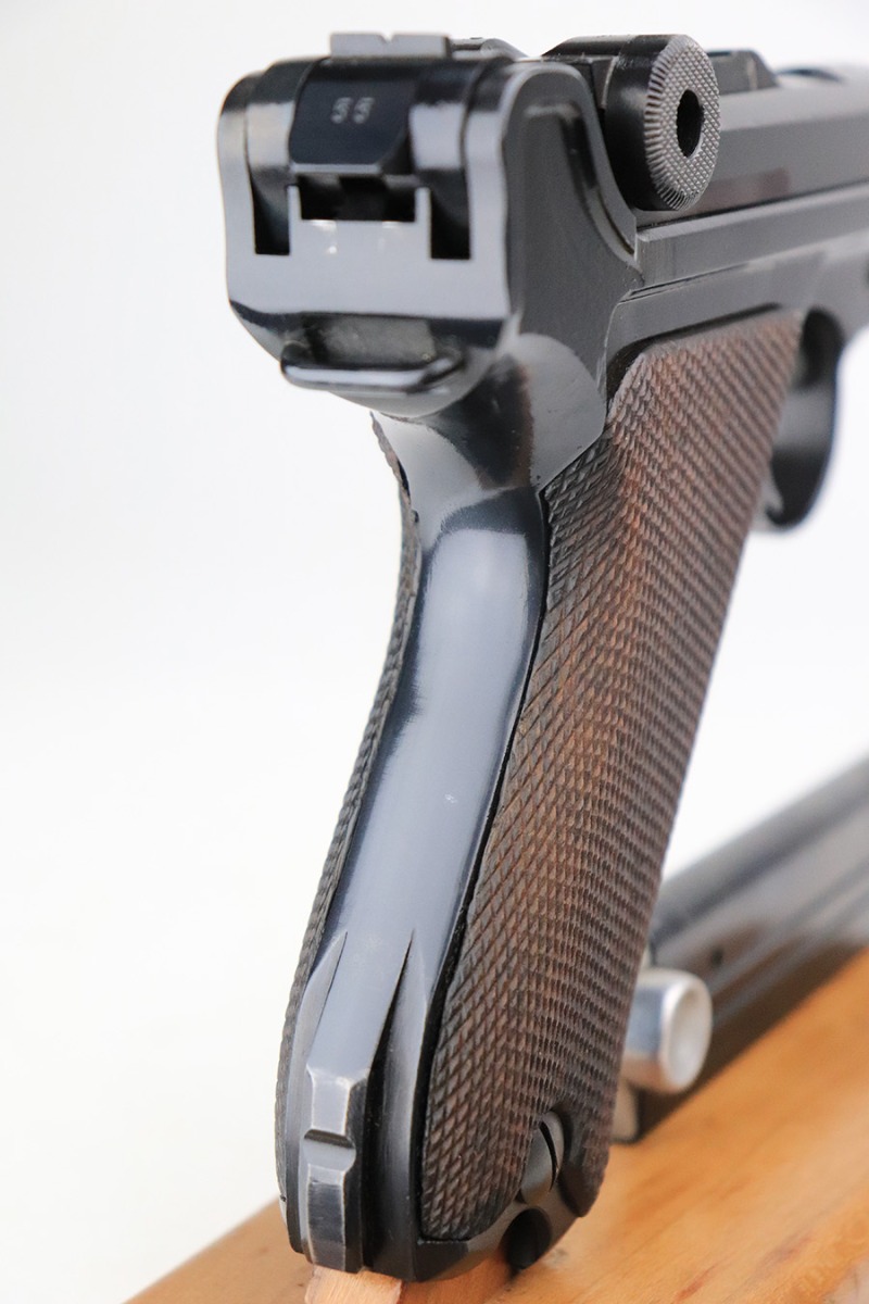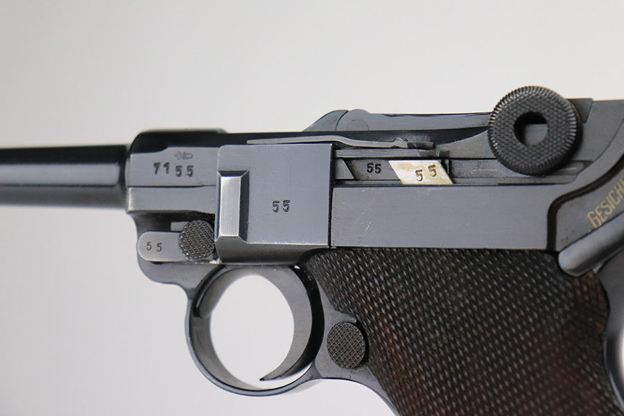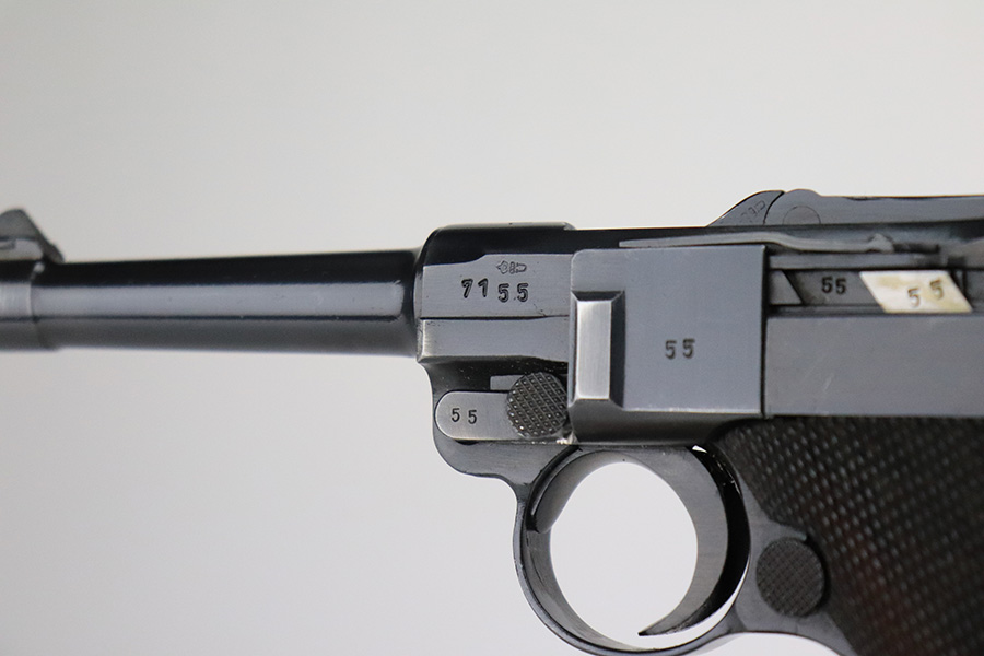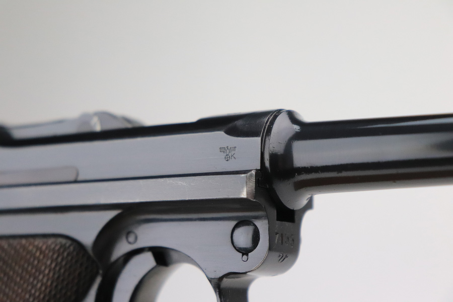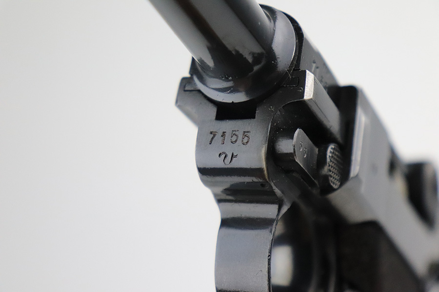 7/26/22 – This is an exceptionally rare Mauser Banner Luger issued to the Nazi Police force in 1938. It is all matching (except for the firing pin) and has a police “Eagle K” marking on the right side of the slide. They only made 275 of this configuration. However, this particular gun has been completely professionally restored and refinished. We do believe the “Eagle K” proof was reapplied, but this gun is in the correct serial range for this variation. It comes with two matching-numbered magazines that we do not believe are original. In any case, there is very little bluing loss with areas of very minor wear around the muzzle and on the side plate. Comes with minty matching-numbered grips. The bore is shiny with great rifling and some very minor pin-pricking around the muzzle end.