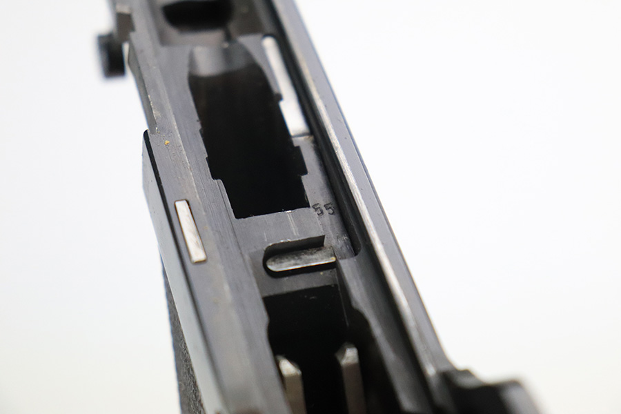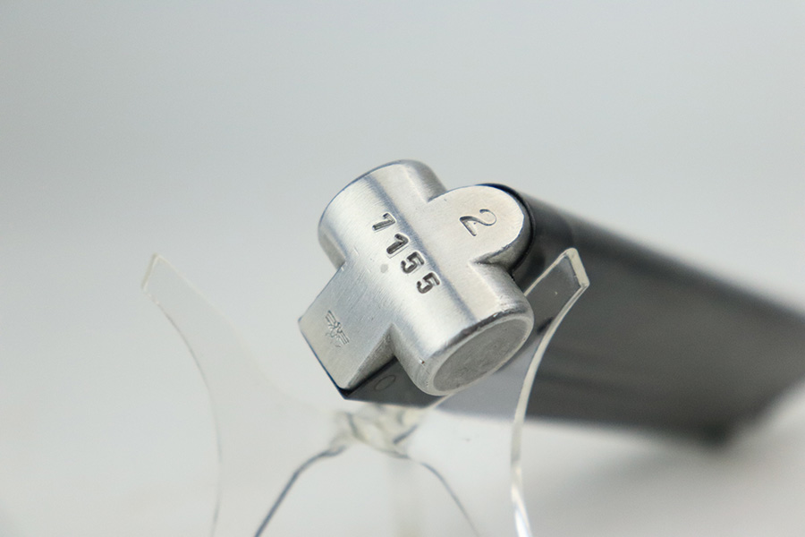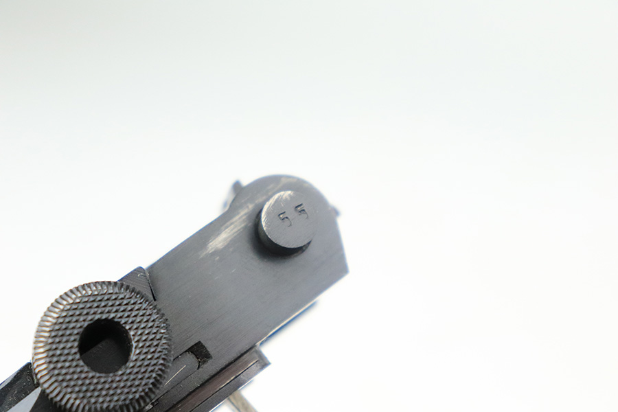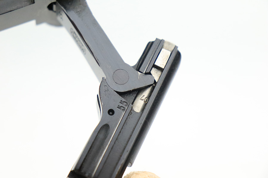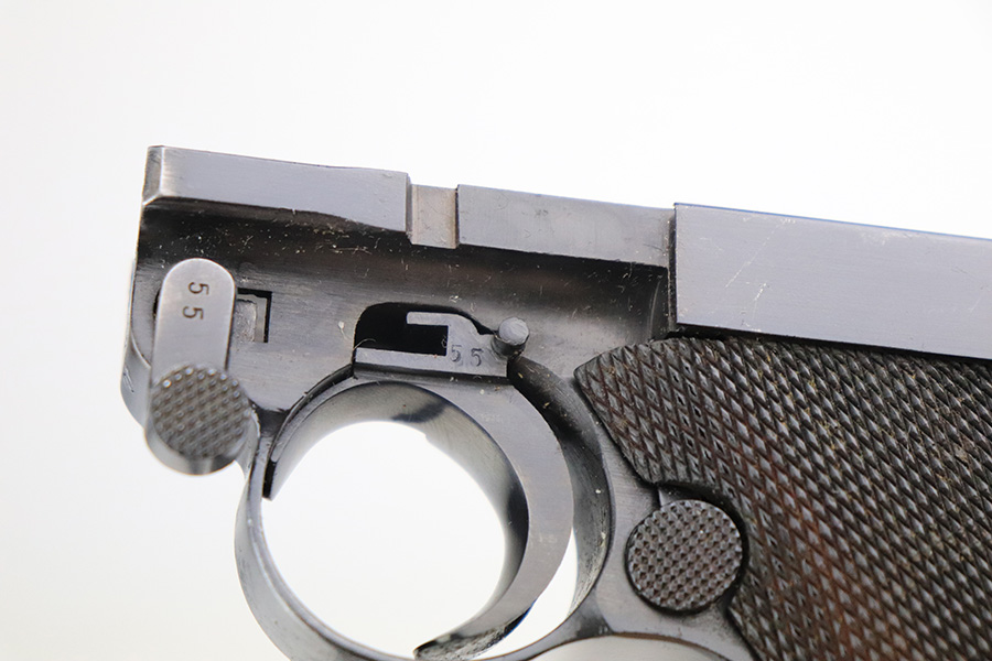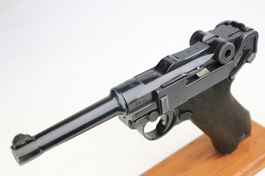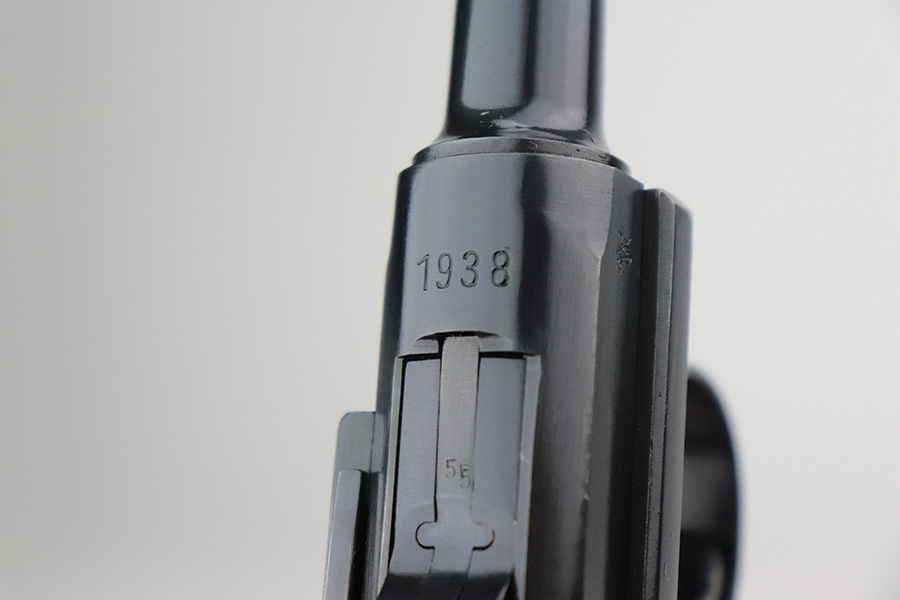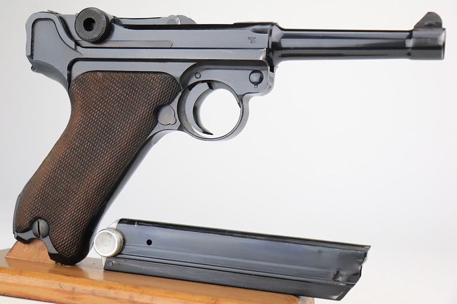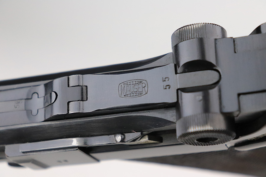 7/26/22 – This is an exceptionally rare Mauser Banner Luger issued to the Nazi Police force in 1938. It is all matching (except for the firing pin) and has a police “Eagle K” marking on the right side of the slide. They only made 275 of this configuration. However, this particular gun has been completely professionally restored and refinished. We do believe the “Eagle K” proof was reapplied, but this gun is in the correct serial range for this variation. It comes with two matching-numbered magazines that we do not believe are original. In any case, there is very little bluing loss with areas of very minor wear around the muzzle and on the side plate. Comes with minty matching-numbered grips. The bore is shiny with great rifling and some very minor pin-pricking around the muzzle end.