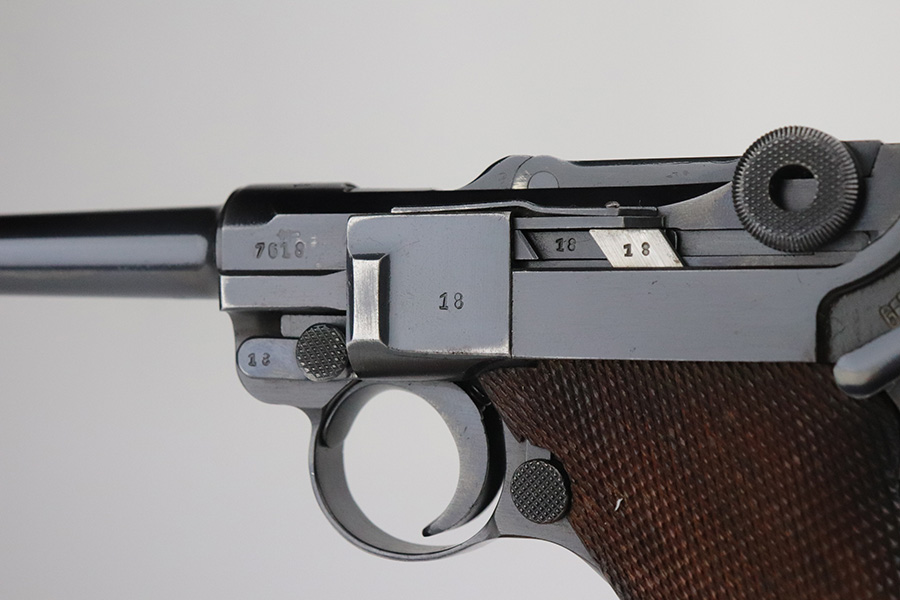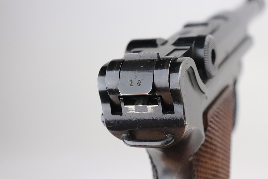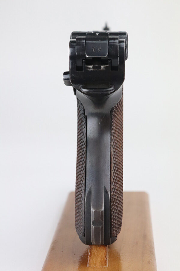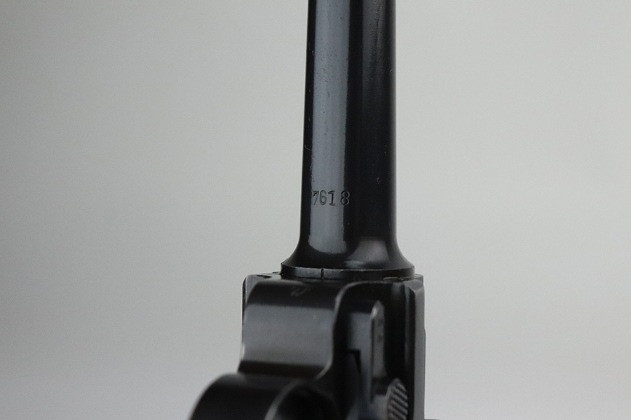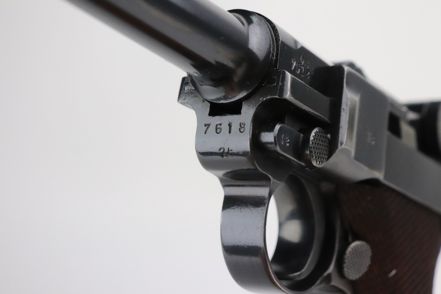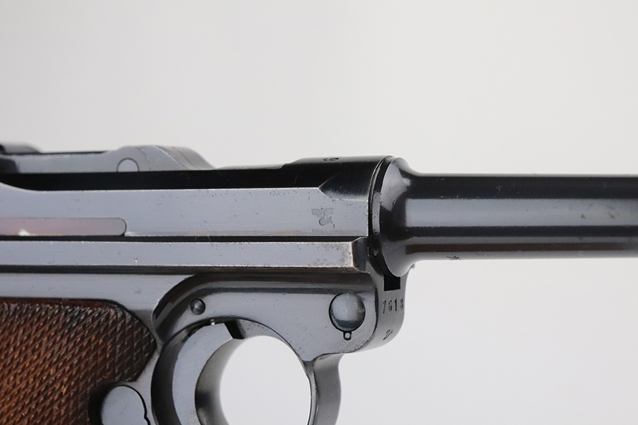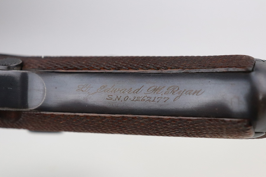 7/27/21 – This is an excellent example of an exceptionally rare Mauser Banner Luger issued to the Nazi police force in 1939. This gun is exceptionally rare as only about 850 guns of this configuration were ever produced. It is all matching, has a police sear safety, and has an “Eagle K” marking on the right side of the slide. It also has a “Lt. Edward M. Ryan SN 0-1862177” custom engraving on the front strap – we assume it is the name of the GI who brought it home. It is in excellent condition, retaining about 97% of its bluing. There is minor wear on the side plate and hints of wear on the side rails. Minor freckling and patina on the straps. It comes with excellent matching grips and an un-numbered “42”-marked armorer’s replacement magazine. The bore has strong rifling with spotty freckling throughout.