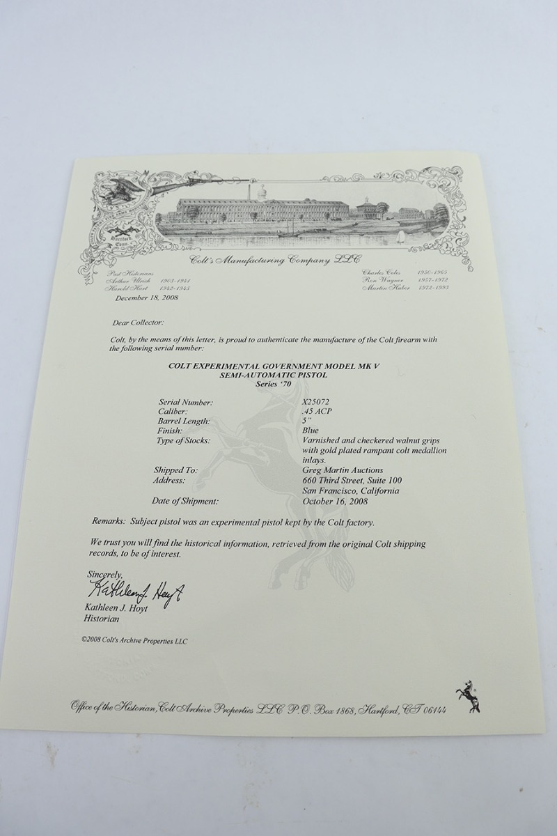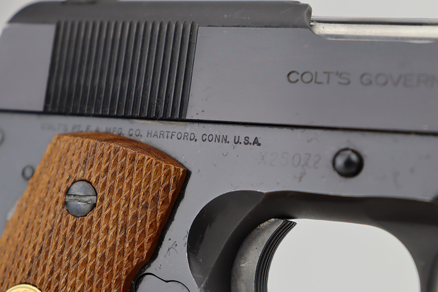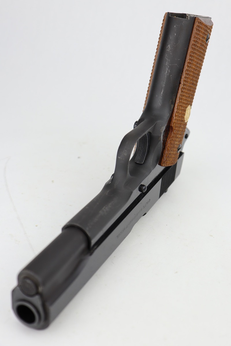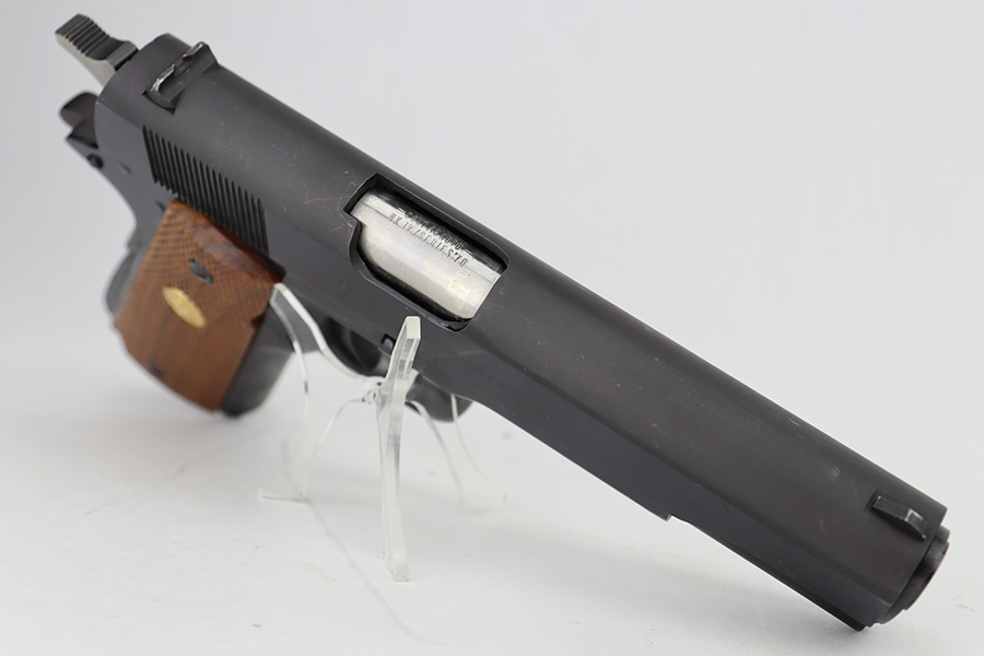 6/14/23 – This is a near-mint example of an “experimental” Colt Series 70 Government Model. It has an x-prefix serial number, and comes with the Colt archives letter stating this pistol was an experimental example kept by the Colt factory. The serial dates it to ~1998 but the pistol was finally shipped out by Colt in 2008. It shows very little finish loss, just minor surface scuffs in a few areas. Minty bore and grips.