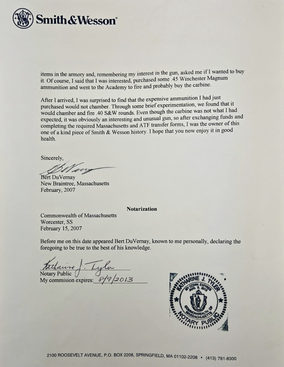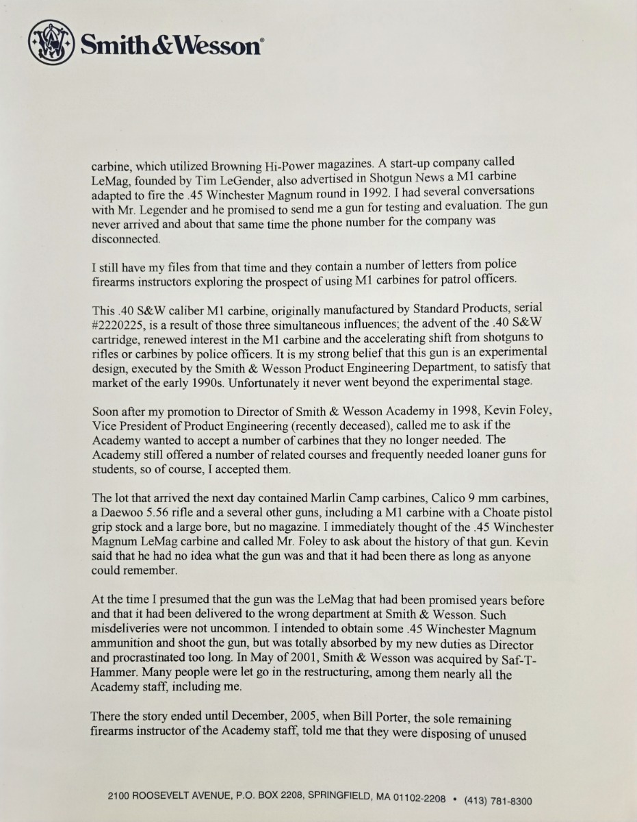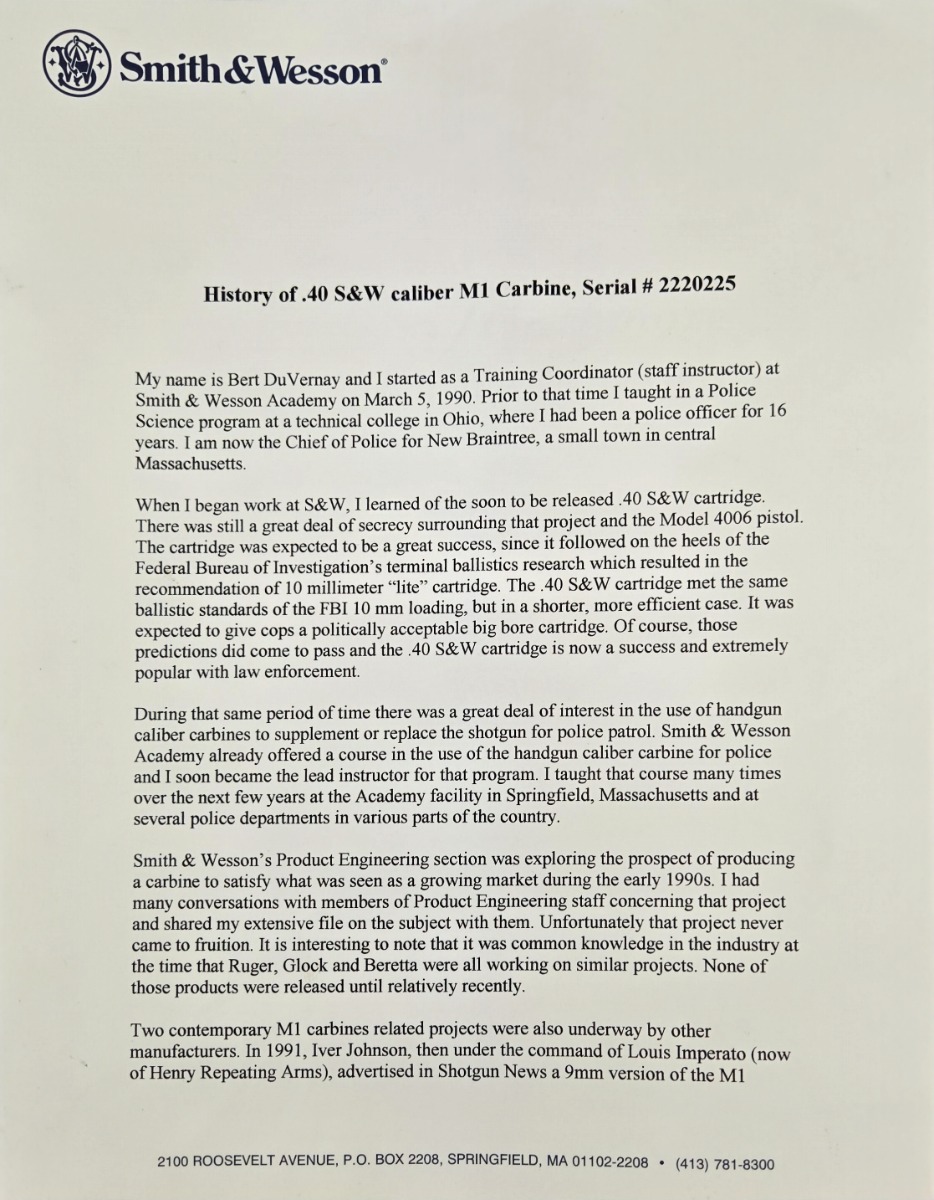 10/30/24 – For sale is an experimental M1 Carbine put together by Smith & Wesson’s Product Engineering Team in the 1990s. The carbine was developed to try and have a long gun chambered in the new.40 S&W cartridge when the need arose. A Letter written by the former director of Smith & Wesson Academy bought the rifle from Smith & Wesson in 2005 after the teams were disbanded. The receiver was made by Standard Products during WW2 and was rebarreled by S&W. The bolt was modified to chamber the cartridge. The stock is a Choate stock with a pistol grip and an aftermarket heat shield. The bore is bright with great rifling. The carbine comes with a Letter from Bert DuVernay S&W Academy and a Certificate of Authenticity from the Larry L. Ruth College.