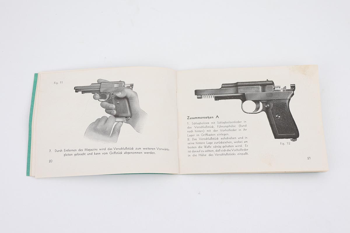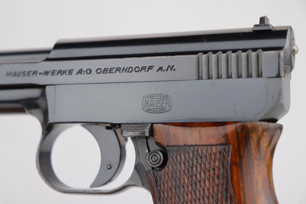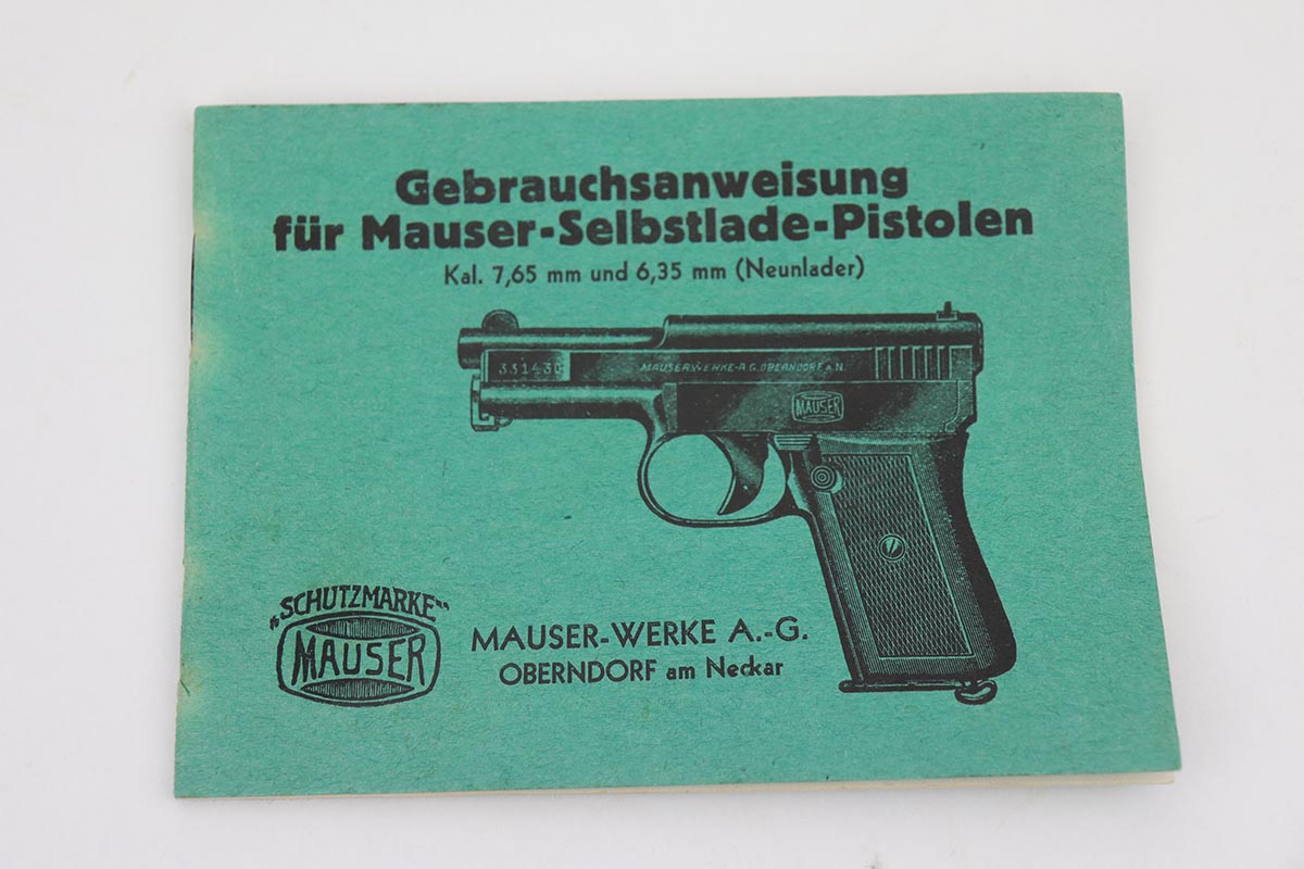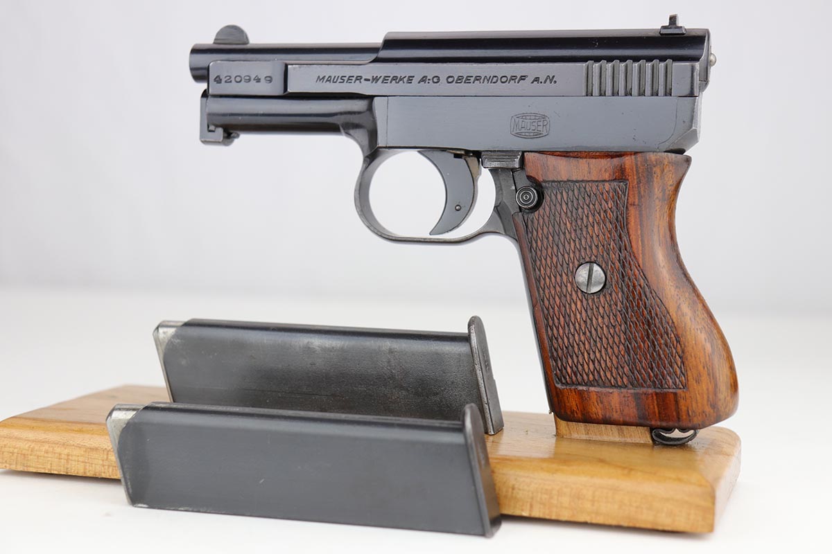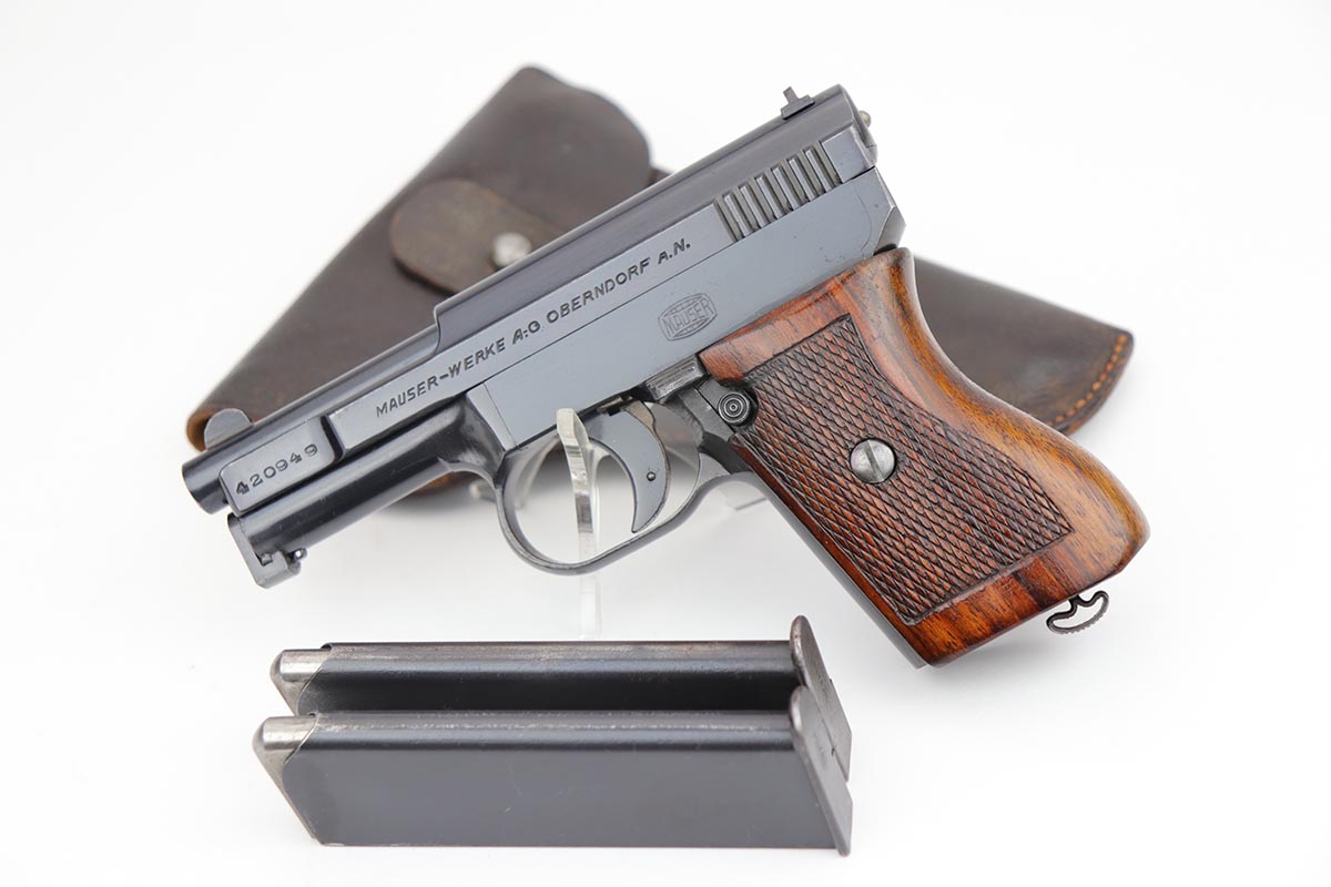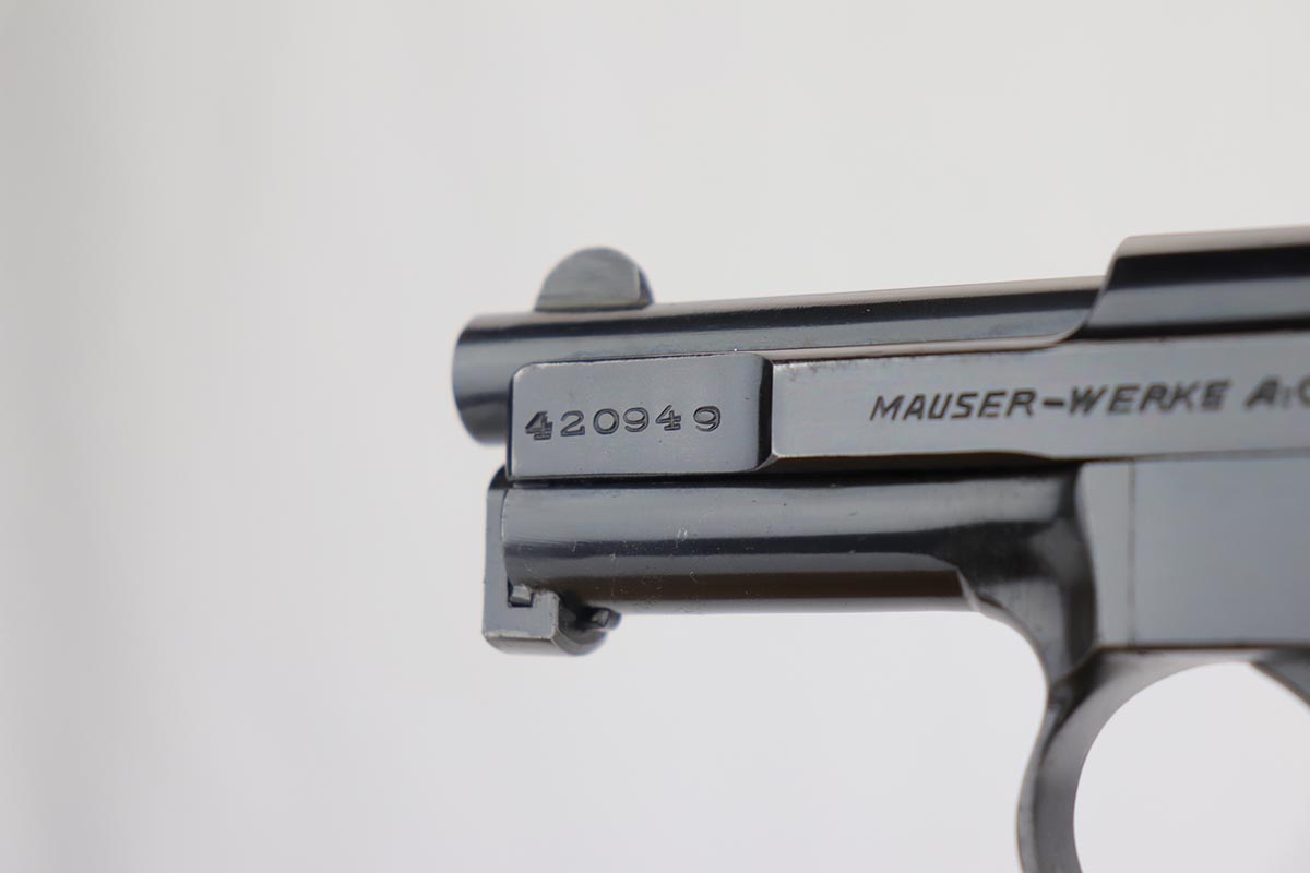 9/11/19 – This is an exquisite Mauser M1910/34 pistol rig, often referred to as a ‘Baby’ Mauser. The pistol is all original and correct with 99+% of the high-polish blue remaining. Mint bore and near-perfect grip. It comes with a correct spare magazine, an original manual, and a nice holster. The holster is in great shape with faint Mauser inkstamp internally, and external maker mark. This rig would be very tough to upgrade.