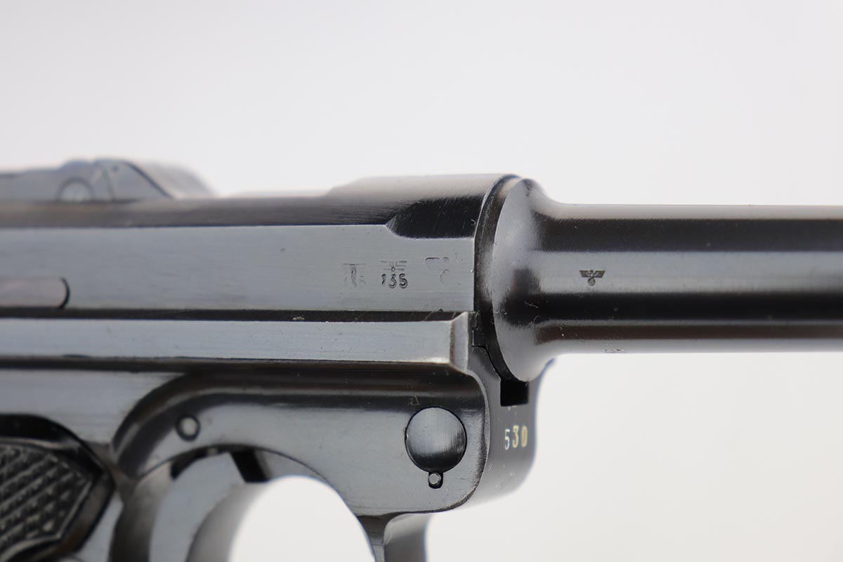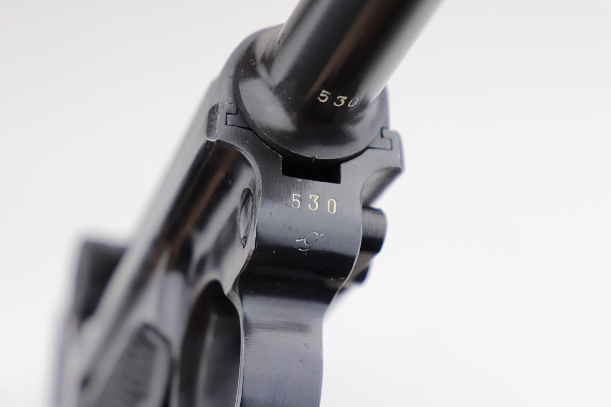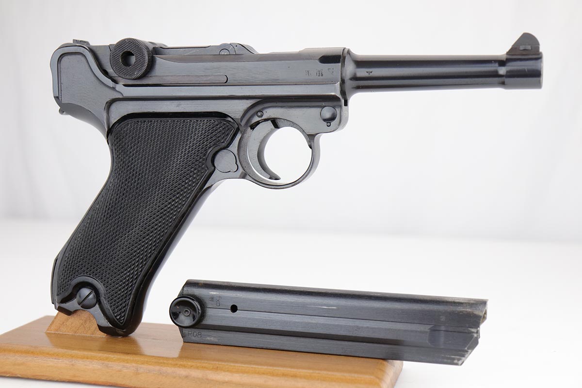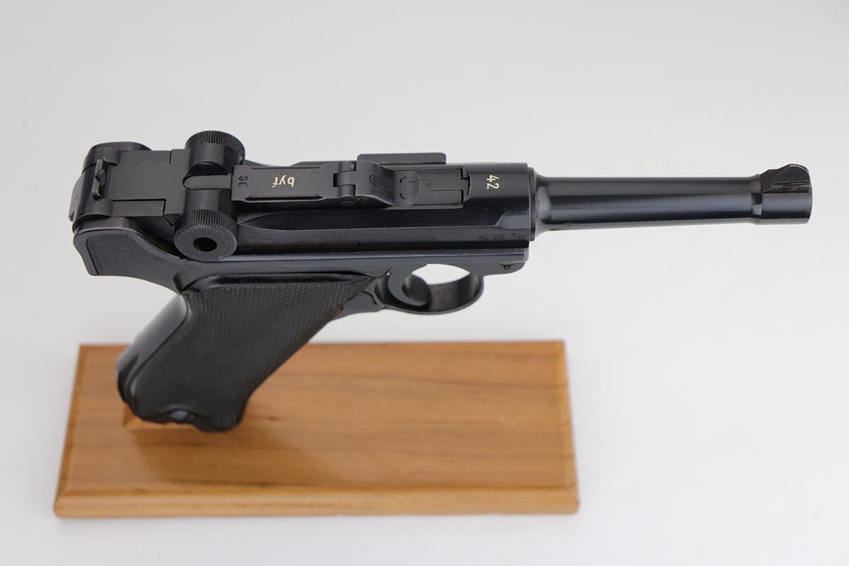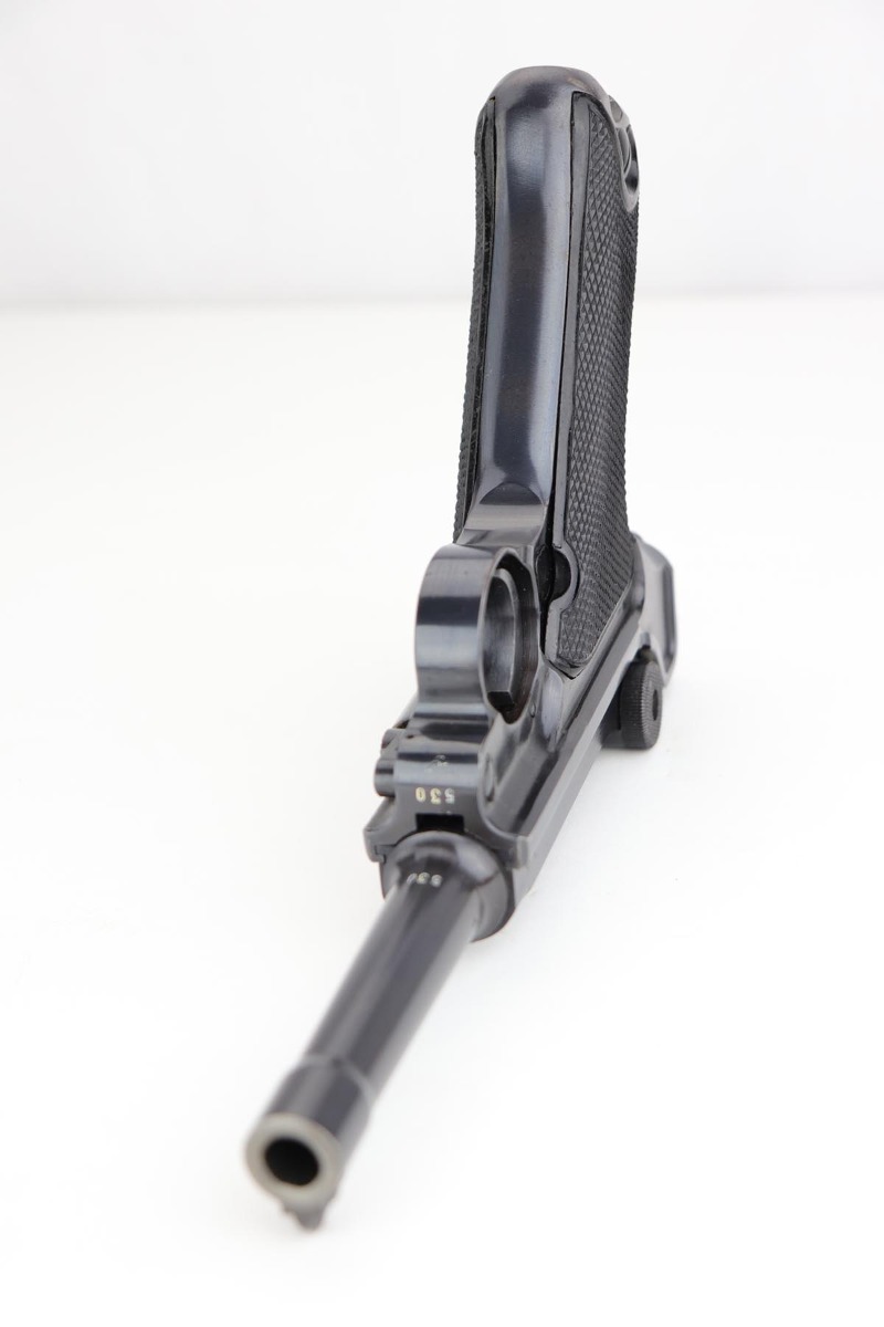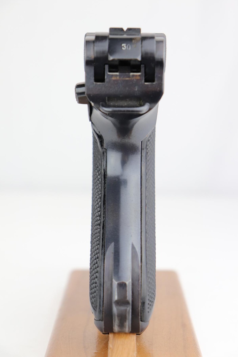 1/2/20 – This is a near-mint Black Widow Mauser Luger from 1942, all matching and original. About 98-99% of the original blue remains, with just a hint of high edge wear and spot of finish loss on the bottom of the front strap. Mint bore. Very nice Black Widow style magazine and grips. One of the most desirable Nazi era firearms, in a condition we see about once or twice per year.