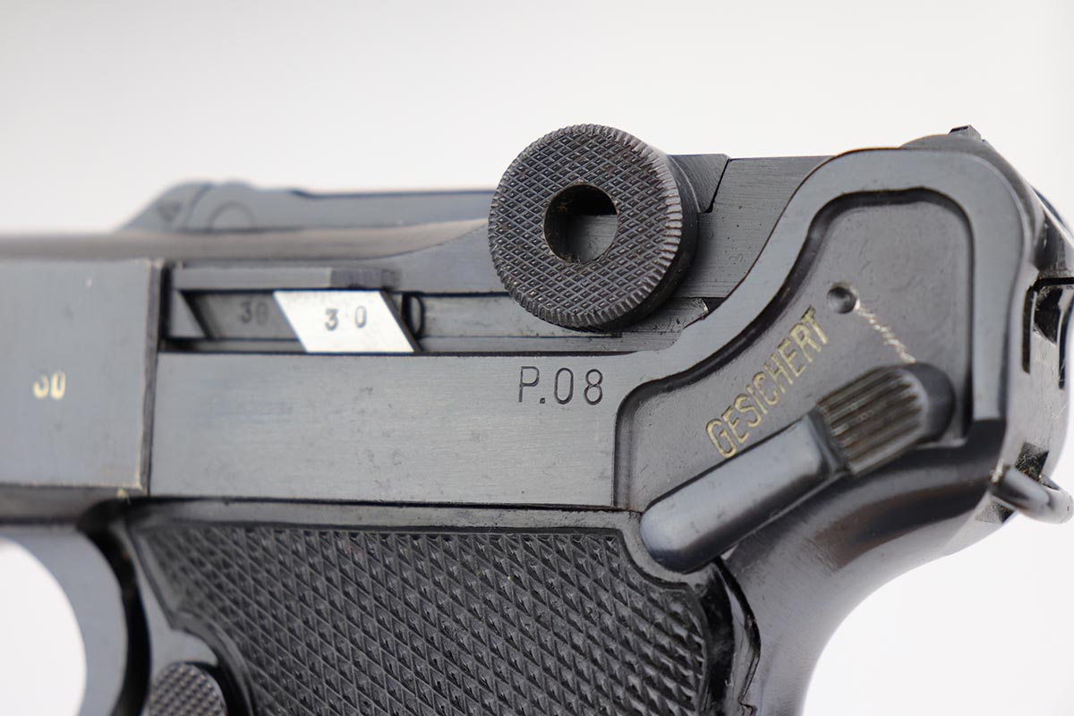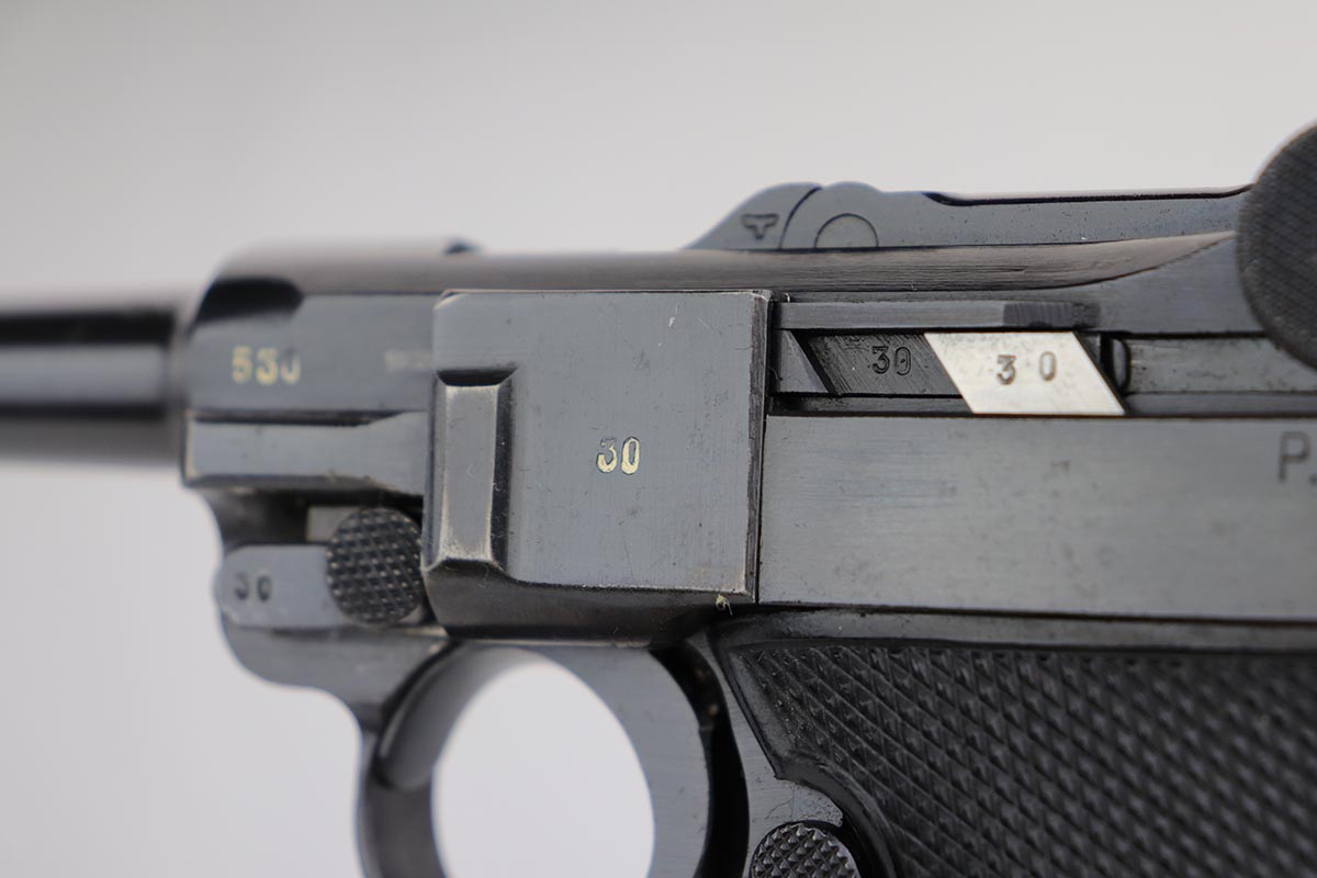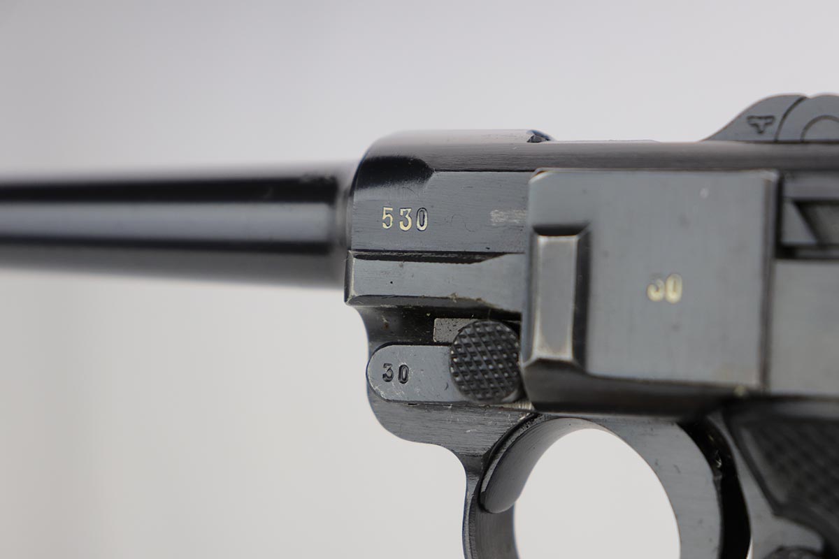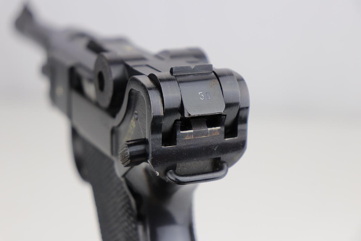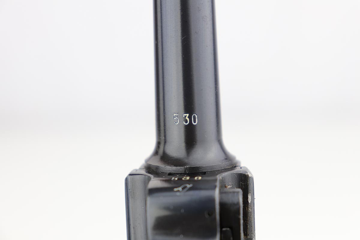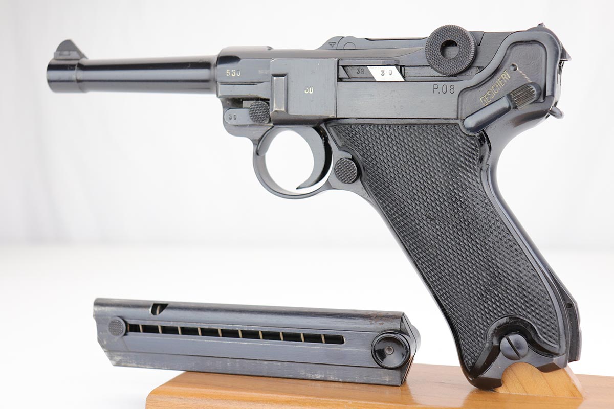 1/2/20 – This is a near-mint Black Widow Mauser Luger from 1942, all matching and original. About 98-99% of the original blue remains, with just a hint of high edge wear and spot of finish loss on the bottom of the front strap. Mint bore. Very nice Black Widow style magazine and grips. One of the most desirable Nazi era firearms, in a condition we see about once or twice per year.