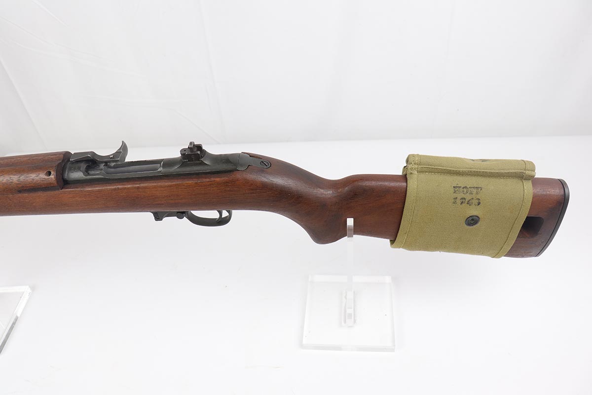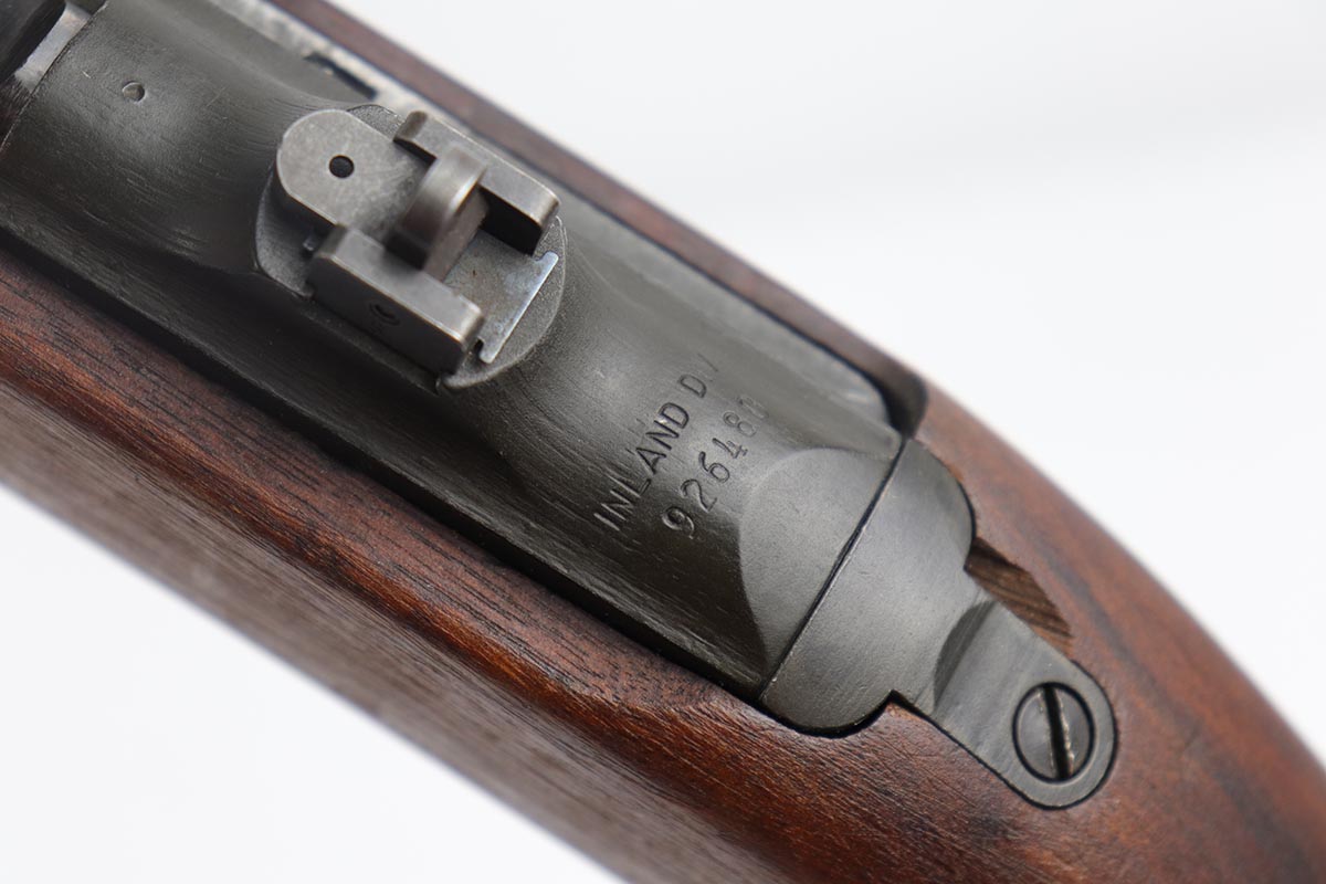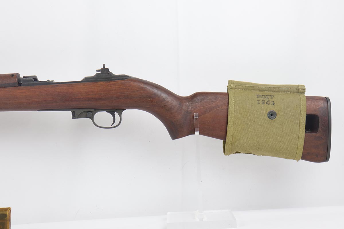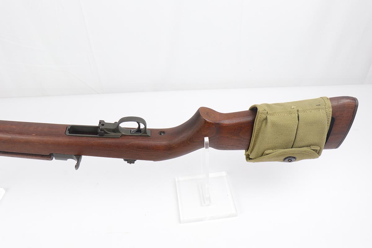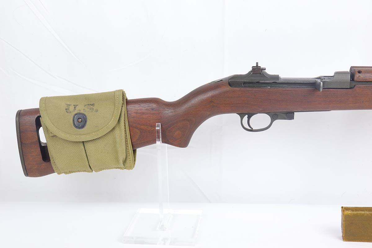 4/15/19 – This is a near-mint Inland M1 Carbine that was manufactured in September of 1943. Early gun with only six-digit serial. The metal parts retain about 99% original finish, with only minor wear on the buttplate. The high-wood stock is in the same condition as the metal, with clear cartouche on right side and IO marking in sling well. Circle P on bottom of wrist. Excellent, shiny bore. Comes with an original magazine pouch that is also dated to 1943, and one magazine which is still inside the original wrapper.