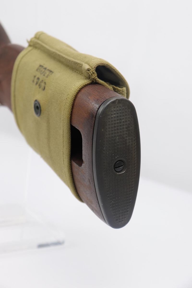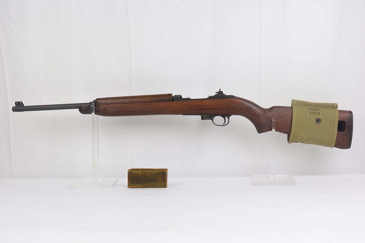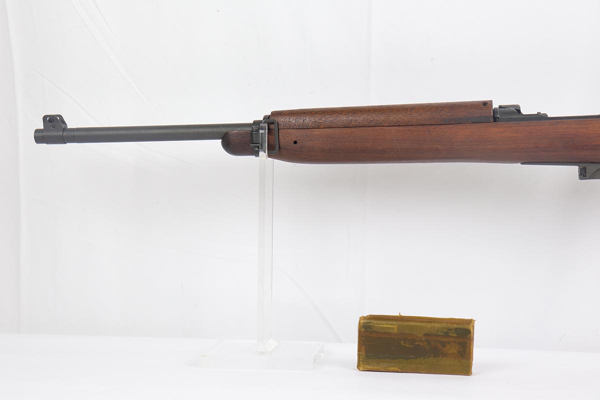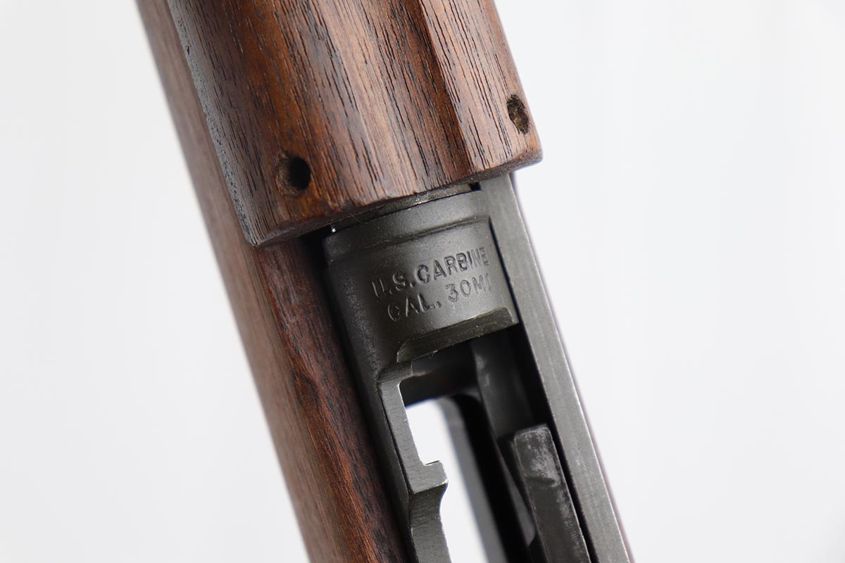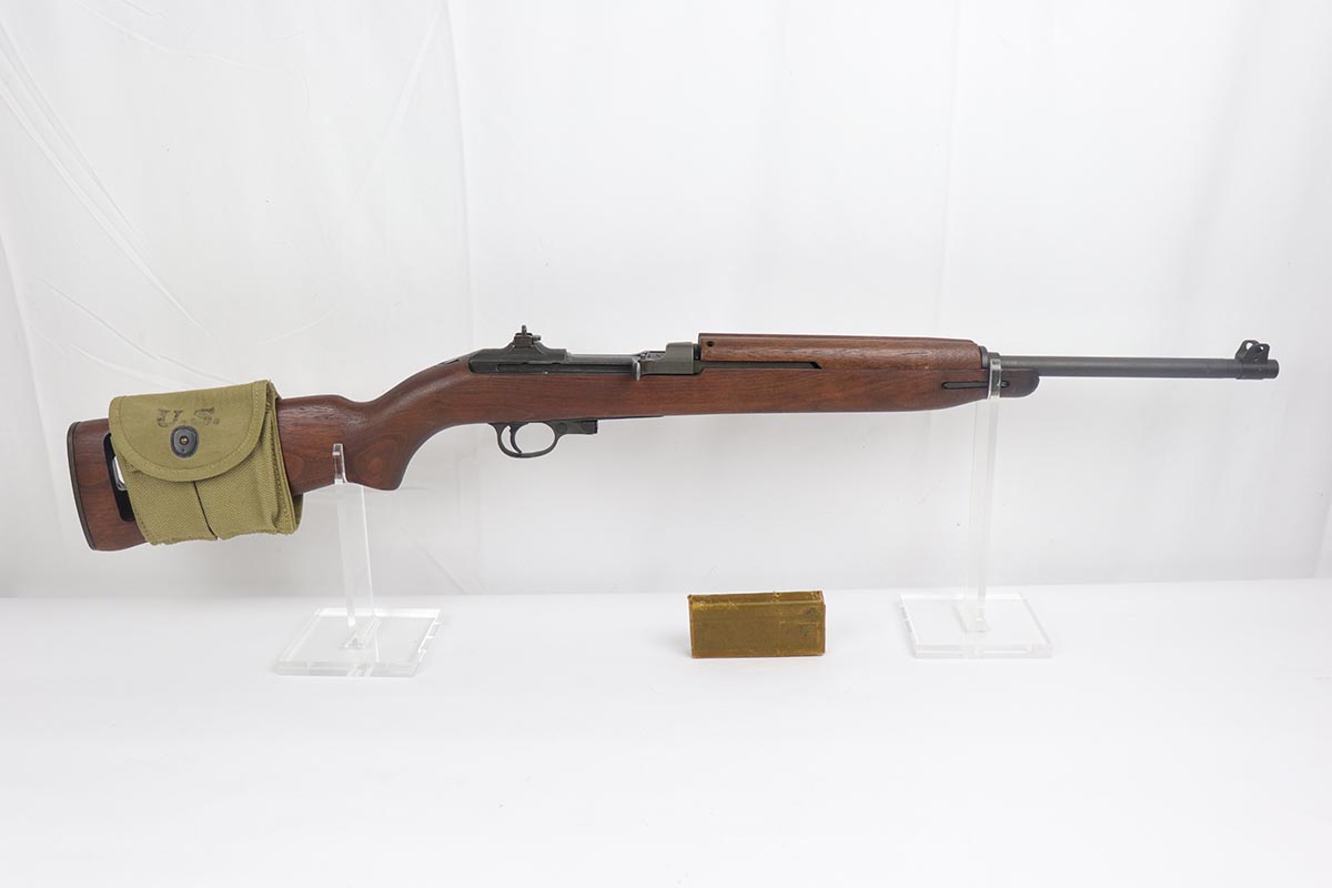 4/15/19 – This is a near-mint Inland M1 Carbine that was manufactured in September of 1943. Early gun with only six-digit serial. The metal parts retain about 99% original finish, with only minor wear on the buttplate. The high-wood stock is in the same condition as the metal, with clear cartouche on right side and IO marking in sling well. Circle P on bottom of wrist. Excellent, shiny bore. Comes with an original magazine pouch that is also dated to 1943, and one magazine which is still inside the original wrapper.