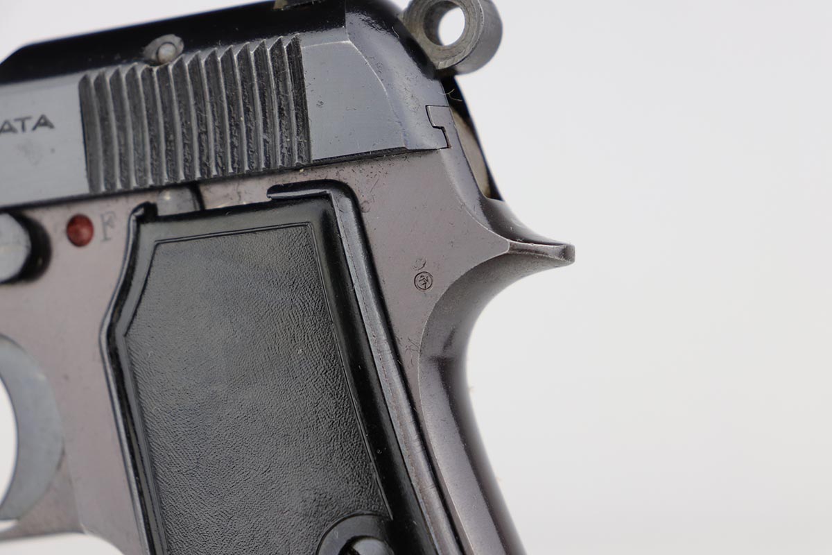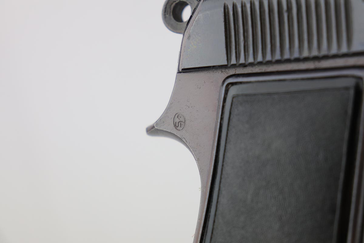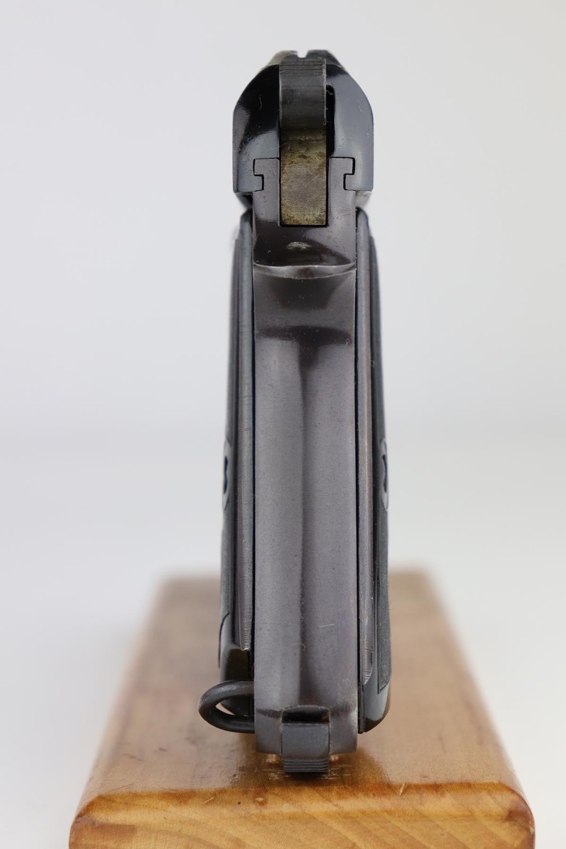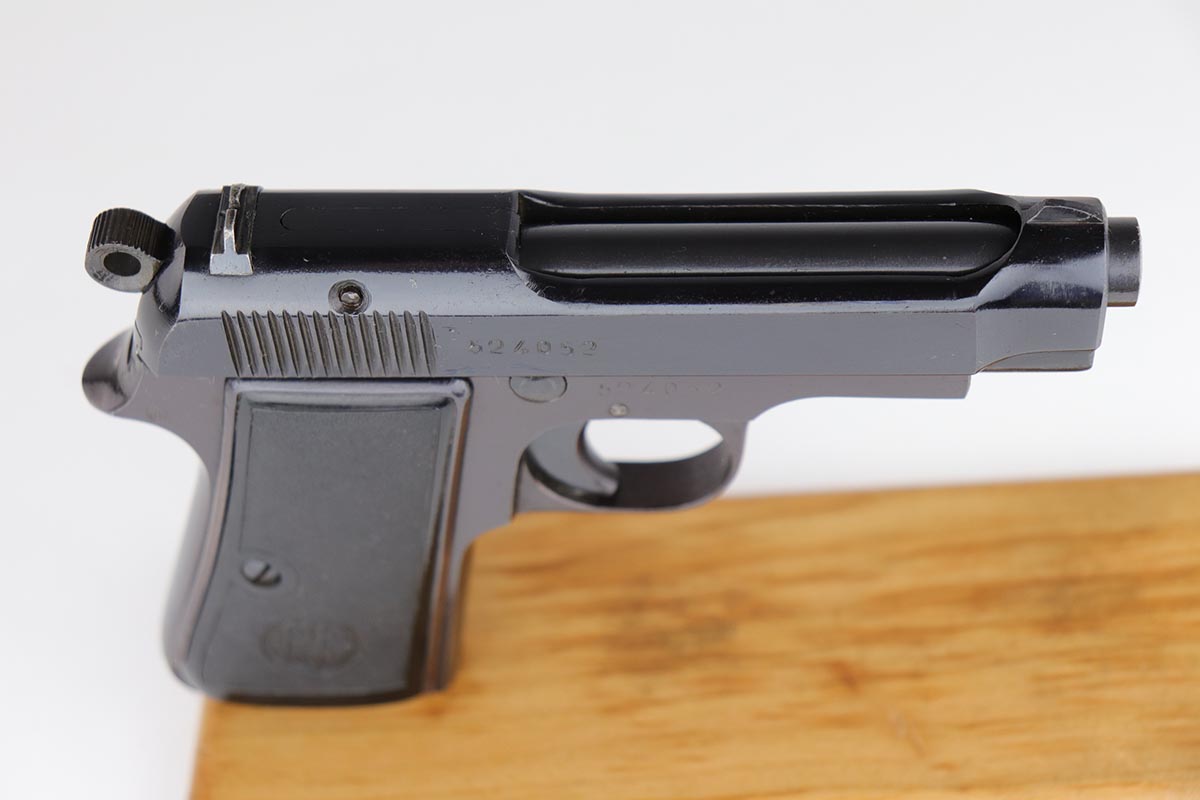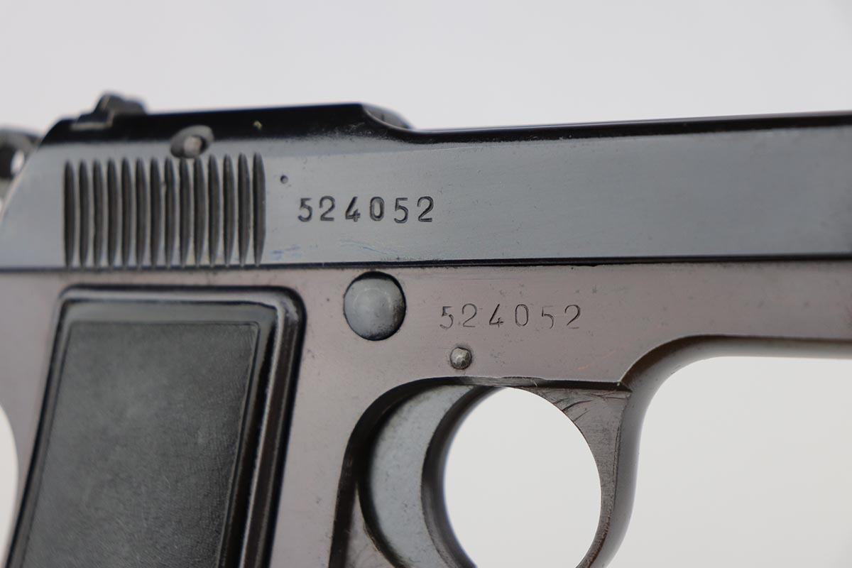 6/5/19 – This is an exceptional example of a Beretta M1935, with Nazi military ‘4UT’ proof on right side frame. Made in 1944 and chambered for the German-preferred 7.65mm, this pistol retains 97-98% high-polish blue with a nice plum color to the frame. There’s minor finish loss on the left side of the slide, near the muzzle and along the ejection port. Strong, shiny bore. Excellent grips and magazine.