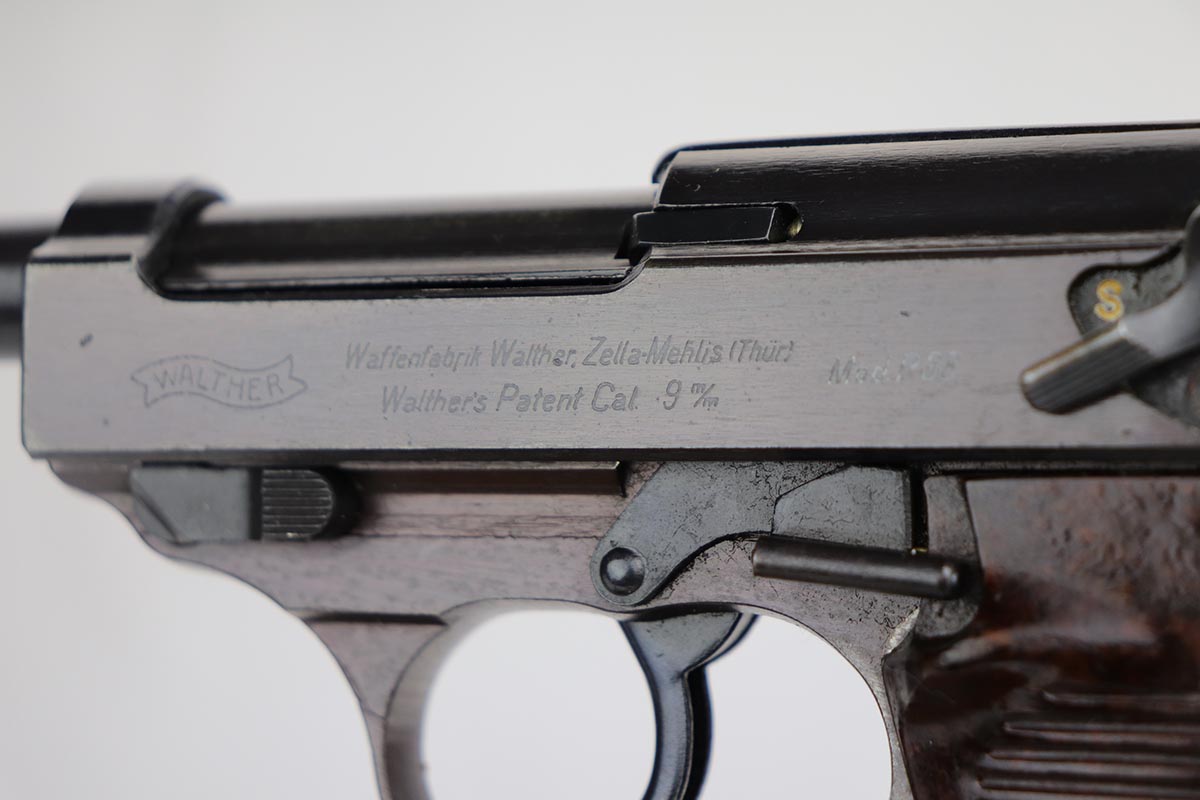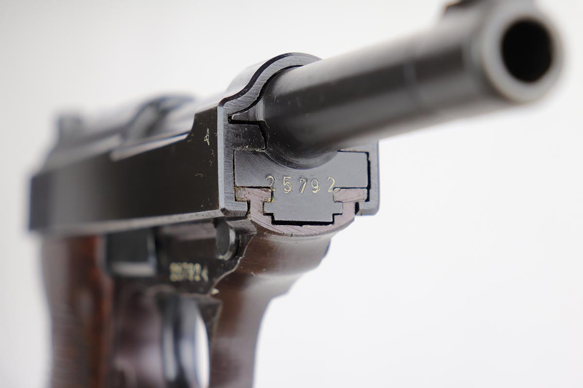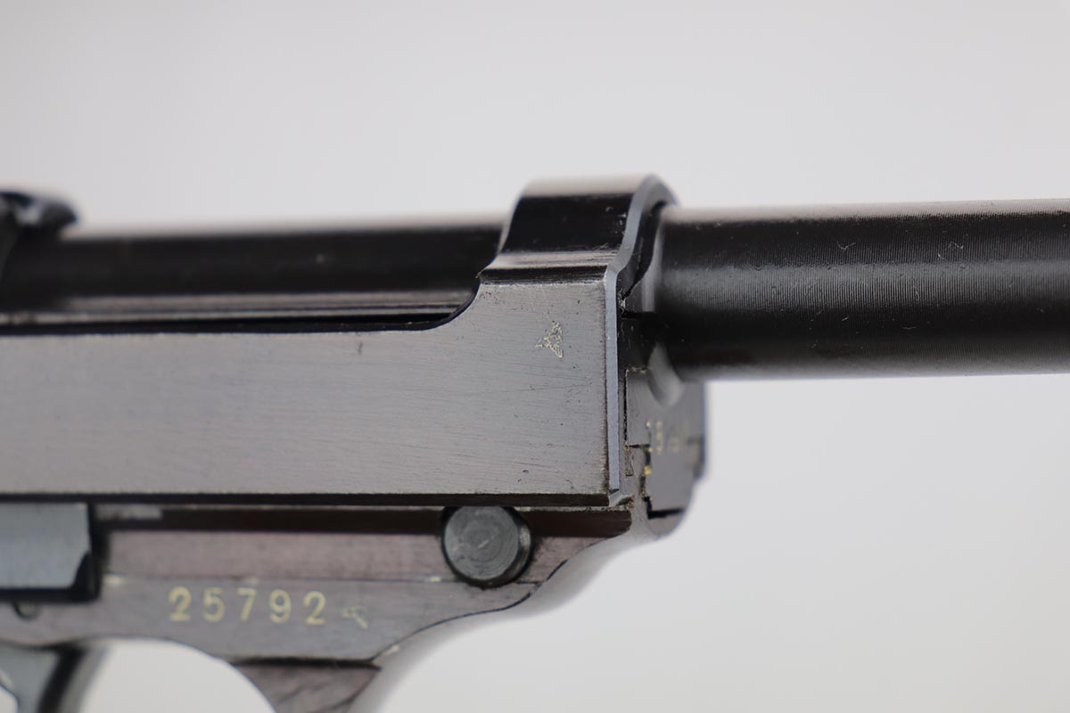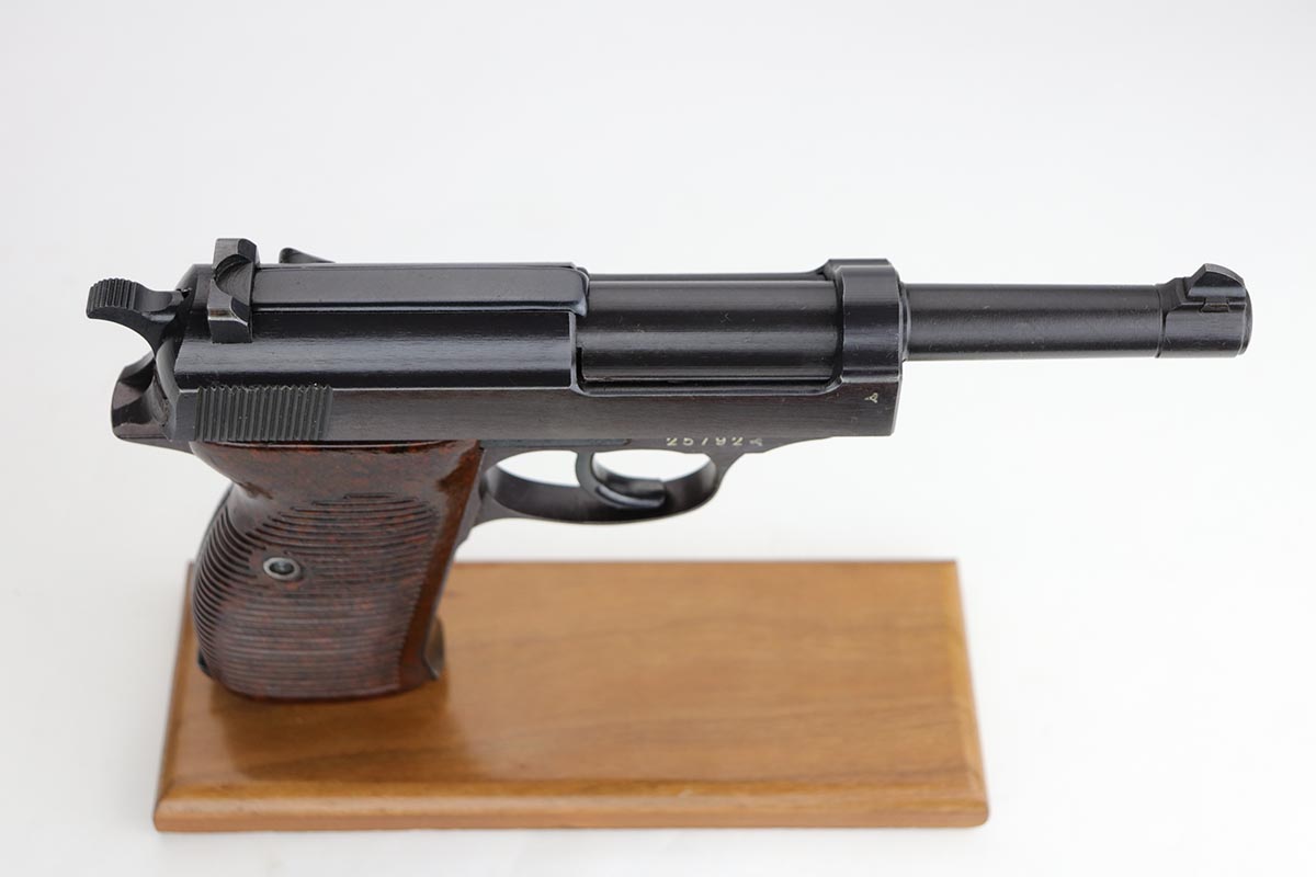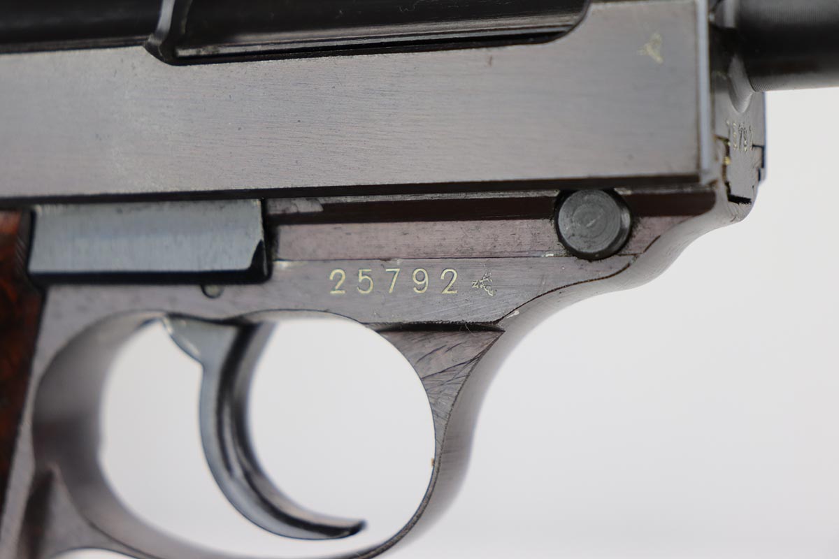 12/13/19 – This is probably the finest example we’ve ever encountered of a rare Walther P.38 variant. It is a commercial Mod. P38, one of only 1,800 produced. The pistol is all matching and original with 99% of the bluing remaining, showing just a minor hint of high edge wear. Further, it has a beautiful plum hue to the slide and frame, which is very popular with many of our customers. The front strap does have a casting flaw that is surprisingly common on these pistols. Minor bore and grips. Magazine is marked ‘jvd’ on body. Just an example that cannot be upgraded.