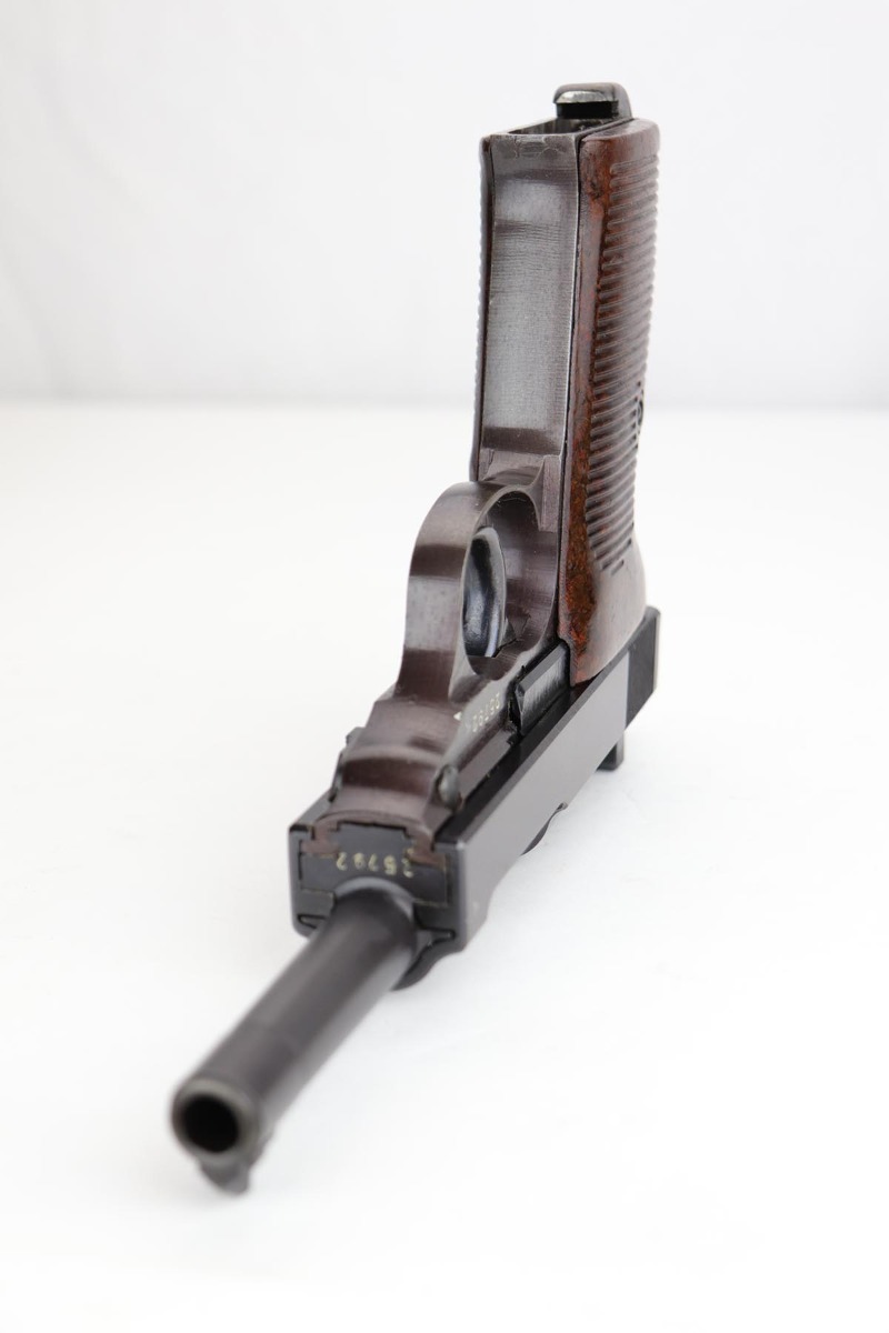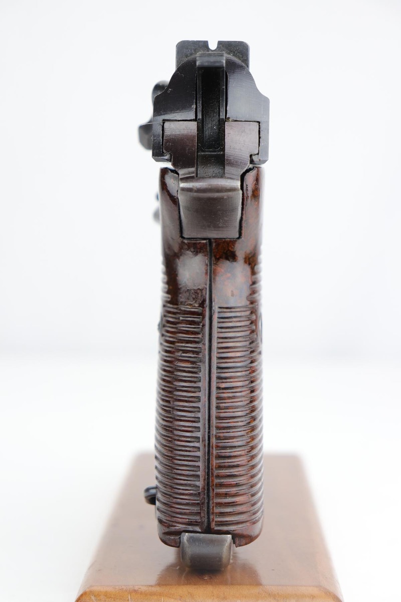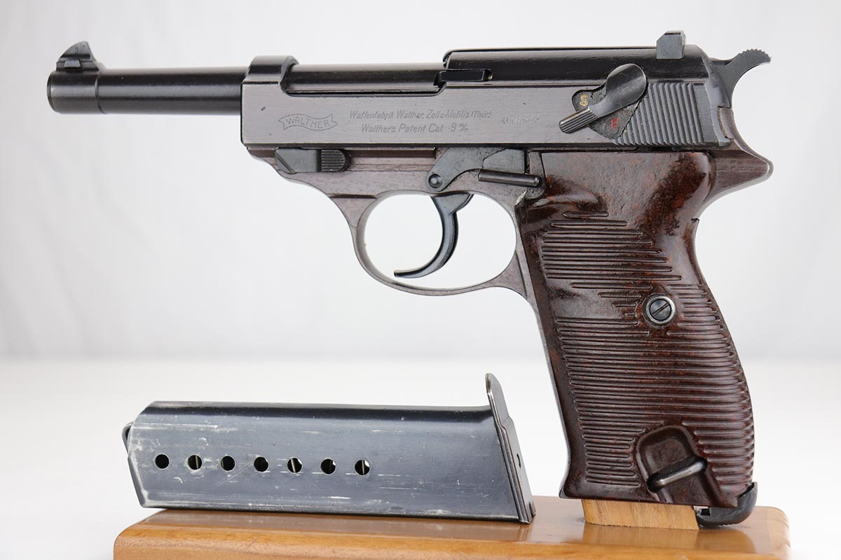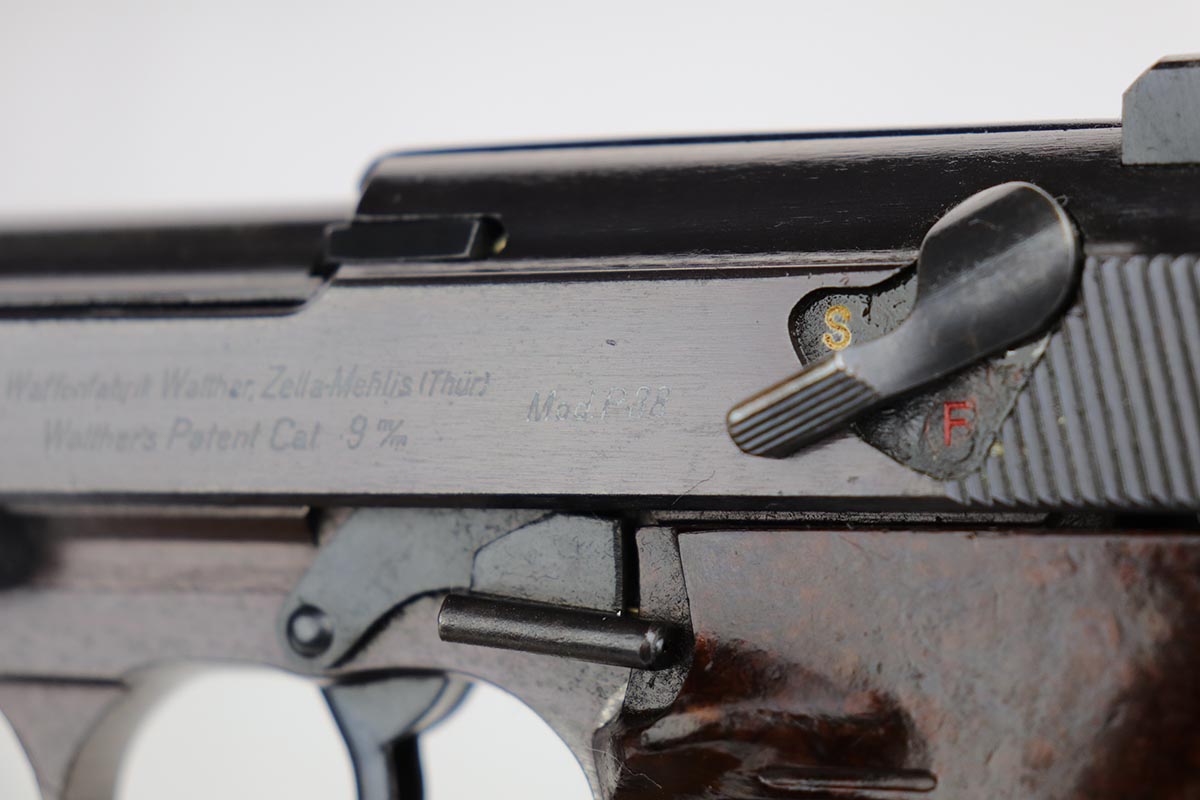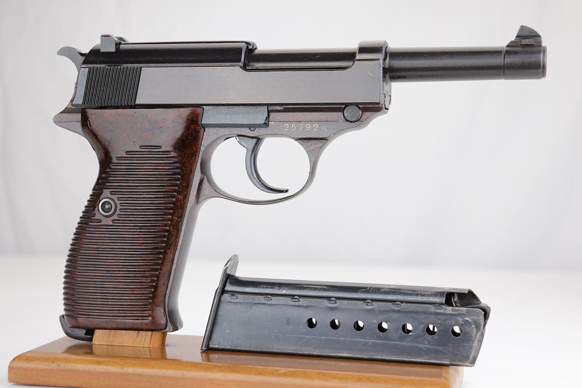 12/13/19 – This is probably the finest example we’ve ever encountered of a rare Walther P.38 variant. It is a commercial Mod. P38, one of only 1,800 produced. The pistol is all matching and original with 99% of the bluing remaining, showing just a minor hint of high edge wear. Further, it has a beautiful plum hue to the slide and frame, which is very popular with many of our customers. The front strap does have a casting flaw that is surprisingly common on these pistols. Minor bore and grips. Magazine is marked ‘jvd’ on body. Just an example that cannot be upgraded.