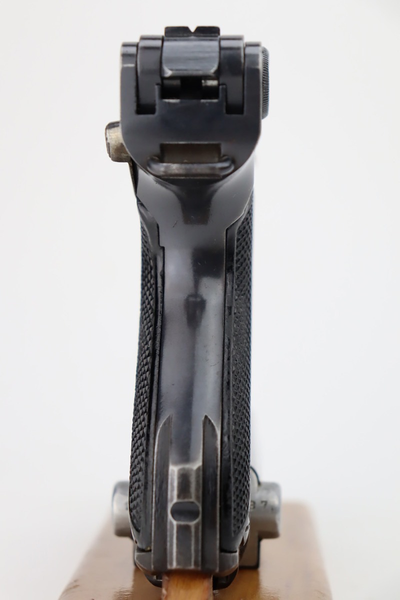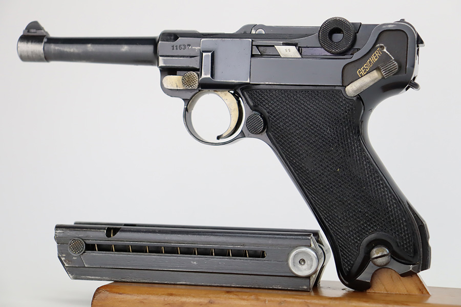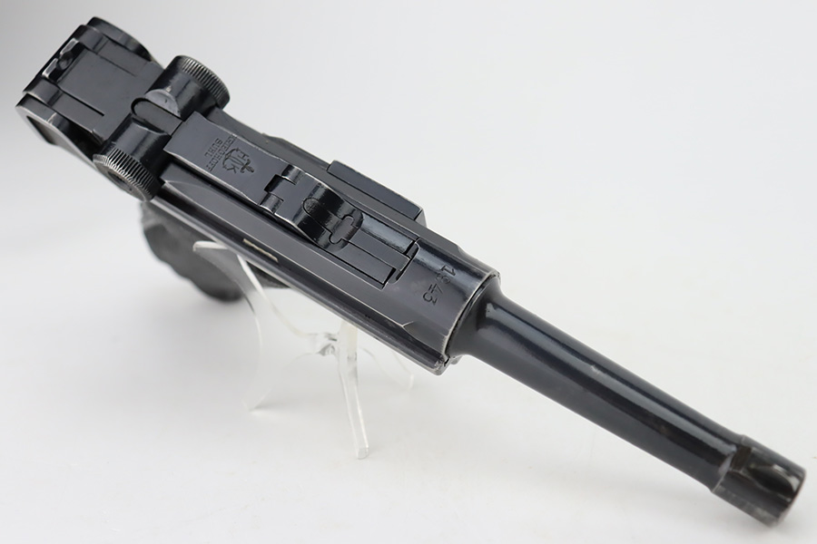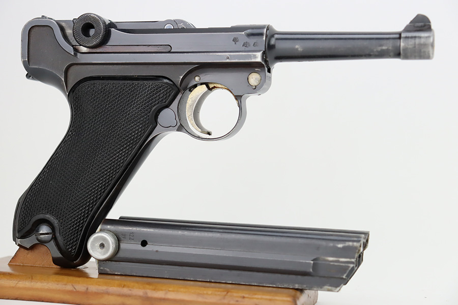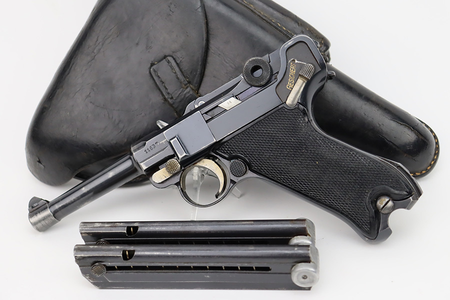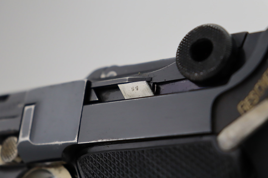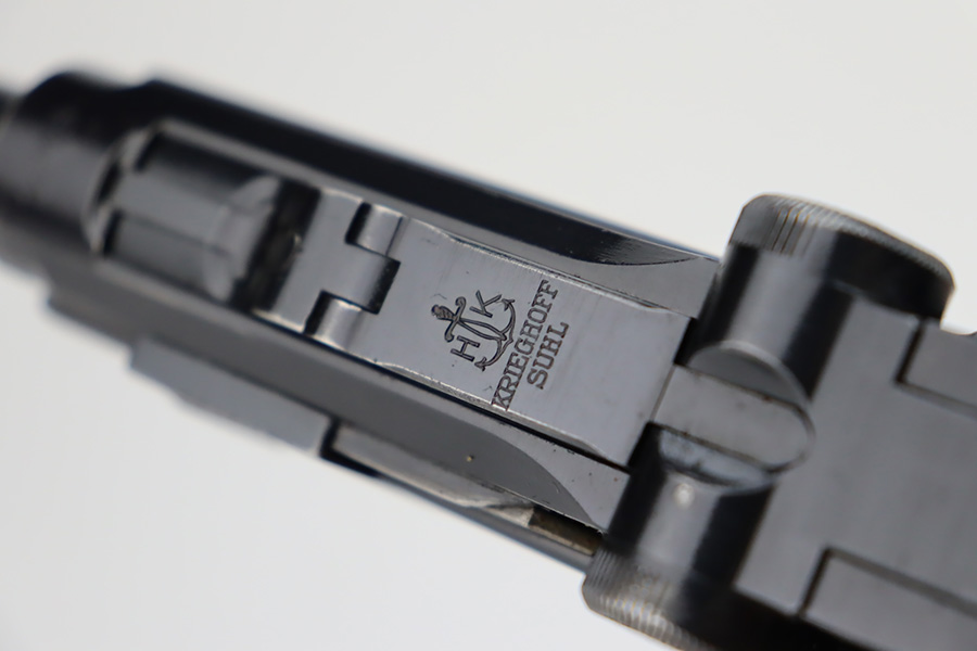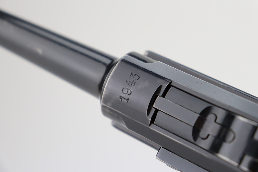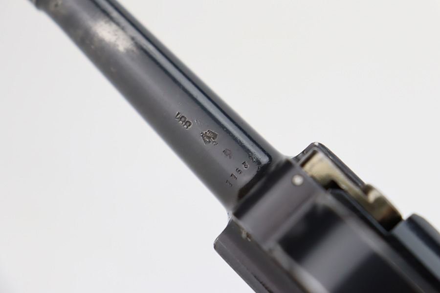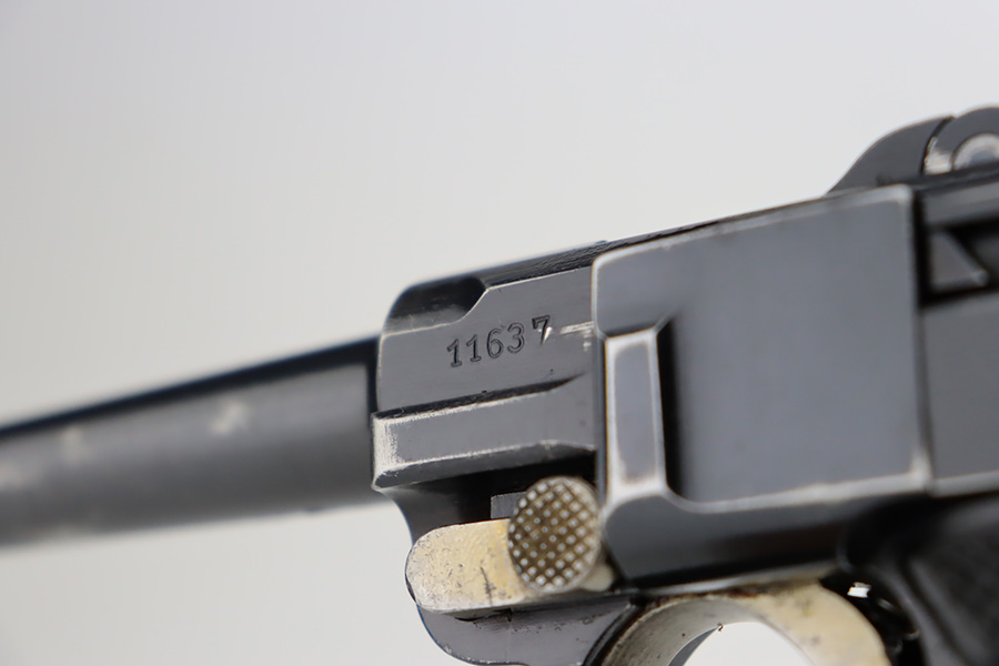 10/3/23 – This is an extremely rare and original Krieghoff Luger from 1943 with both of its original, matching magazines. There were only ~300 produced that year, and can’t be more than a handful of existing examples with both of the original magazines still accompanying the pistol. The original finish rates about 92-93% with the majority of the wear being along the muzzle/barrel, but a little more on the high edges and bottom of front strap. All of the numbers are matching including the original 2 matching magazines with the correct (right-side up) Krieghoff L2 proofs. Small parts including the sideplate, the take down lever, trigger, each of the toggle links and even the firing pin are numbered 37. The hold open, firing pin and coupler are all properly Krieghoff proofed. Every part we examined looks proper and original, including the type 3 mags. It comes with a 1943 black holster – not Krieghoff made, but rather DLU, and has some separation in the stitching. No tool is included.