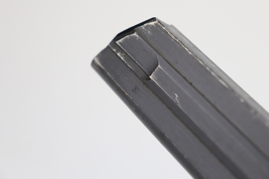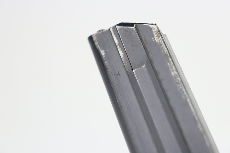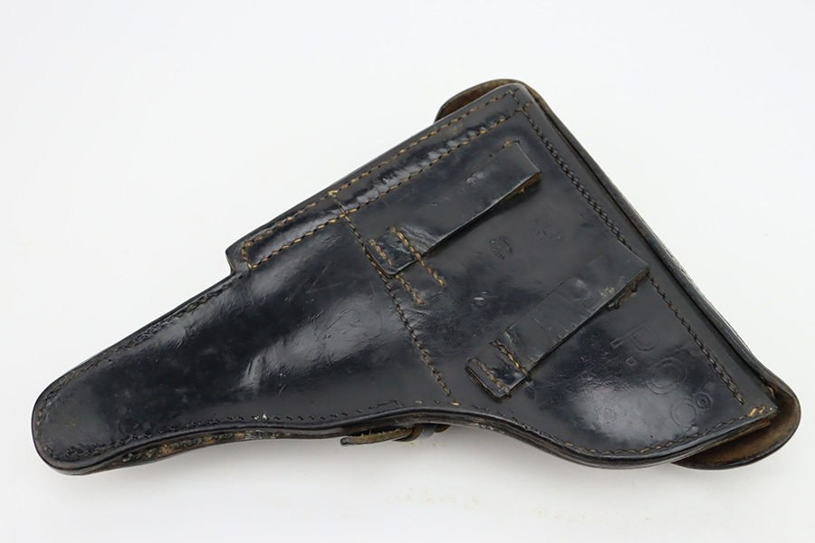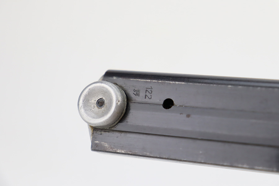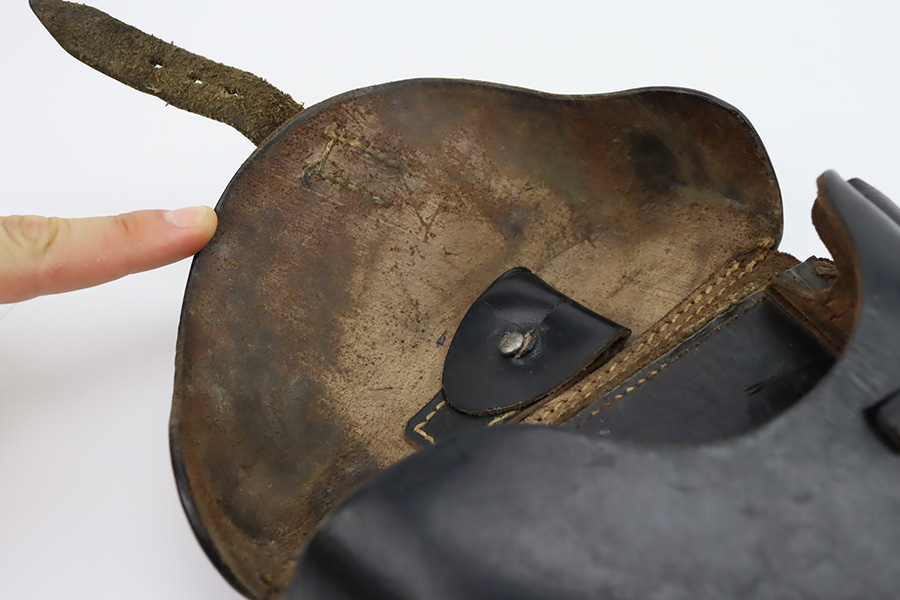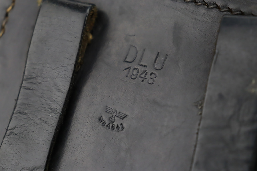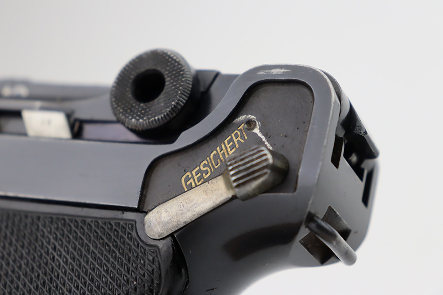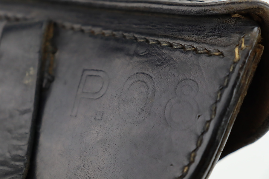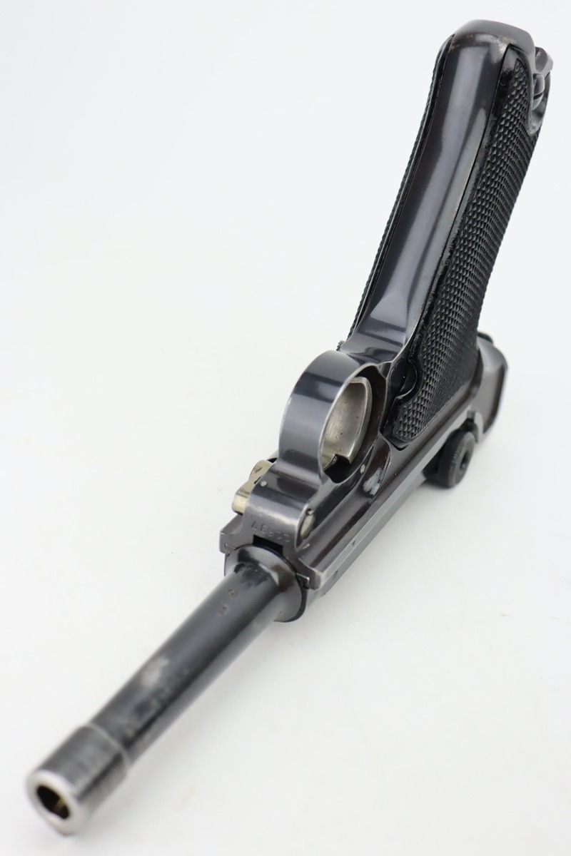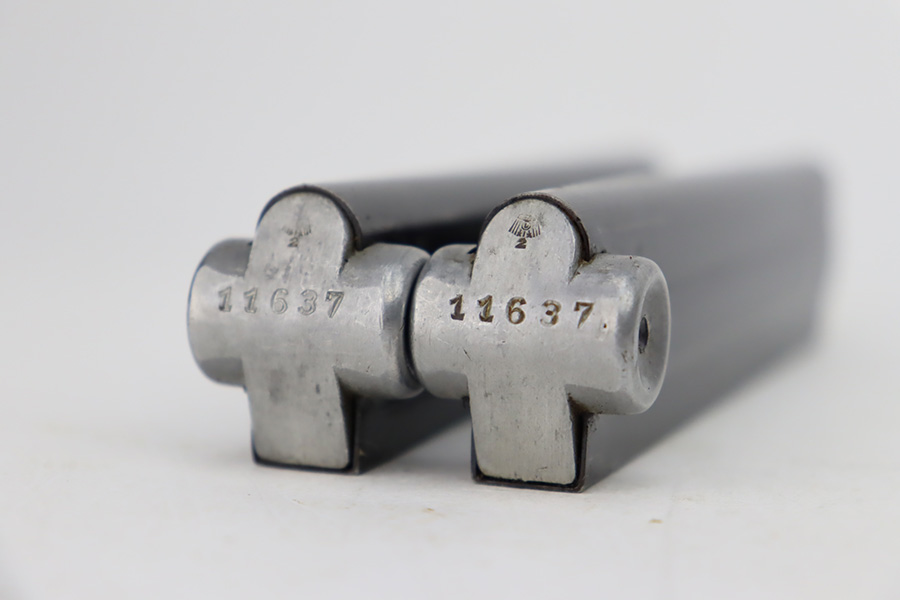 10/3/23 – This is an extremely rare and original Krieghoff Luger from 1943 with both of its original, matching magazines. There were only ~300 produced that year, and can’t be more than a handful of existing examples with both of the original magazines still accompanying the pistol. The original finish rates about 92-93% with the majority of the wear being along the muzzle/barrel, but a little more on the high edges and bottom of front strap. All of the numbers are matching including the original 2 matching magazines with the correct (right-side up) Krieghoff L2 proofs. Small parts including the sideplate, the take down lever, trigger, each of the toggle links and even the firing pin are numbered 37. The hold open, firing pin and coupler are all properly Krieghoff proofed. Every part we examined looks proper and original, including the type 3 mags. It comes with a 1943 black holster – not Krieghoff made, but rather DLU, and has some separation in the stitching. No tool is included.
