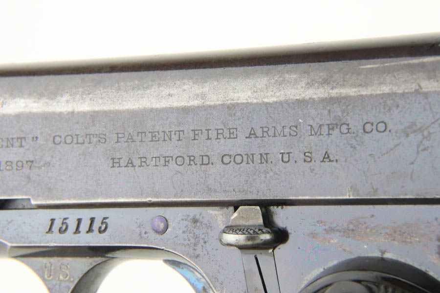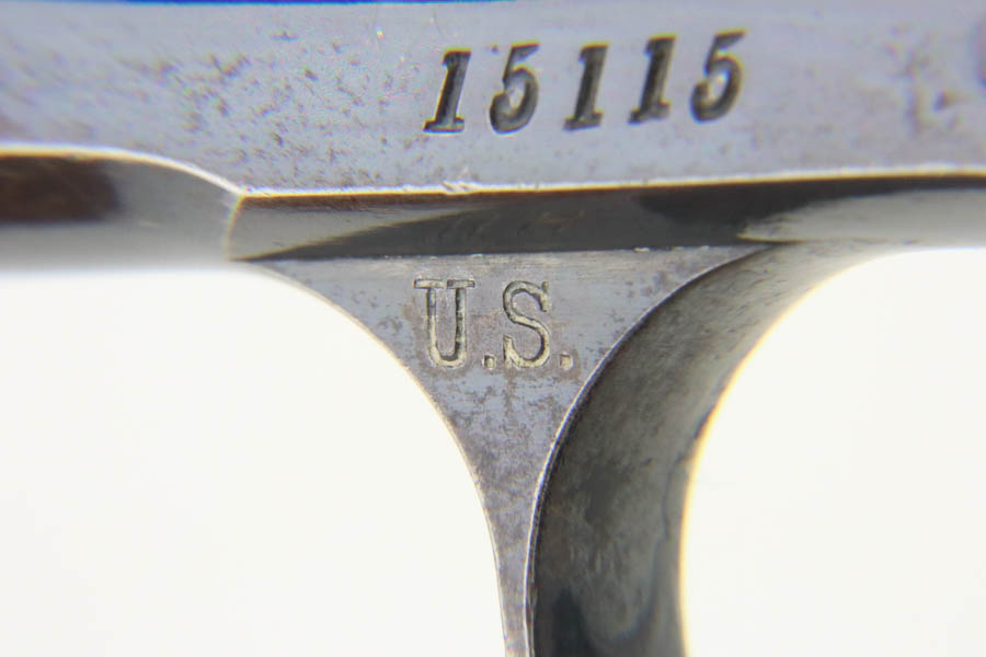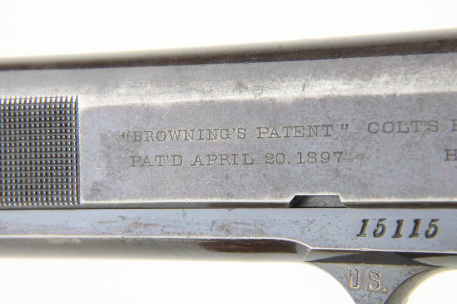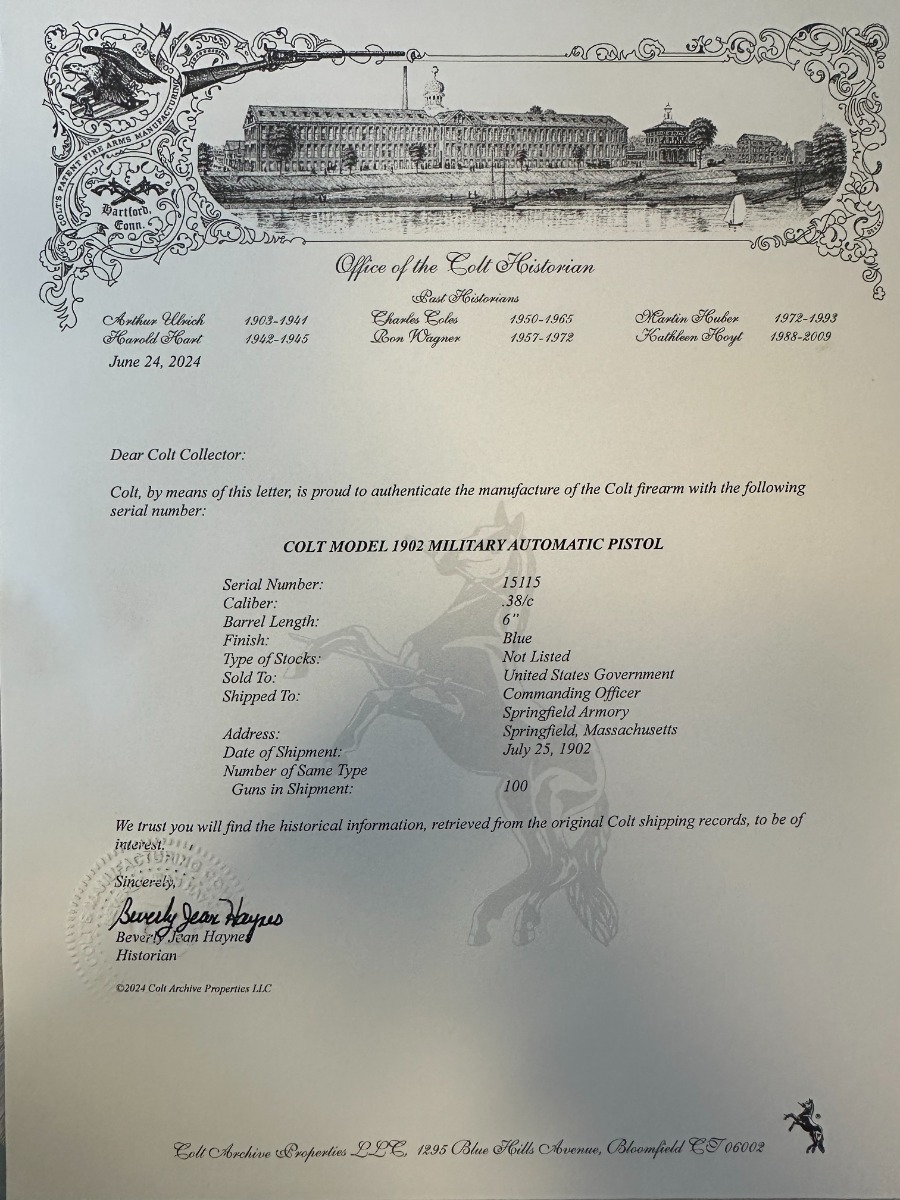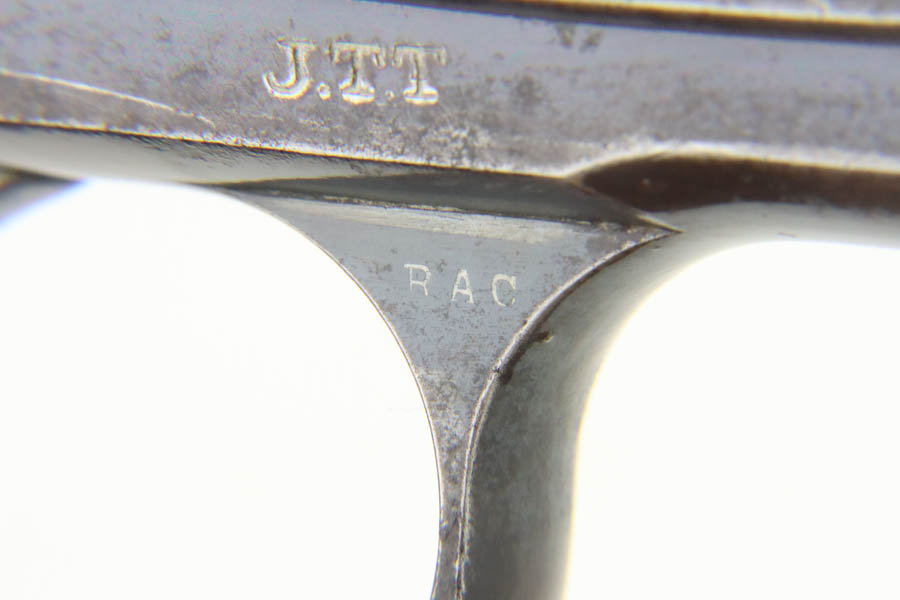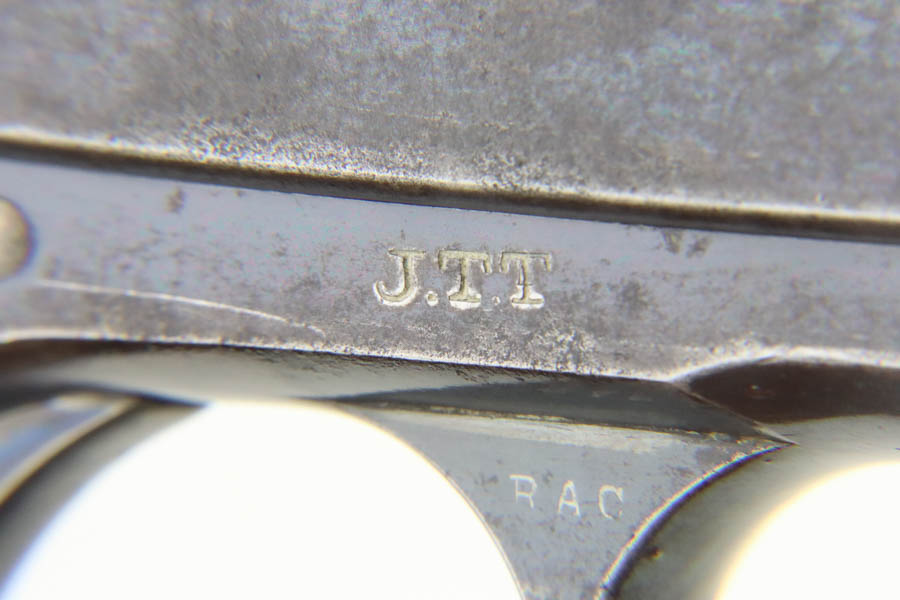 5/22/24 – This is an extremely rare and desirable Colt Model 1902 Army Contract pistol from 1902. One of only 200 produced, from serial 15001-15200. This pistol was delivered to Springfield Armory on July 25th of 1902, and features proper military inspector markings with U.S. marking on left trigger guard, and John T. Thompson (JTT) inspector mark on right side frame. Right side trigger guard is also Rinaldo A. Carr inspected (RAC). The pistol is in good condition with some visible wear but also has some cold blue spot touchups in a few areas. The bore is generally clean with good rifling, but has minor frost in the grooves. Excellent Colt grips with no cracks or chips, just a small ding in the right panel. Rare two-tone magazine is marked ‘MIL. COLT .38 CAL’ on the base. Comes with Colt archive letter.