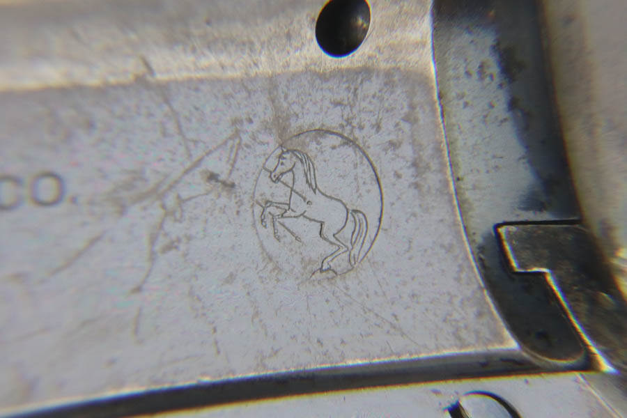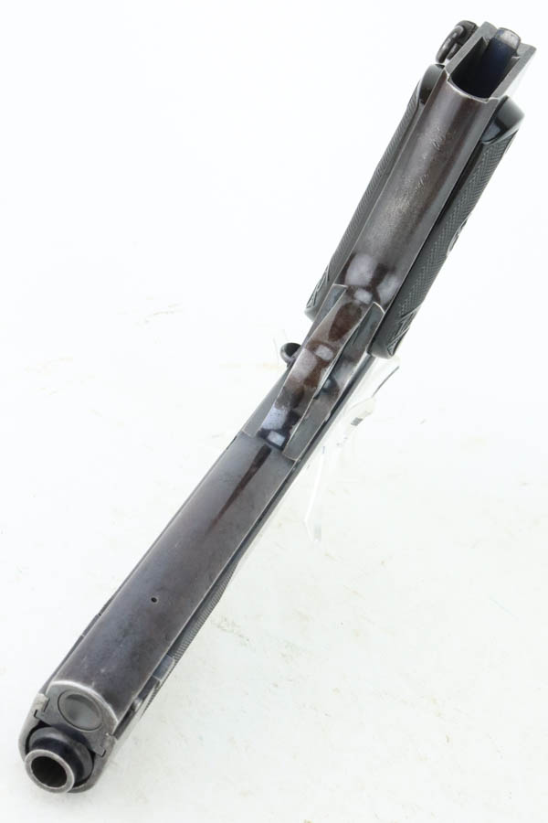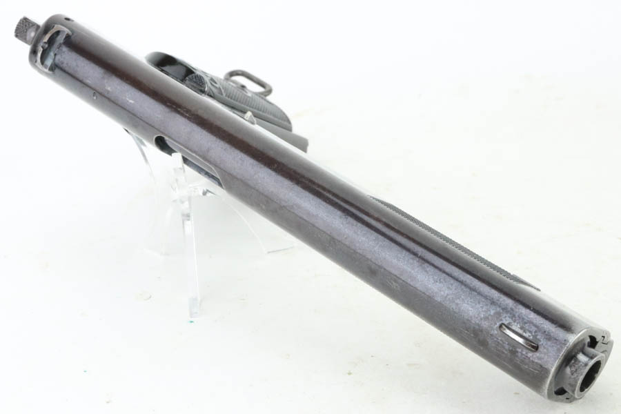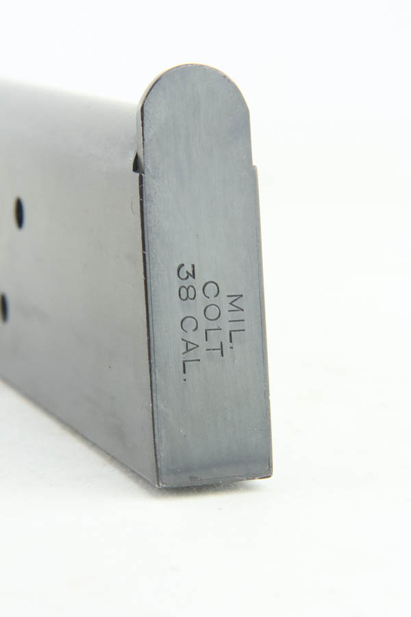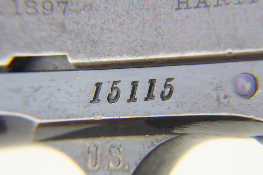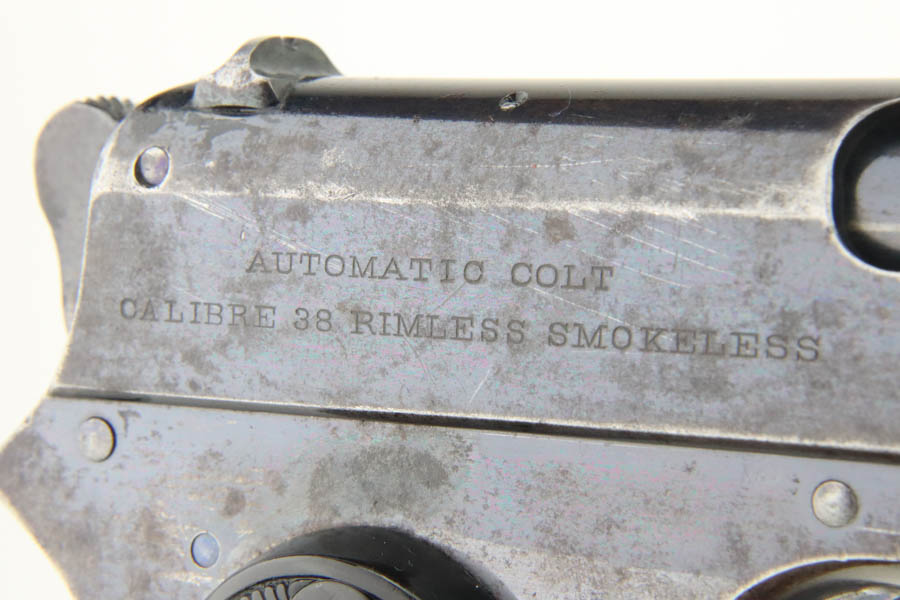 5/22/24 – This is an extremely rare and desirable Colt Model 1902 Army Contract pistol from 1902. One of only 200 produced, from serial 15001-15200. This pistol was delivered to Springfield Armory on July 25th of 1902, and features proper military inspector markings with U.S. marking on left trigger guard, and John T. Thompson (JTT) inspector mark on right side frame. Right side trigger guard is also Rinaldo A. Carr inspected (RAC). The pistol is in good condition with some visible wear but also has some cold blue spot touchups in a few areas. The bore is generally clean with good rifling, but has minor frost in the grooves. Excellent Colt grips with no cracks or chips, just a small ding in the right panel. Rare two-tone magazine is marked ‘MIL. COLT .38 CAL’ on the base. Comes with Colt archive letter.