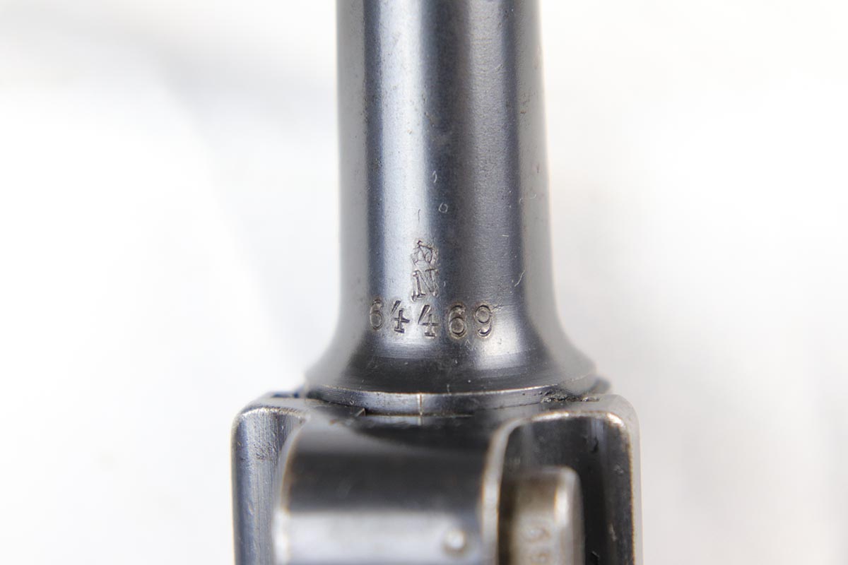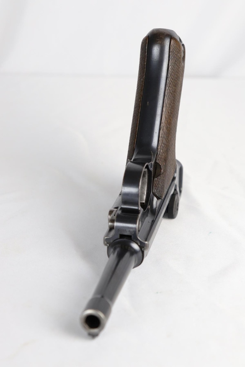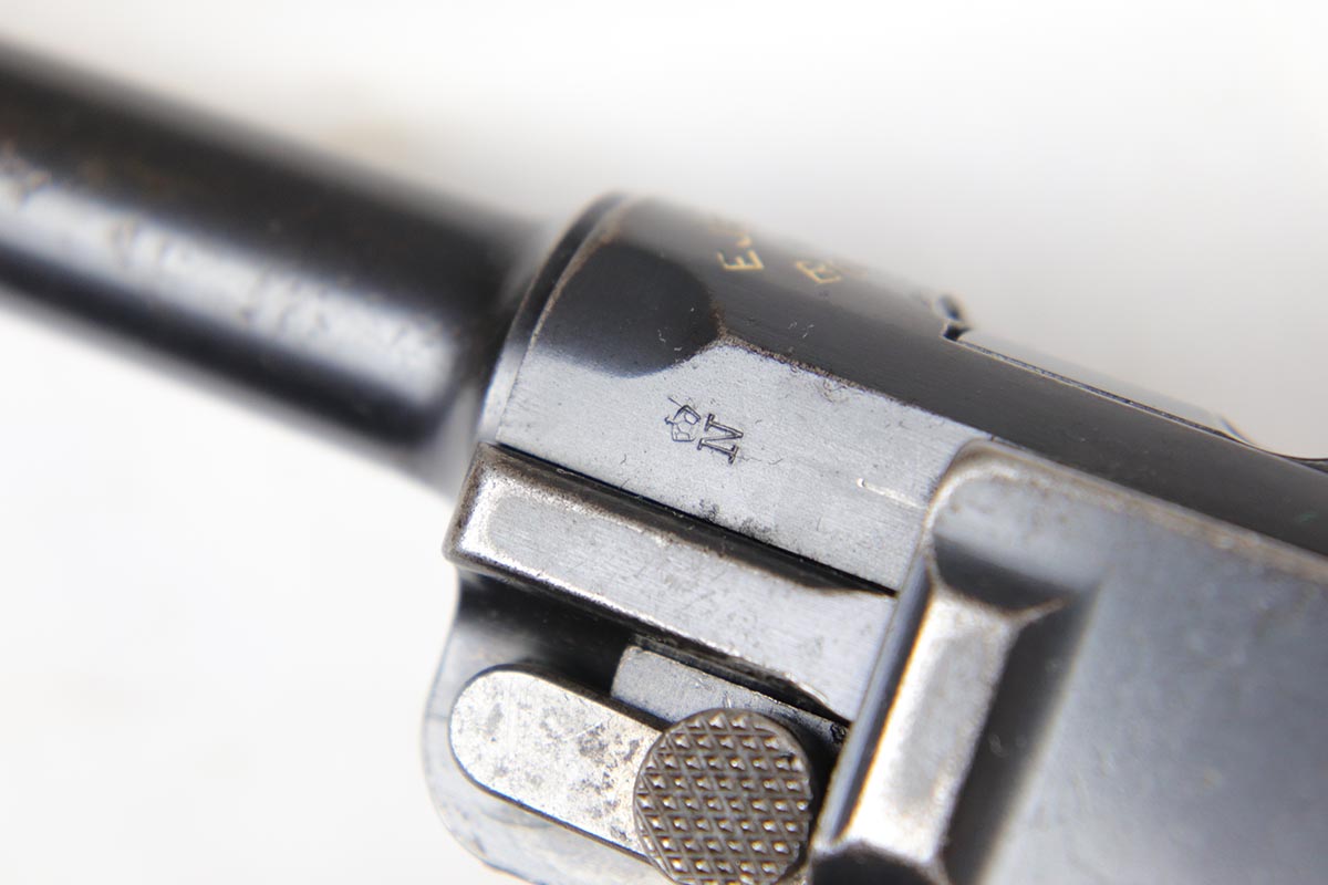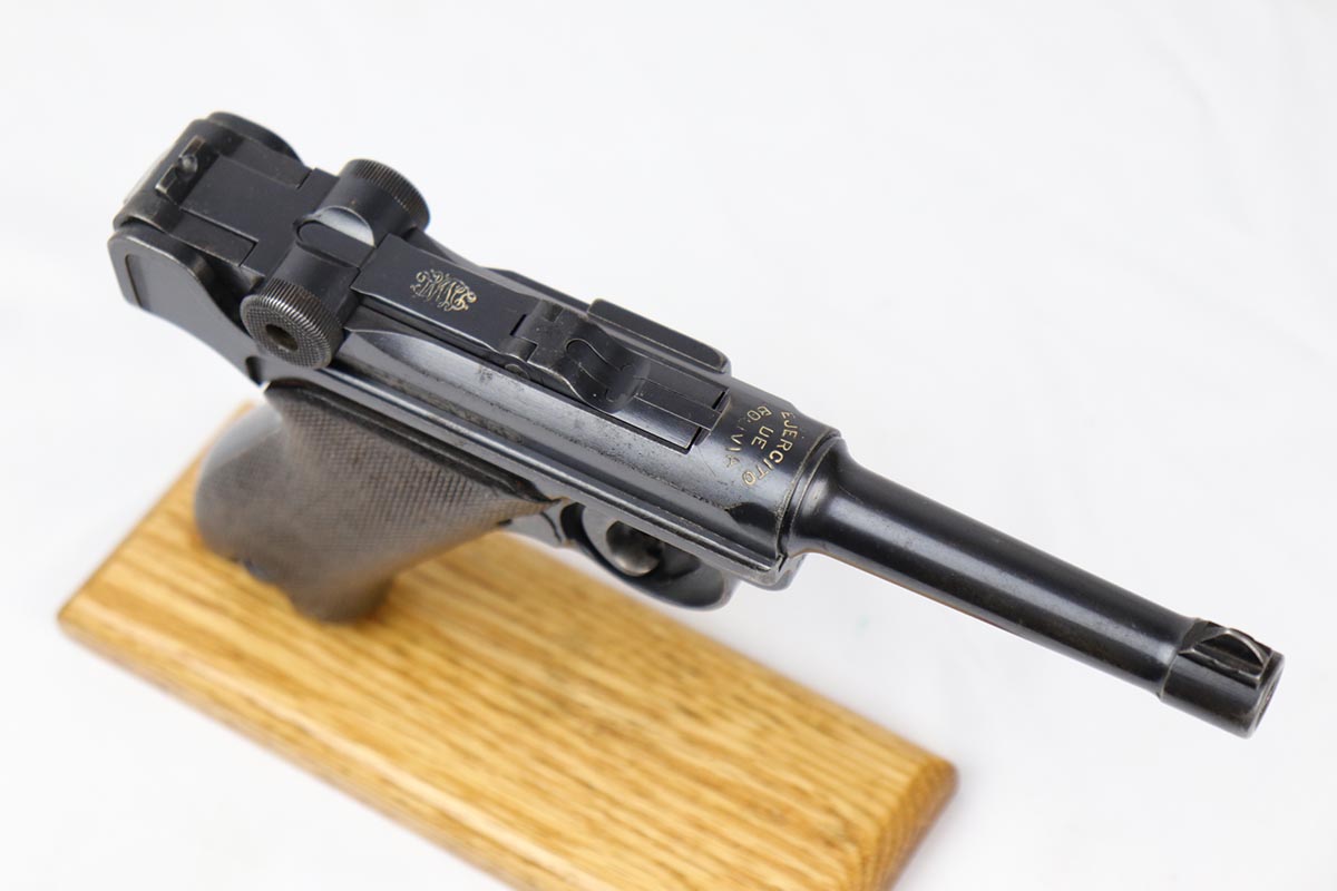 5/15/18 – This is one of the rarest lugers Legacy has ever offered – a Bolivian Contract DWM Model 1908 luger.  This is an excellent example of a supremely rare gun, with an estimated 200 such pistols produced and delivered to the Bolivian Government in 1913, and only six known to exist!  Very few of these pistols survived the Jungle of Bolivia and Costanzo states in “World of Lugers” that “to date only 6 are known”.  This very small contract run falls into the serial number range between; 64400 to 65600 with all know serial number spread over the estimated block of 200 pistols. They were produced using the 1908 Commercial Luger as the basic pistol with some very distinct features found only on these Bolivian contract Lugers. That being they all are without the hold open device, the upper safety area is marked “SEGURO” with the extractor marked “CARGADO” on the left side.  Additionally the chamber area, which usually would have a National Crest is instead roll stamped in three lines: “EJERCITO/DE/BOLIVIA“, e.g “Army of Bolivia“. It has the standard “DWM” logo on the front toggle area. It has the standard “Crown/N” commercial proofs on the left side of the barrel extension, the underside of the barrel, the left side of the breech bolt and front toggle. It is correctly numbered in the commercial manner with the hidden serial numbers, with the full number on the front of the frame and underside of the barrel.  Given the conditions these pistols were subjected to, this one is in excellent condition.  It is all original and correct with 92-93% blue remaining.  There is some finish loss on high edges and the bottom of the front strap.  The grips are unnumbered and the magazine is period correct but numbered to another pistol.  The bore is frosted throughout and the rifling has been smoothed a bit over time, but no major pitting or corrosion.