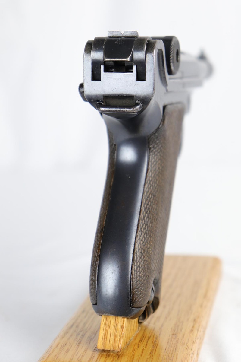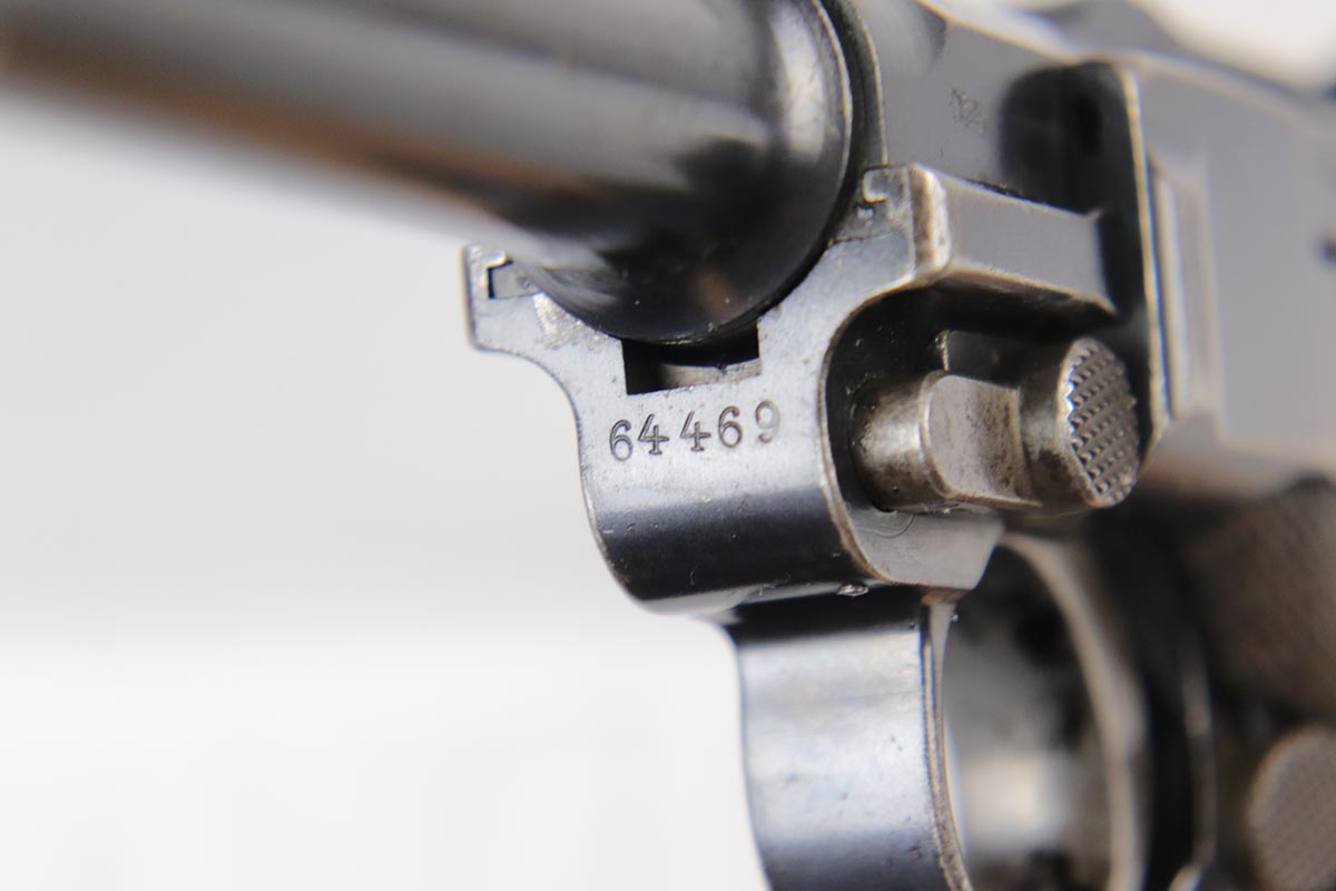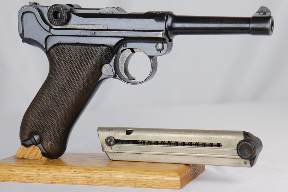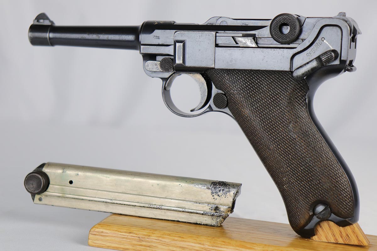 5/15/18 – This is one of the rarest lugers Legacy has ever offered – a Bolivian Contract DWM Model 1908 luger.  This is an excellent example of a supremely rare gun, with an estimated 200 such pistols produced and delivered to the Bolivian Government in 1913, and only six known to exist!  Very few of these pistols survived the Jungle of Bolivia and Costanzo states in “World of Lugers” that “to date only 6 are known”.  This very small contract run falls into the serial number range between; 64400 to 65600 with all know serial number spread over the estimated block of 200 pistols. They were produced using the 1908 Commercial Luger as the basic pistol with some very distinct features found only on these Bolivian contract Lugers. That being they all are without the hold open device, the upper safety area is marked “SEGURO” with the extractor marked “CARGADO” on the left side.  Additionally the chamber area, which usually would have a National Crest is instead roll stamped in three lines: “EJERCITO/DE/BOLIVIA“, e.g “Army of Bolivia“. It has the standard “DWM” logo on the front toggle area. It has the standard “Crown/N” commercial proofs on the left side of the barrel extension, the underside of the barrel, the left side of the breech bolt and front toggle. It is correctly numbered in the commercial manner with the hidden serial numbers, with the full number on the front of the frame and underside of the barrel.  Given the conditions these pistols were subjected to, this one is in excellent condition.  It is all original and correct with 92-93% blue remaining.  There is some finish loss on high edges and the bottom of the front strap.  The grips are unnumbered and the magazine is period correct but numbered to another pistol.  The bore is frosted throughout and the rifling has been smoothed a bit over time, but no major pitting or corrosion.