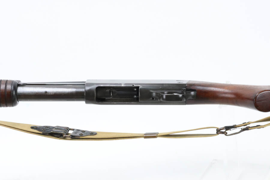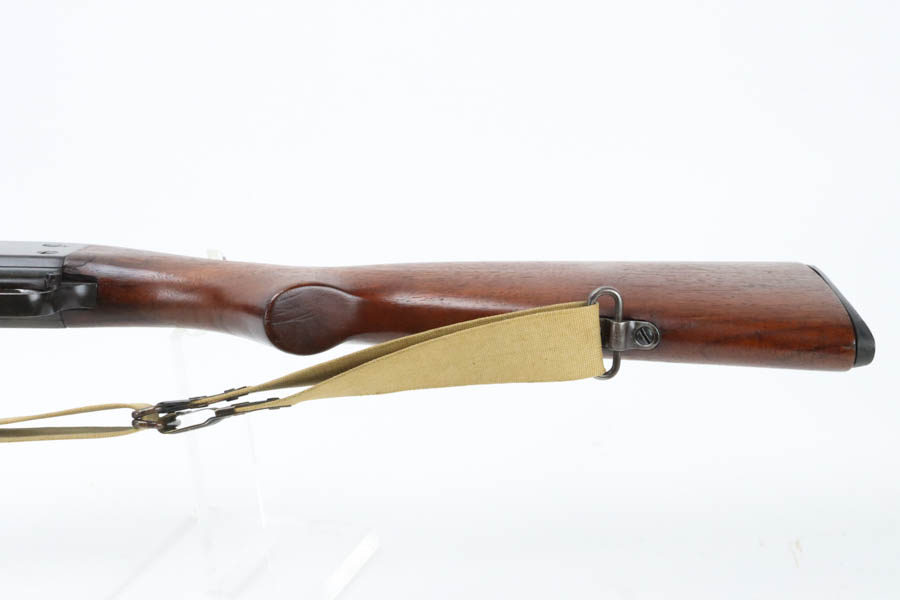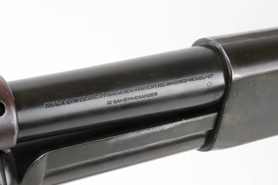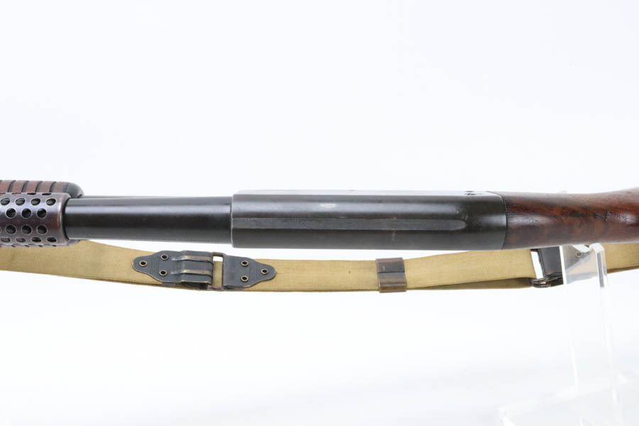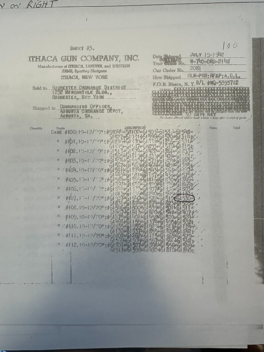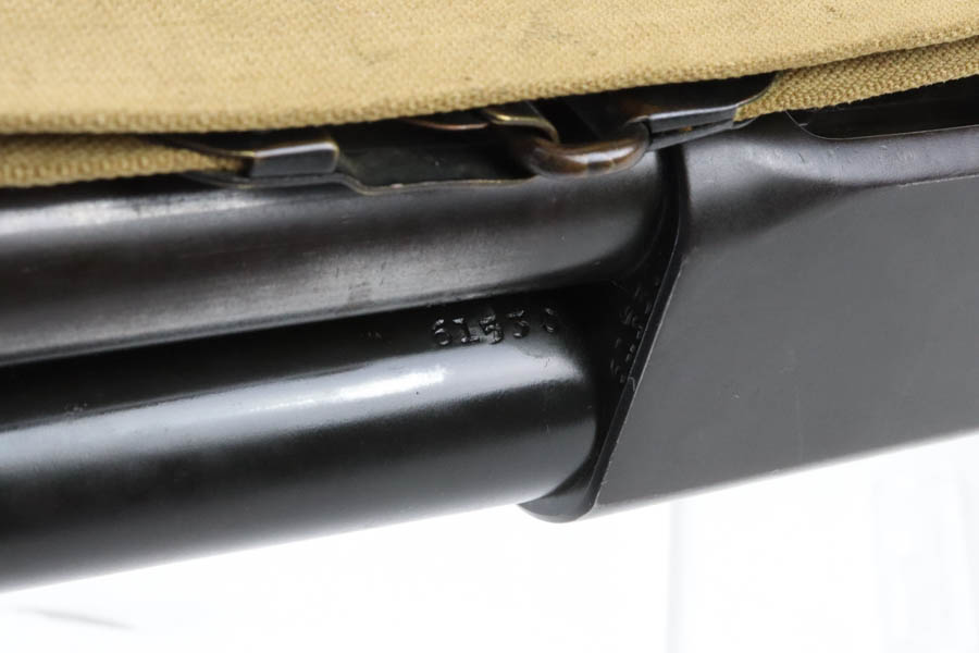 7/11/24 – This is the Holy Grail of the trench shotguns, the Ithaca Model 37 made in 1942. It is estimated that only about 1,400 were issued and far fewer are in collectors hands today. This gun is in the proper serial range of 61038-61856. The barrel and receiver are matching to each other. The original blue rates at around 80%, with the most notable wear on the magazine tube, and some more on the left side of the receiver. Excellent bore. It is maker marked on the barrel as seen in the photos and flaming bomb proofed on the receiver, showing it was accepted into the US Military. It comes with the original heat shield and military bayonet lug. RLB marking on receiver indicates it was inspected by Lt. Col Roy Bowlin. Single brass bead sight on bayonet adaptor. Barrel has 12ga and 2 3/4 inch markings. Plain walnut stock with minor surface crack on left side where the wood meets the receiver. Comes with canvas sling. This gun is also listed in the Ithaca shipping records as going to the commanding office at the Augusta Ordnance Depot on 7/15/1942.