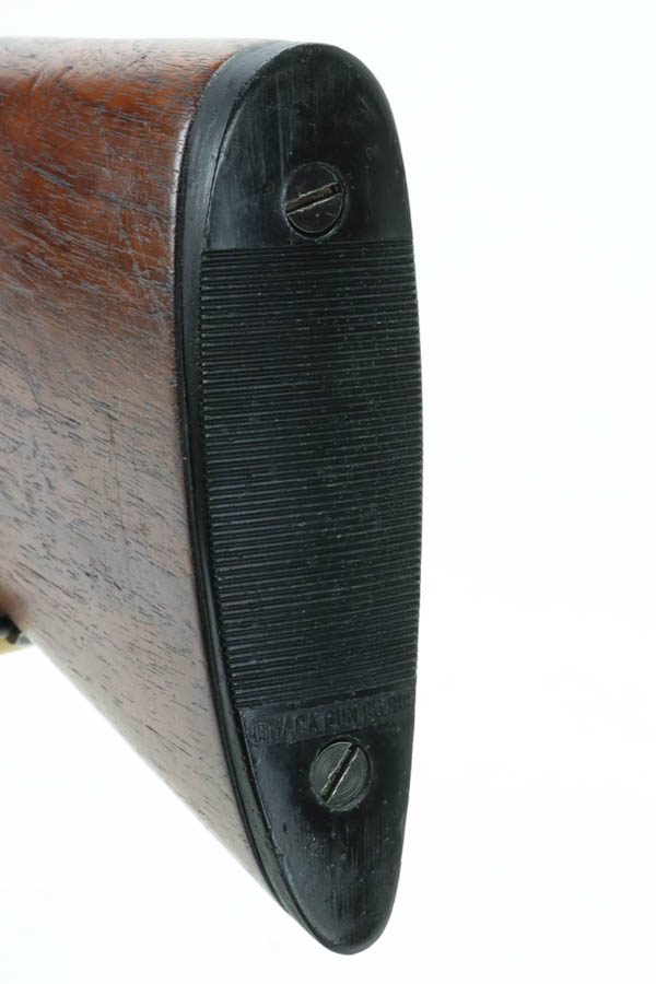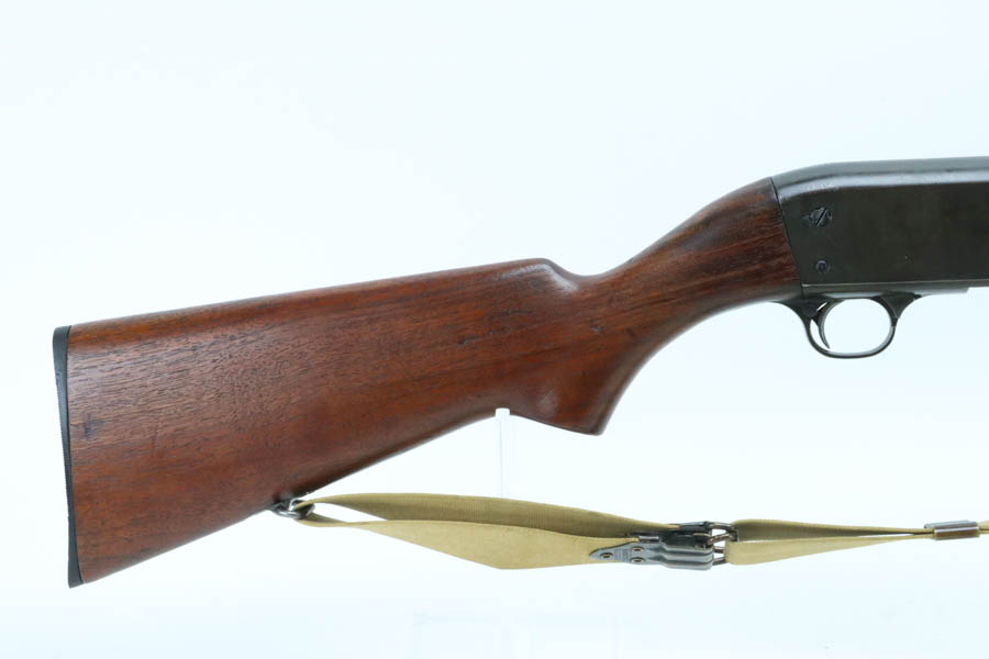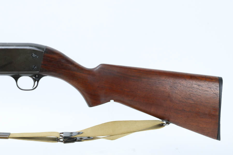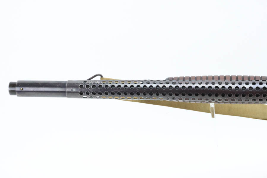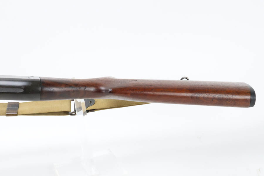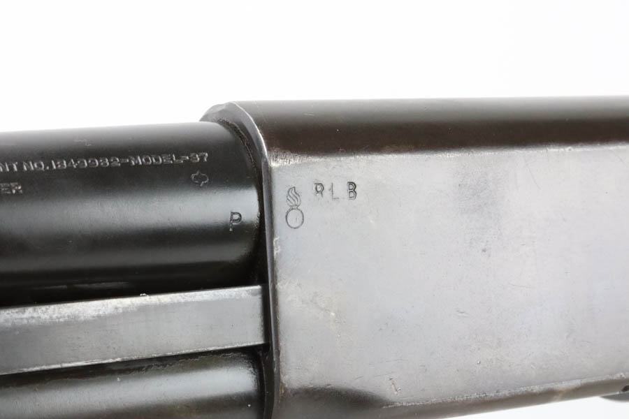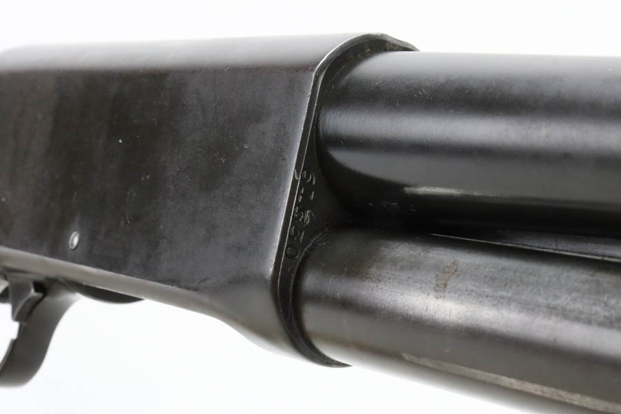 7/11/24 – This is the Holy Grail of the trench shotguns, the Ithaca Model 37 made in 1942. It is estimated that only about 1,400 were issued and far fewer are in collectors hands today. This gun is in the proper serial range of 61038-61856. The barrel and receiver are matching to each other. The original blue rates at around 80%, with the most notable wear on the magazine tube, and some more on the left side of the receiver. Excellent bore. It is maker marked on the barrel as seen in the photos and flaming bomb proofed on the receiver, showing it was accepted into the US Military. It comes with the original heat shield and military bayonet lug. RLB marking on receiver indicates it was inspected by Lt. Col Roy Bowlin. Single brass bead sight on bayonet adaptor. Barrel has 12ga and 2 3/4 inch markings. Plain walnut stock with minor surface crack on left side where the wood meets the receiver. Comes with canvas sling. This gun is also listed in the Ithaca shipping records as going to the commanding office at the Augusta Ordnance Depot on 7/15/1942.