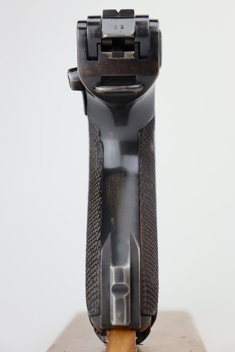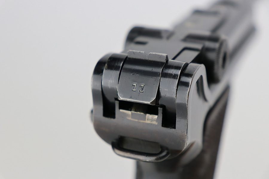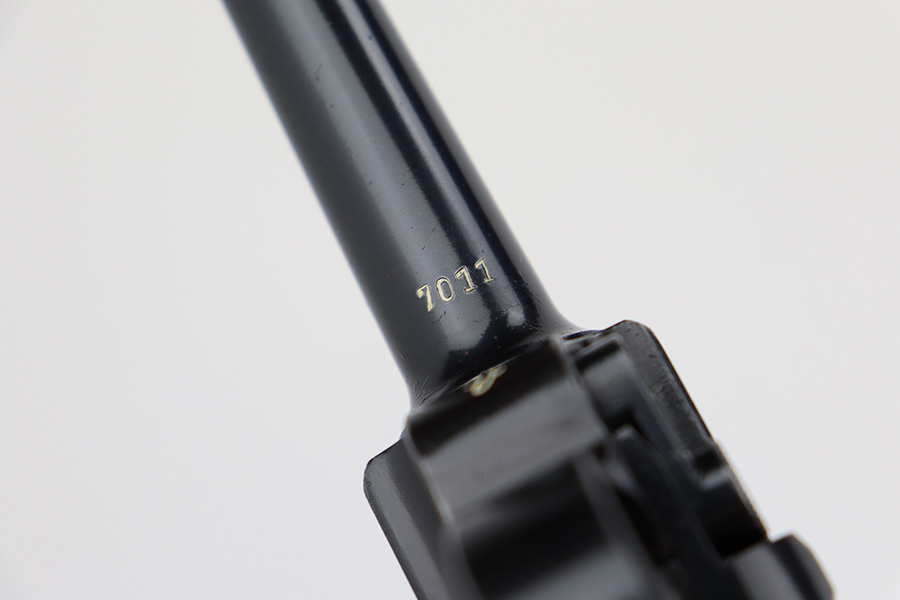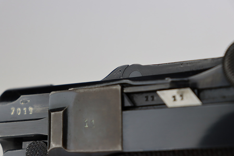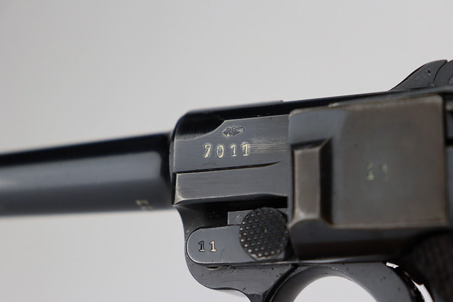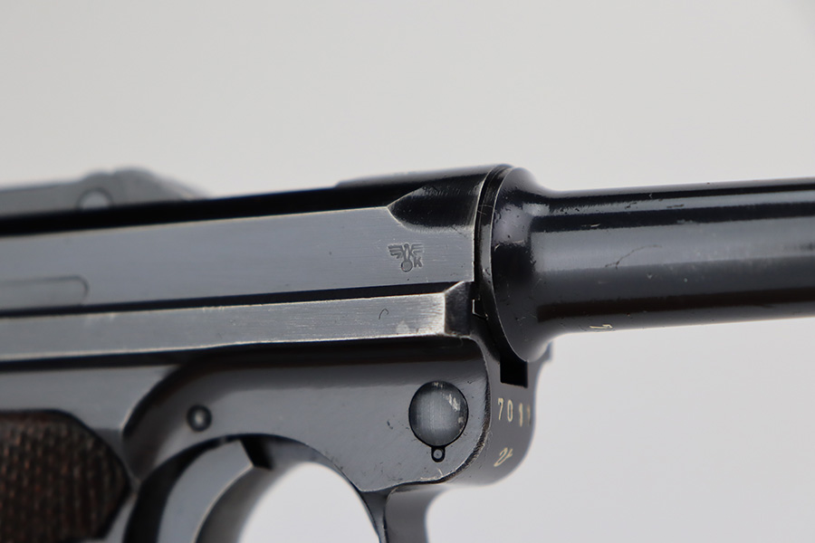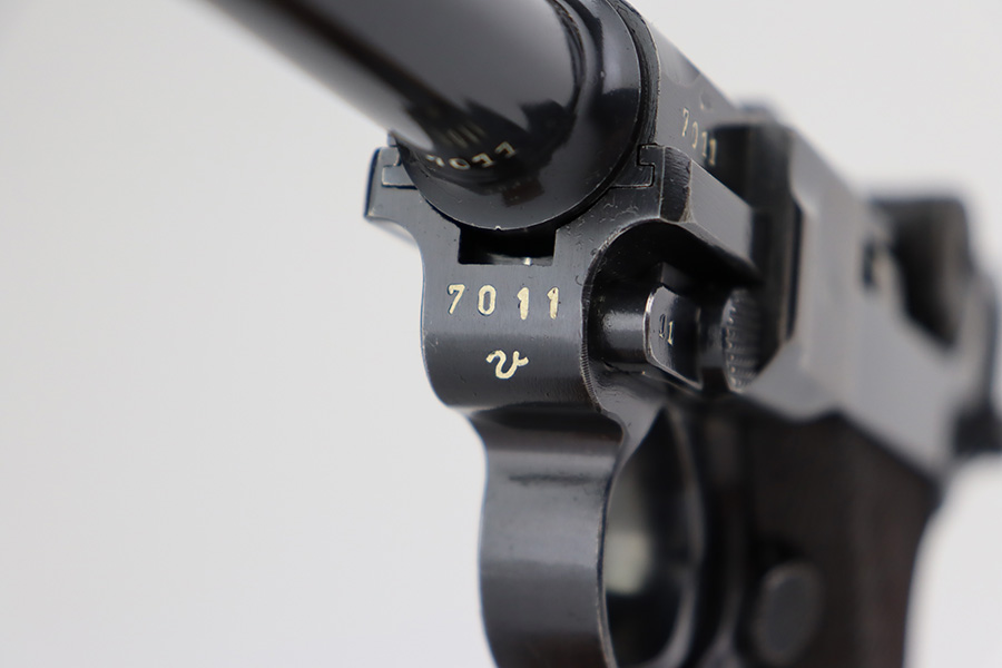 7/28/23 – This is an extremely rare Mauser Banner Luger from 1938, with Eagle/K police inspection stamp on receiver. This the is the rarest of all the police Mauser Banner Lugers, with only 275 produced! And not only that, but this one is only 3 digits after the earliest reported serial, so nearly the first one ever issued! All numbers on the pistol match, including the grips and magazine. The bluing rates at around 90% but there is some cold blue touch up on the sideplate, and the sideplate/muzzle account for most of the wear. Mint bore. Nice grips with minor handling wear but no chips.