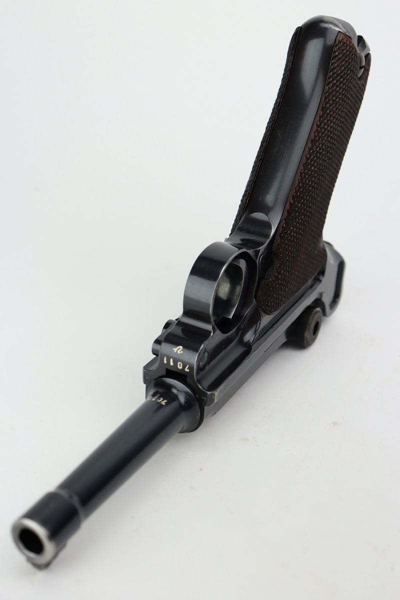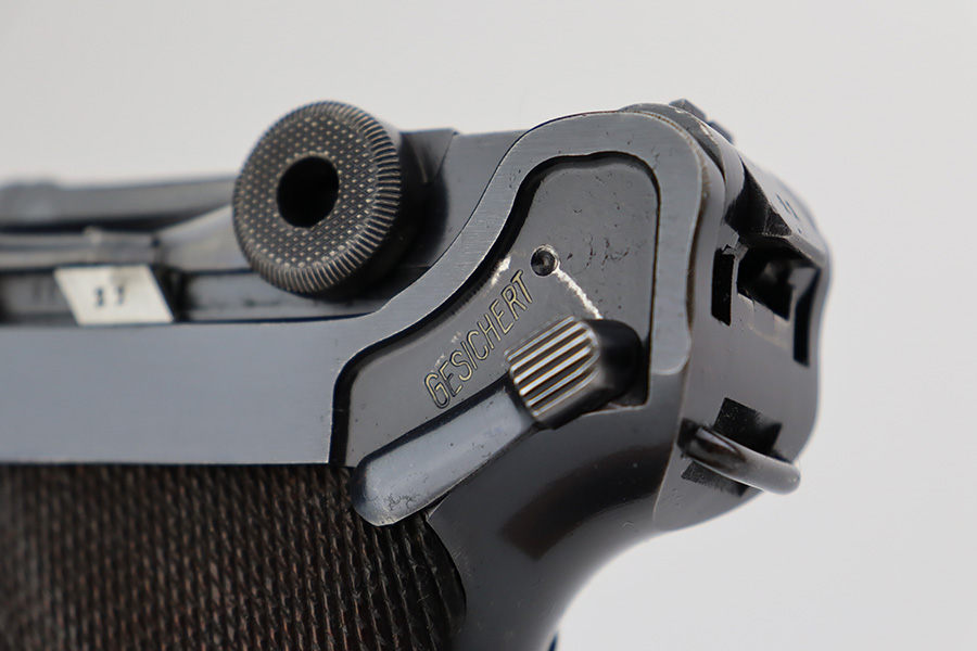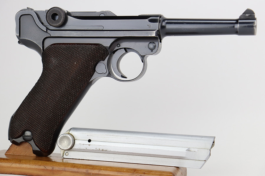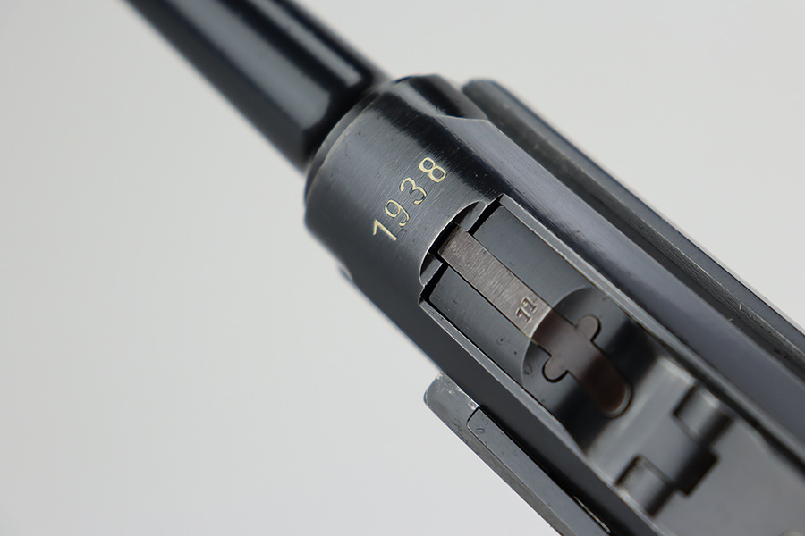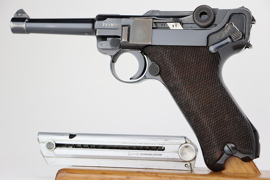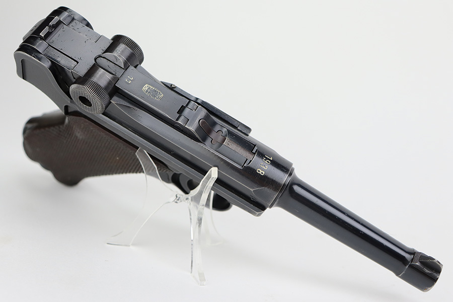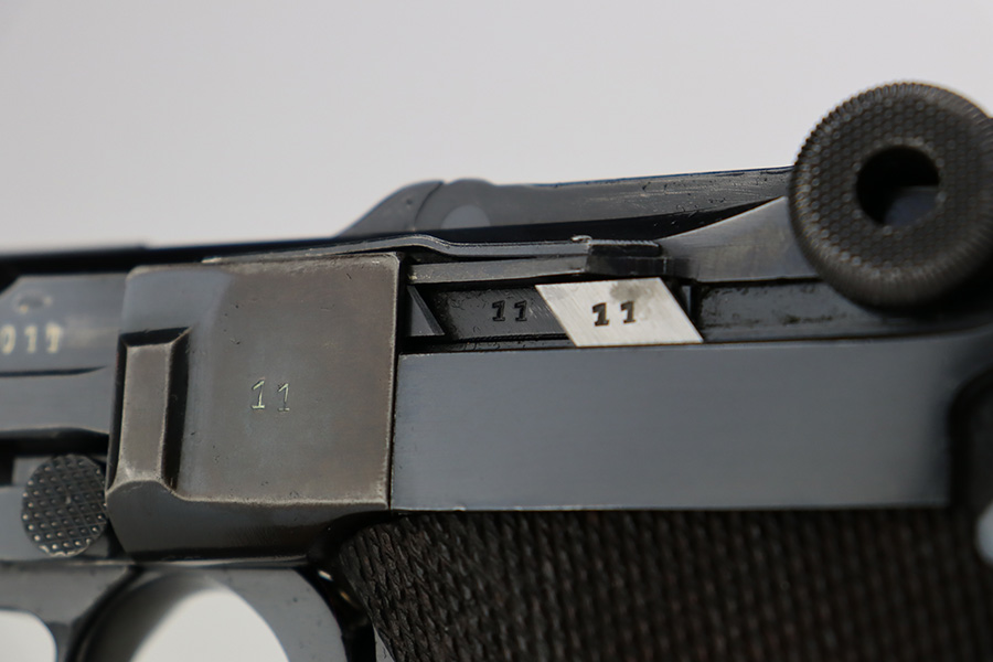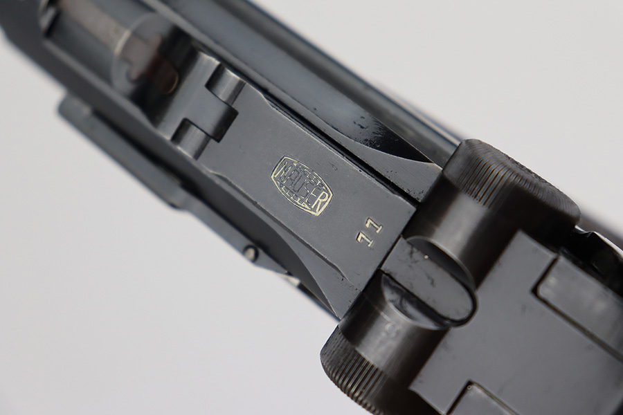 7/28/23 – This is an extremely rare Mauser Banner Luger from 1938, with Eagle/K police inspection stamp on receiver. This the is the rarest of all the police Mauser Banner Lugers, with only 275 produced! And not only that, but this one is only 3 digits after the earliest reported serial, so nearly the first one ever issued! All numbers on the pistol match, including the grips and magazine. The bluing rates at around 90% but there is some cold blue touch up on the sideplate, and the sideplate/muzzle account for most of the wear. Mint bore. Nice grips with minor handling wear but no chips.