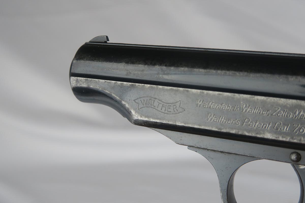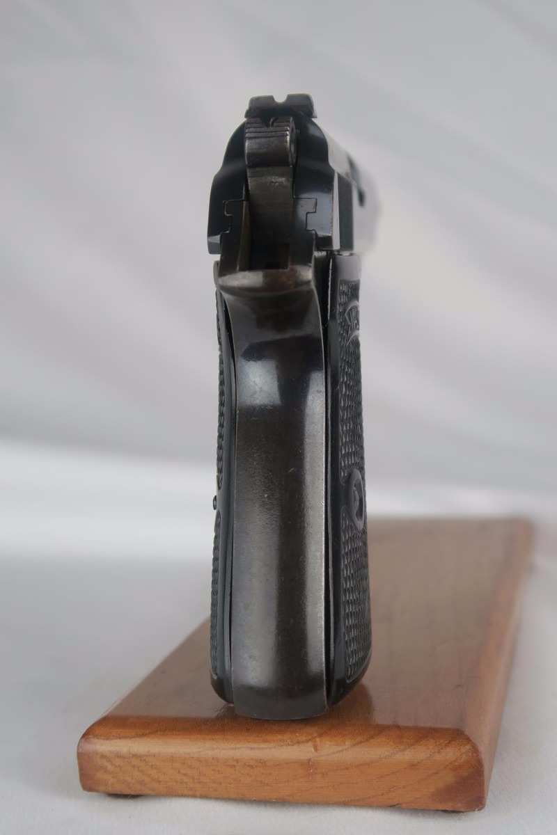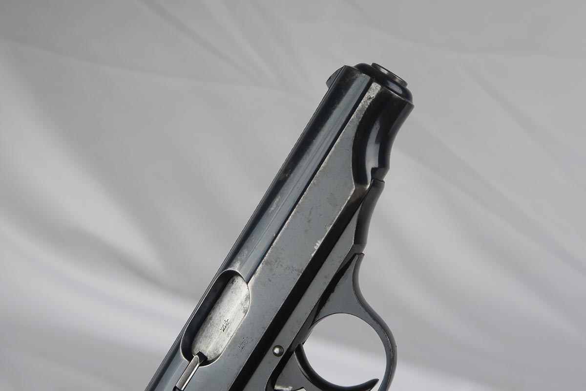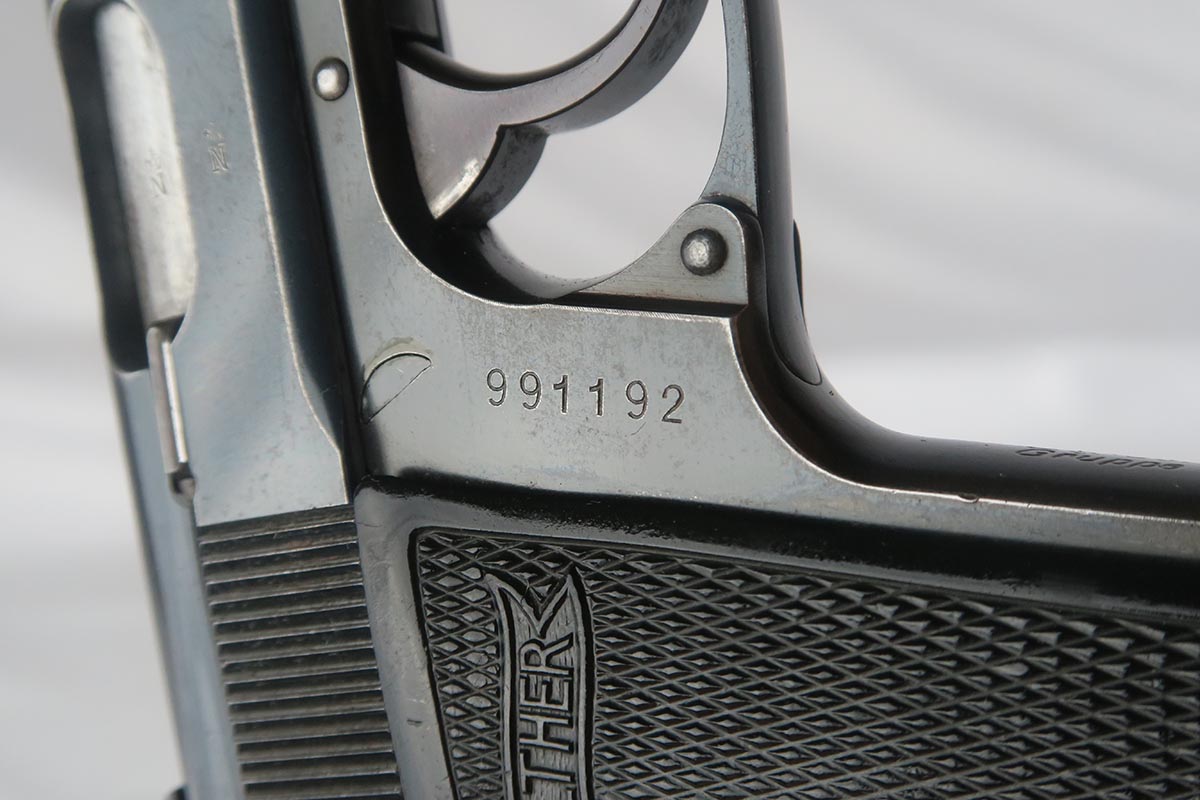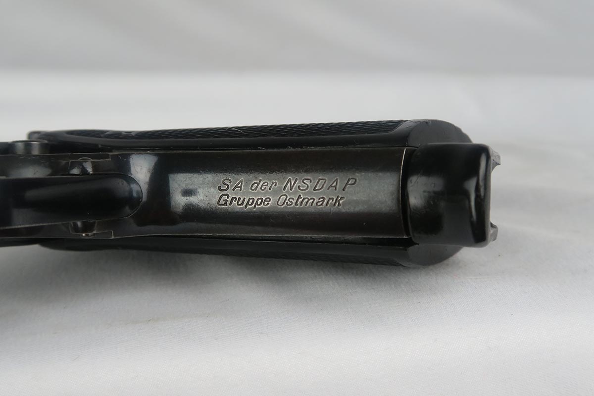 9/21/17 – This is an extremely rare Walther PP that was issued to Gruppe Ostmark of the SA. This is one of only three such pistols that are known! It is all original and correct with about 90% blue remaining. The majority of the finish loss is on the left side of the slide, but the straps do show notable browning. The left grip panel has a few dings but the grips have no cracks or chips. Crown/N proofs on slide and frame. Nice finger extension magazine. Excellent bore.