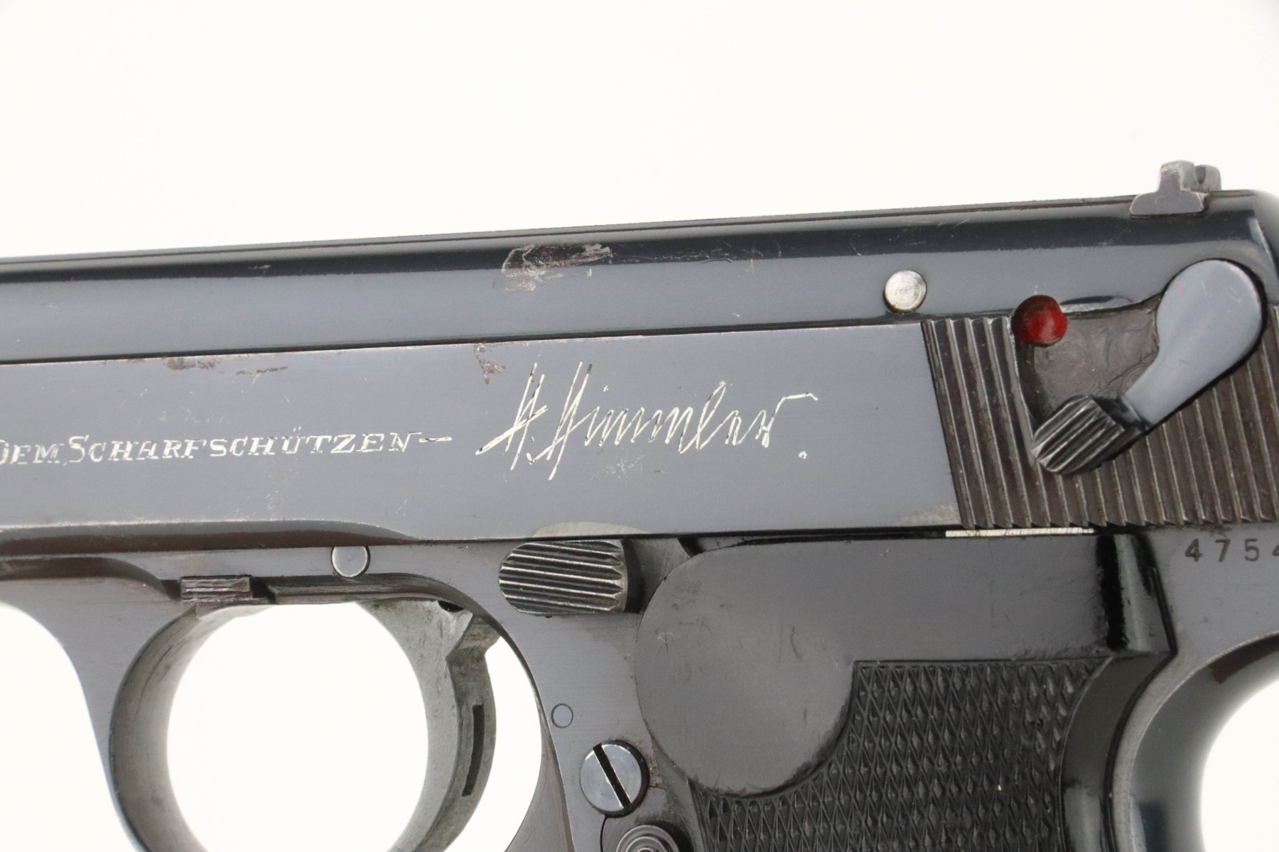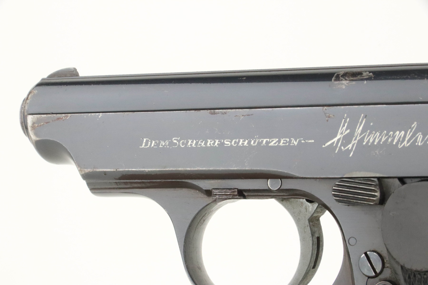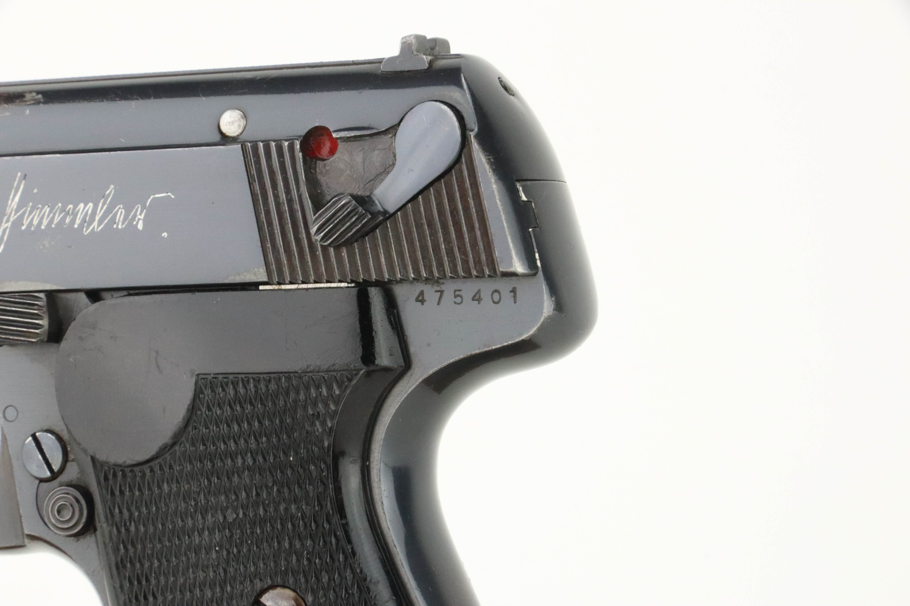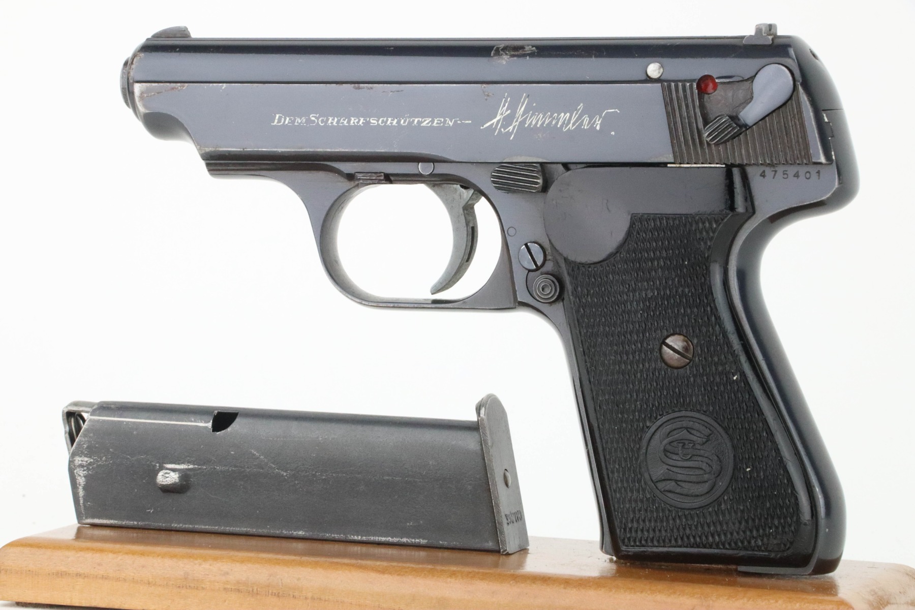 8/29/24 – This is an extremely rare late production Model 38H J. P. Sauer & Sohn “Heinrich Himmler” shooting prize presentation pistol. These pistols were purportedly presented to German snipers for 100 confirmed kills. One was actually captured at Hitler’s Berchtesgaden home. The known, recorded serial block of documented examples runs from 475396-475412. Serial 475400 is documented in Cate’s Sauer book, and this example is one digit off from that firearm. There are five known examples, and the last few public sales have all gone at RIA for more than $80k! This Model 38 has the high-polish blue finish with the presentation inscription on the left side of the slide. The bluing rates at 90+% with the most notable patches of wear on the right rear slide and the middle of the right side face of the slide. Also a small patch of wear/surface scratches on the rounded left side of the slide. The left side of the slide is inscribed: “Dem Scarfschutzen-” followed by an engraved facsimile of the signature “H. Himmler”. The right side of the slide has the standard late production, two line factory legend “J.P. Sauer & Sohn, Suhl/ Cal. 7.65”, which is exactly the opposite side of standard production pistols. Slide is internally numbered and matching to the frame. The pistol has checkered, black plastic grips with the encircled Sauer monogram on the left grip. The frame is serial numbered on the left side below the slide serrations. It has the “eagle/N” proofmarks on the right rear side of the frame and slide and on the very front edge of the barrel. It comes complete with one magazine that has a dull blued finish that is marked on the rear edge of the floorplate “CAL,.7.65”.