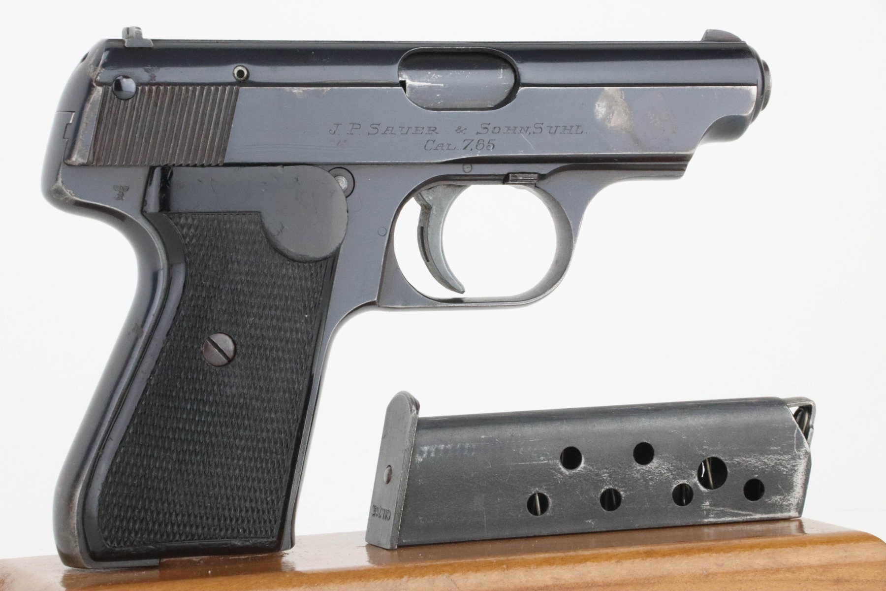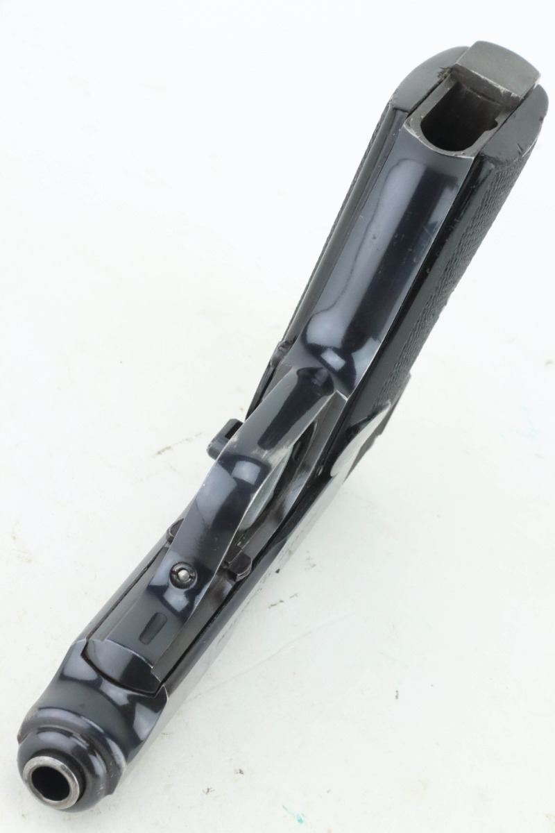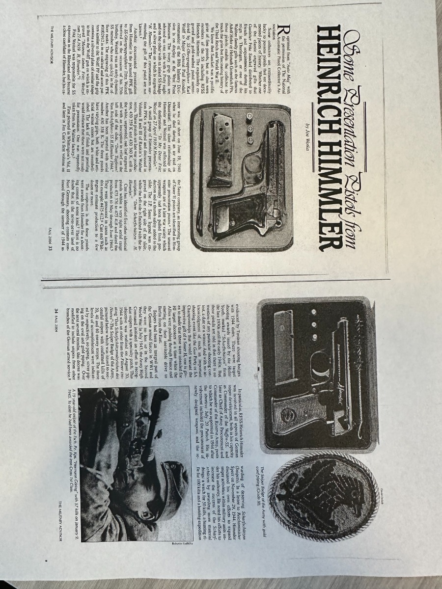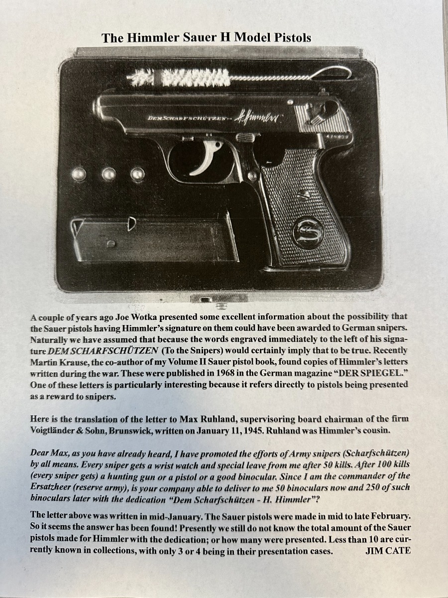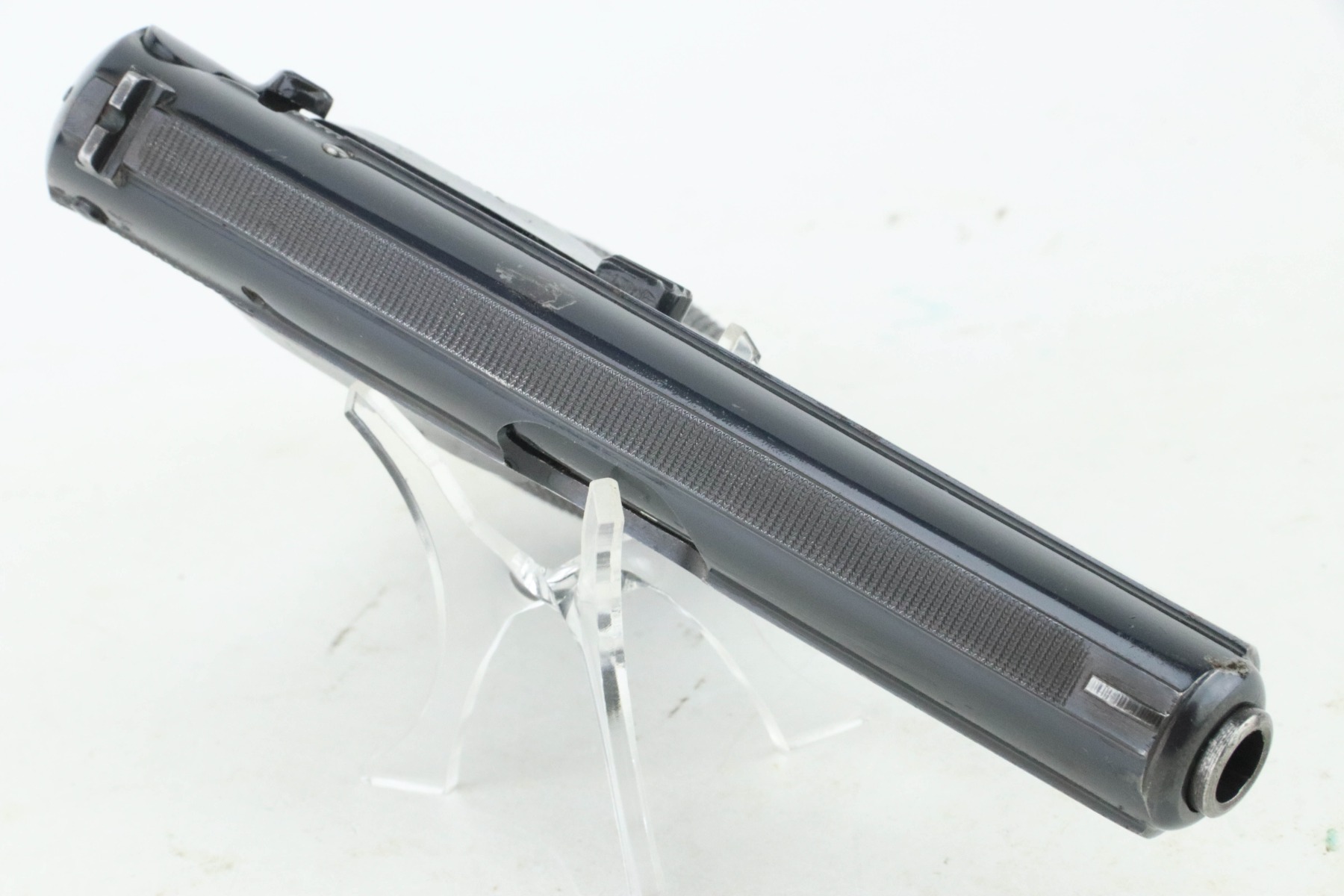 8/29/24 – This is an extremely rare late production Model 38H J. P. Sauer & Sohn “Heinrich Himmler” shooting prize presentation pistol. These pistols were purportedly presented to German snipers for 100 confirmed kills. One was actually captured at Hitler’s Berchtesgaden home. The known, recorded serial block of documented examples runs from 475396-475412. Serial 475400 is documented in Cate’s Sauer book, and this example is one digit off from that firearm. There are five known examples, and the last few public sales have all gone at RIA for more than $80k! This Model 38 has the high-polish blue finish with the presentation inscription on the left side of the slide. The bluing rates at 90+% with the most notable patches of wear on the right rear slide and the middle of the right side face of the slide. Also a small patch of wear/surface scratches on the rounded left side of the slide. The left side of the slide is inscribed: “Dem Scarfschutzen-” followed by an engraved facsimile of the signature “H. Himmler”. The right side of the slide has the standard late production, two line factory legend “J.P. Sauer & Sohn, Suhl/ Cal. 7.65”, which is exactly the opposite side of standard production pistols. Slide is internally numbered and matching to the frame. The pistol has checkered, black plastic grips with the encircled Sauer monogram on the left grip. The frame is serial numbered on the left side below the slide serrations. It has the “eagle/N” proofmarks on the right rear side of the frame and slide and on the very front edge of the barrel. It comes complete with one magazine that has a dull blued finish that is marked on the rear edge of the floorplate “CAL,.7.65”.