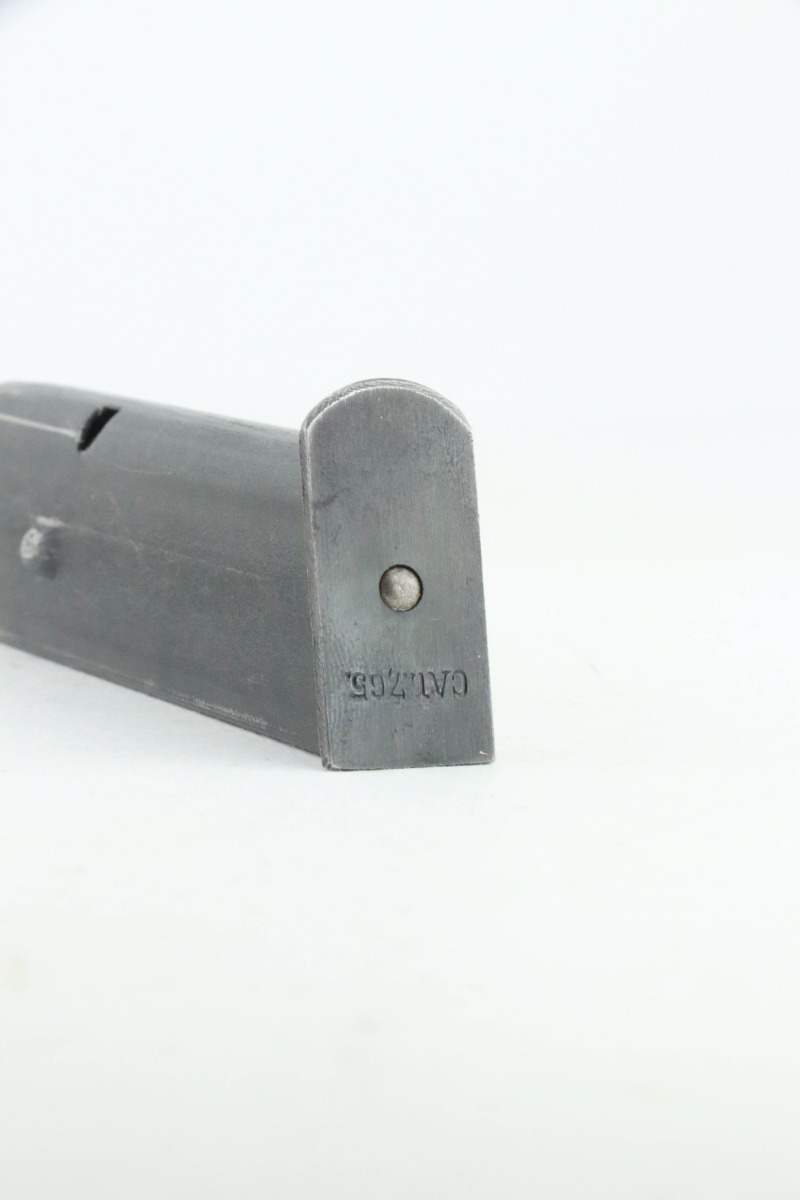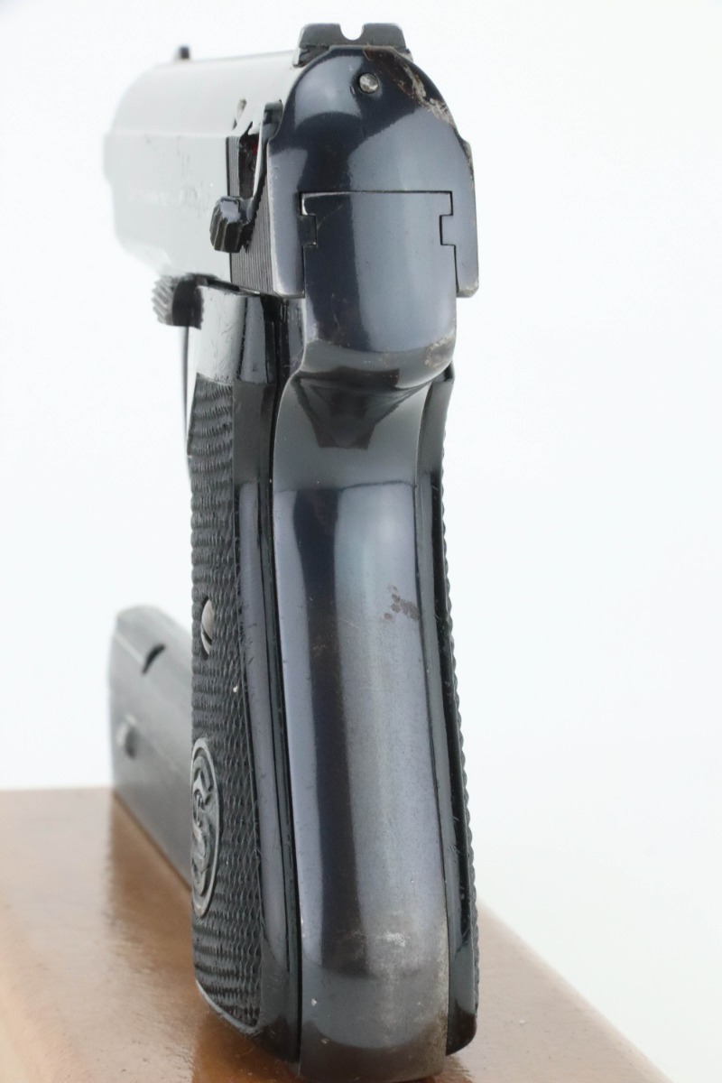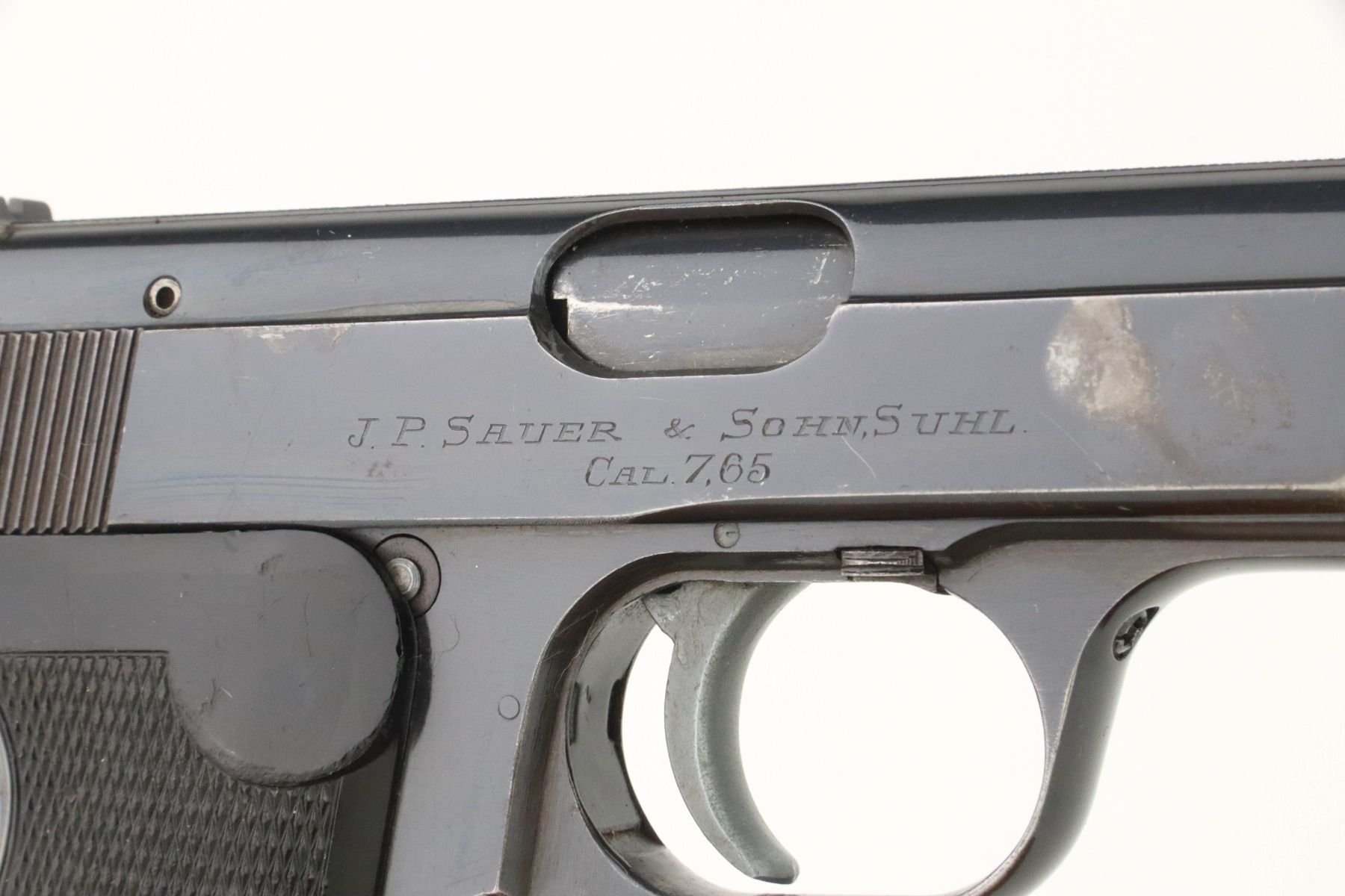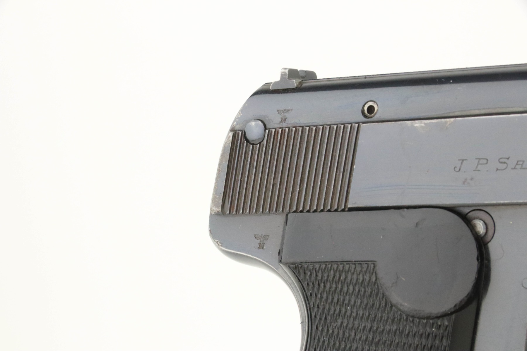 8/29/24 – This is an extremely rare late production Model 38H J. P. Sauer & Sohn “Heinrich Himmler” shooting prize presentation pistol. These pistols were purportedly presented to German snipers for 100 confirmed kills. One was actually captured at Hitler’s Berchtesgaden home. The known, recorded serial block of documented examples runs from 475396-475412. Serial 475400 is documented in Cate’s Sauer book, and this example is one digit off from that firearm. There are five known examples, and the last few public sales have all gone at RIA for more than $80k! This Model 38 has the high-polish blue finish with the presentation inscription on the left side of the slide. The bluing rates at 90+% with the most notable patches of wear on the right rear slide and the middle of the right side face of the slide. Also a small patch of wear/surface scratches on the rounded left side of the slide. The left side of the slide is inscribed: “Dem Scarfschutzen-” followed by an engraved facsimile of the signature “H. Himmler”. The right side of the slide has the standard late production, two line factory legend “J.P. Sauer & Sohn, Suhl/ Cal. 7.65”, which is exactly the opposite side of standard production pistols. Slide is internally numbered and matching to the frame. The pistol has checkered, black plastic grips with the encircled Sauer monogram on the left grip. The frame is serial numbered on the left side below the slide serrations. It has the “eagle/N” proofmarks on the right rear side of the frame and slide and on the very front edge of the barrel. It comes complete with one magazine that has a dull blued finish that is marked on the rear edge of the floorplate “CAL,.7.65”.