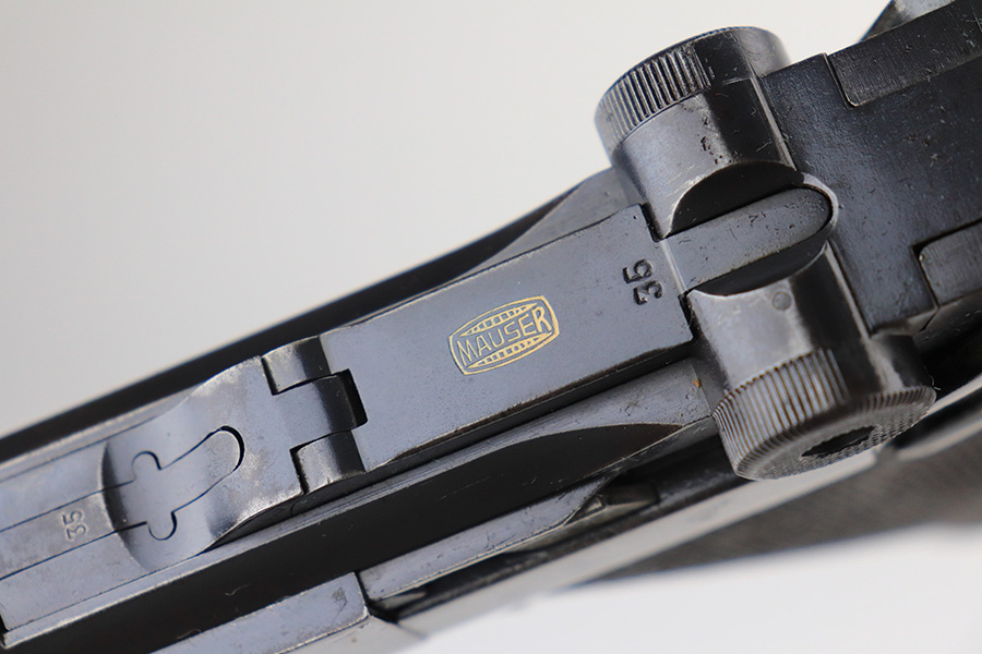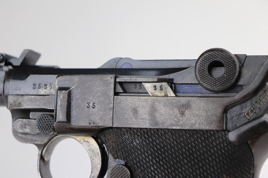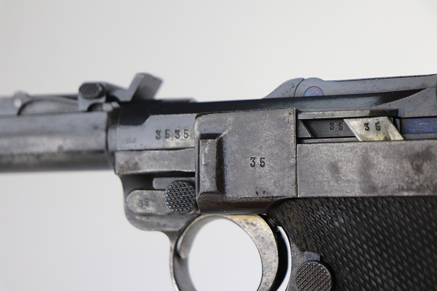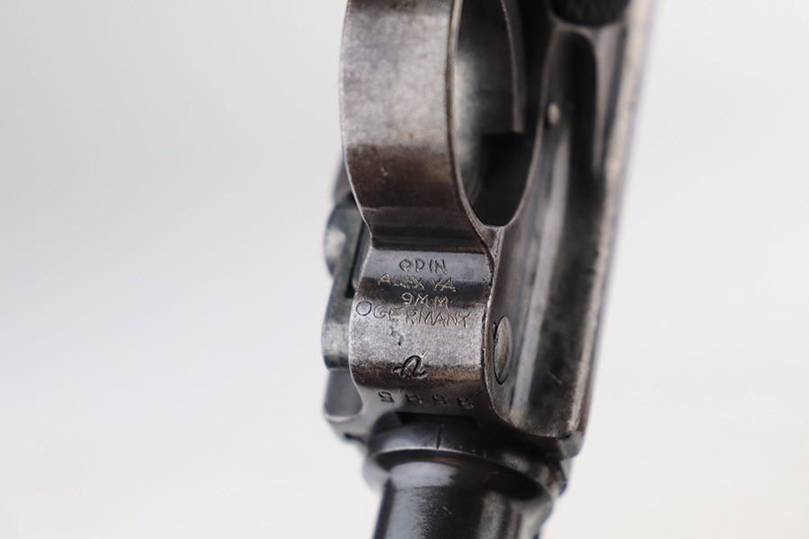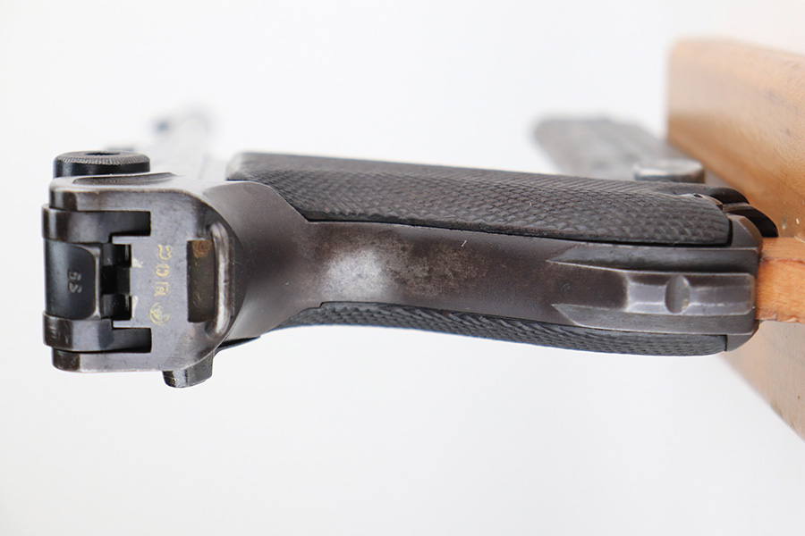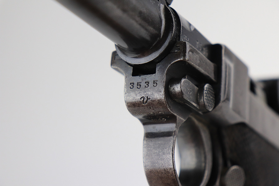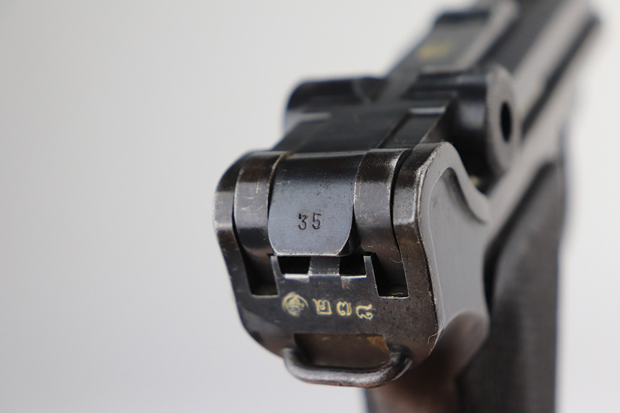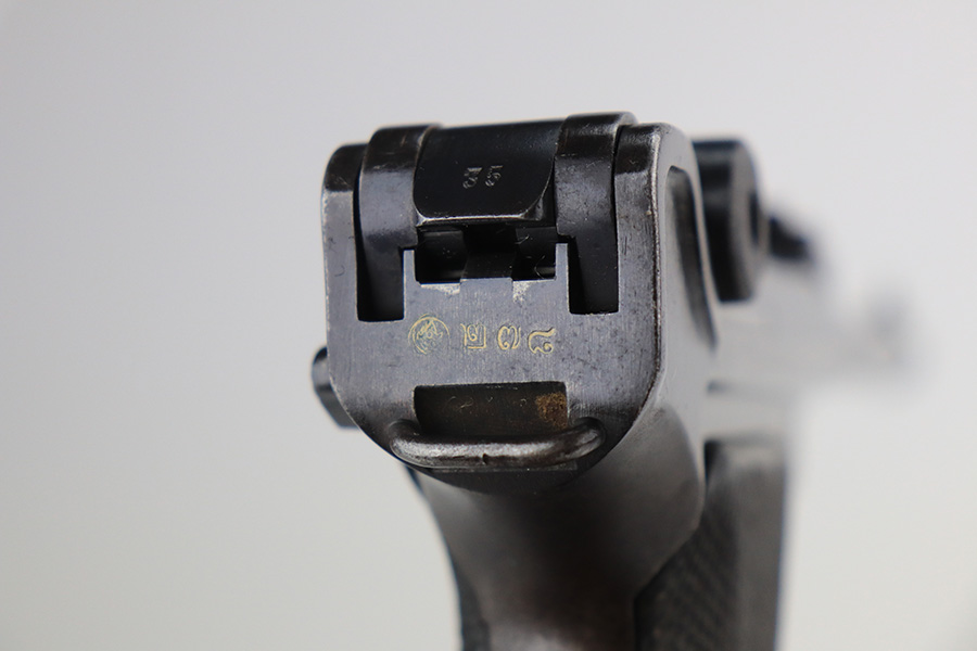 2/24/22 – This is an original example of an extraordinarily rare Thai Artillery Mauser Banner Luger from 1936 with rare, original matching stock. These are potentially the most rare Artillery Luger variants ever produced, with only 100 ordered by the Royal Thai Police, according to Ralph Shattuck’s book. The serial range runs from 3453v-3552v and this one falls within that known range. This one has matching numbers throughout, including the original magazine. All these Thai Lugers have Siamese (Thai) numbers stamped on the rear of the frame, showing unit numbers in Thai. Each Luger also has the original Thai Police seal stamped in the same area. These guns also saw extensive use so are generally found in worn condition, and this one is no different. There is thinning/patina throughout, and some pitting on the sideplate and right side rail. The bore is generally shiny with strong rifling, and minor signs of use. The grips have some smoothing and handling wear but no cracks or chips. The stock has the matching serial number of the gun on the wood, and there’s an adhered message in another language (presumably Thai?) that we can’t translate/make out. The stock is in very good condition overall, with no cracks.