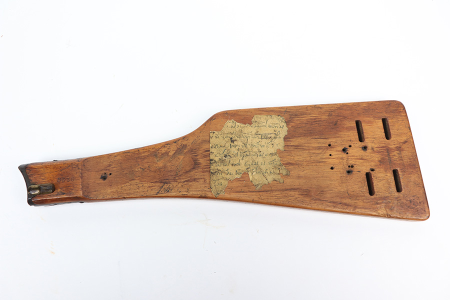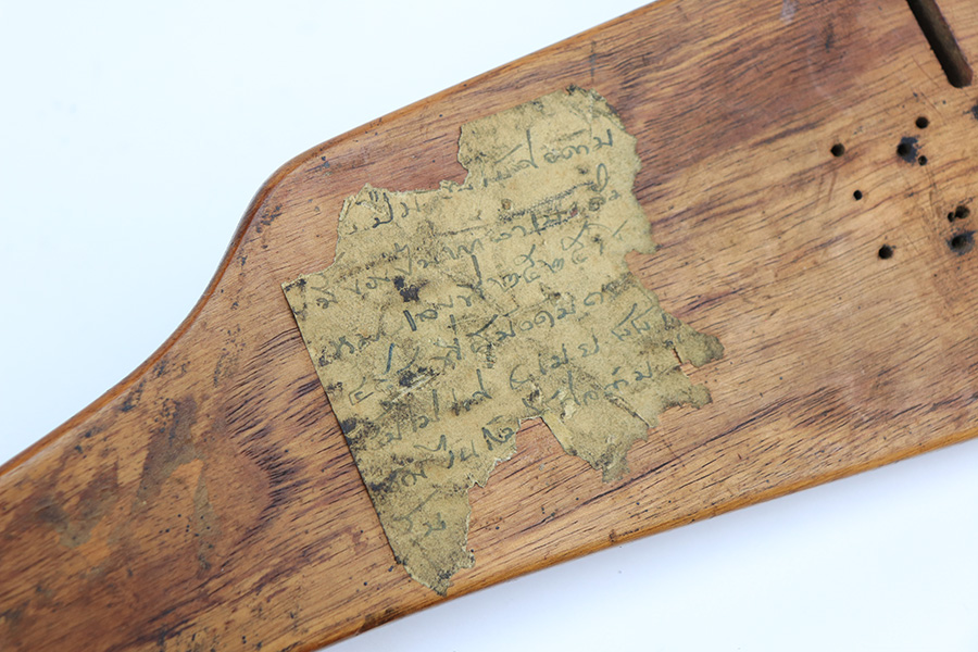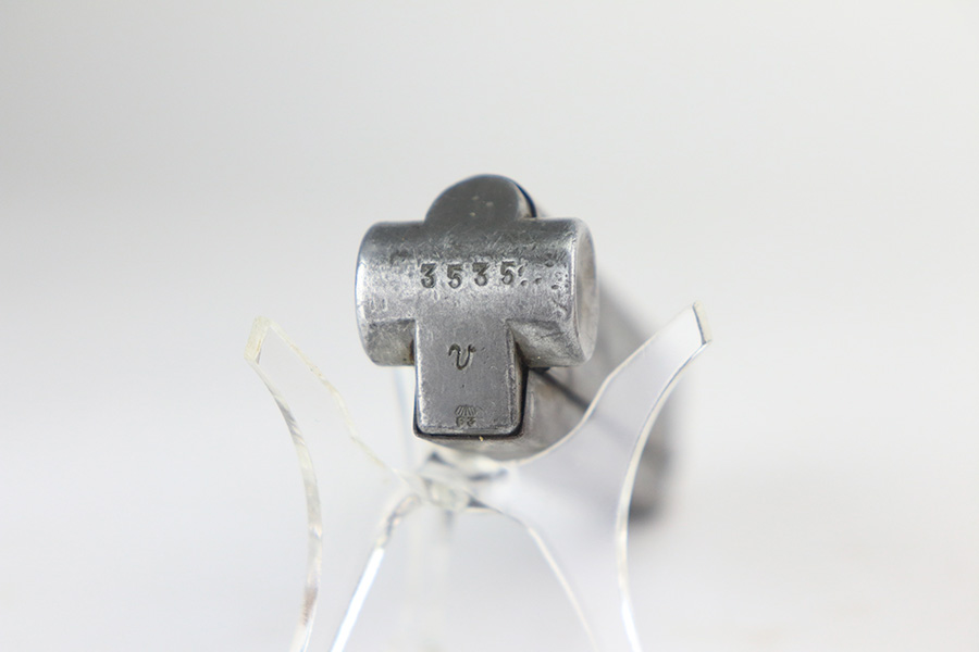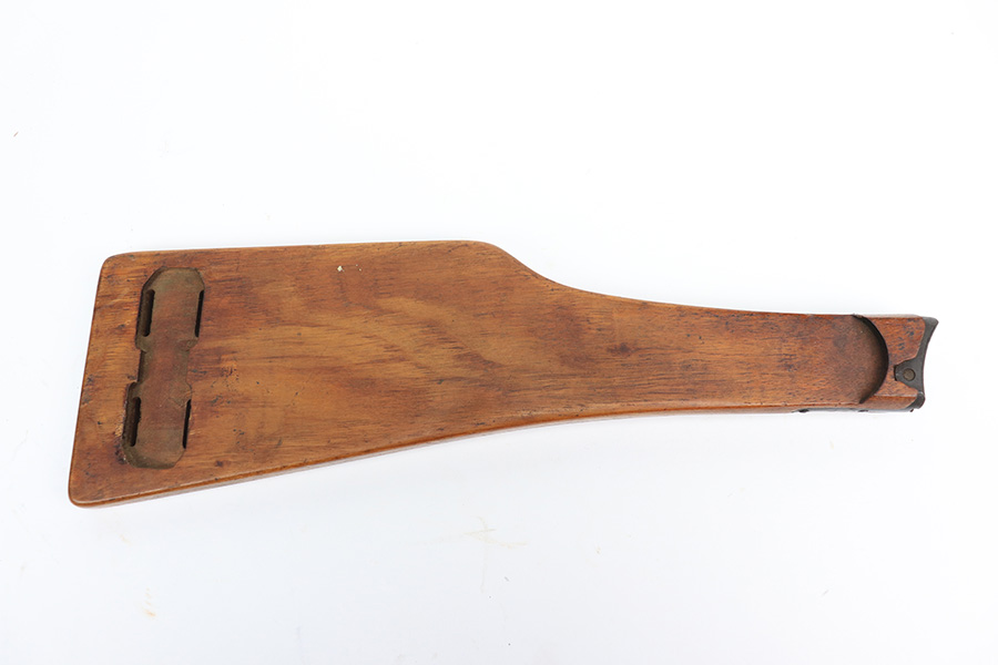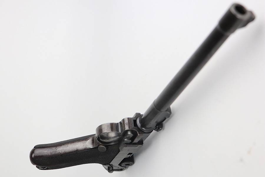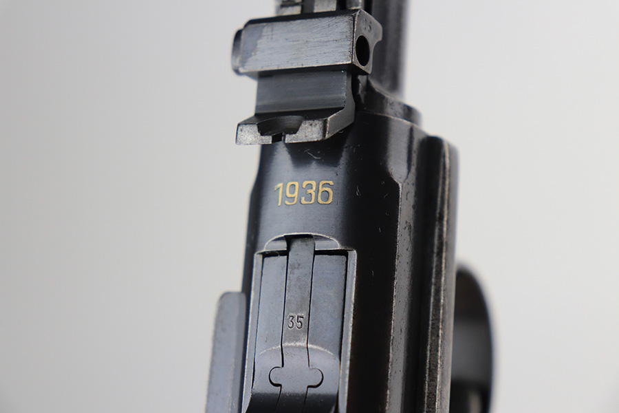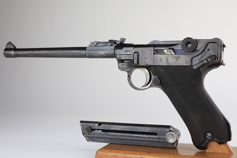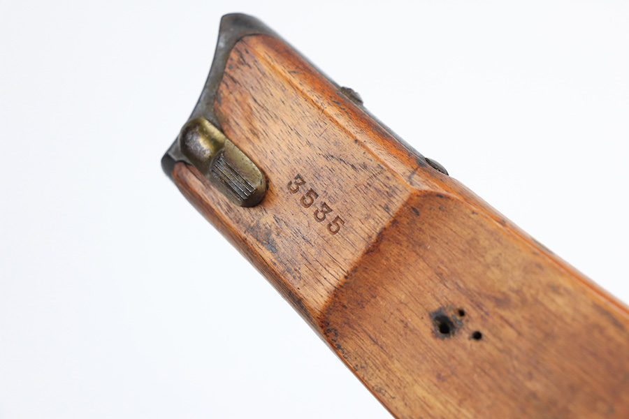 2/24/22 – This is an original example of an extraordinarily rare Thai Artillery Mauser Banner Luger from 1936 with rare, original matching stock. These are potentially the most rare Artillery Luger variants ever produced, with only 100 ordered by the Royal Thai Police, according to Ralph Shattuck’s book. The serial range runs from 3453v-3552v and this one falls within that known range. This one has matching numbers throughout, including the original magazine. All these Thai Lugers have Siamese (Thai) numbers stamped on the rear of the frame, showing unit numbers in Thai. Each Luger also has the original Thai Police seal stamped in the same area. These guns also saw extensive use so are generally found in worn condition, and this one is no different. There is thinning/patina throughout, and some pitting on the sideplate and right side rail. The bore is generally shiny with strong rifling, and minor signs of use. The grips have some smoothing and handling wear but no cracks or chips. The stock has the matching serial number of the gun on the wood, and there’s an adhered message in another language (presumably Thai?) that we can’t translate/make out. The stock is in very good condition overall, with no cracks.