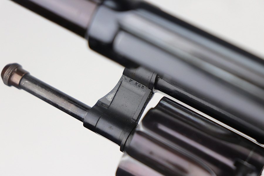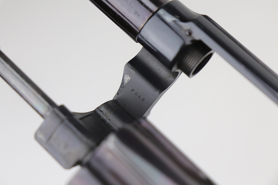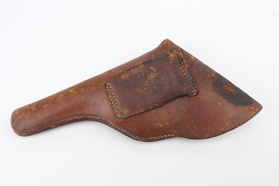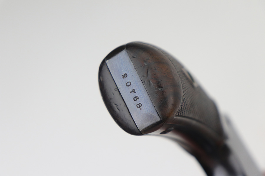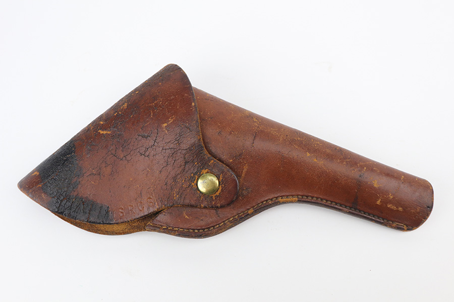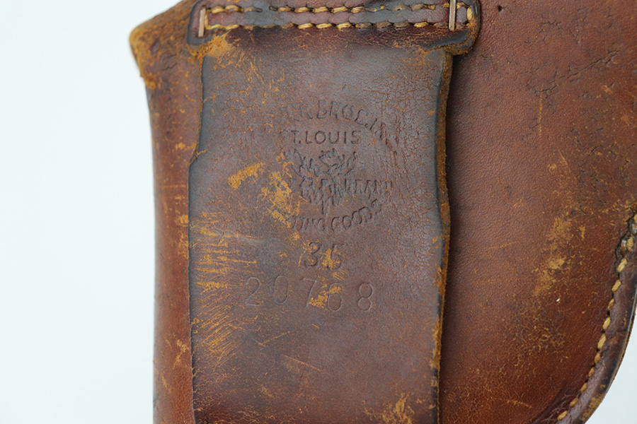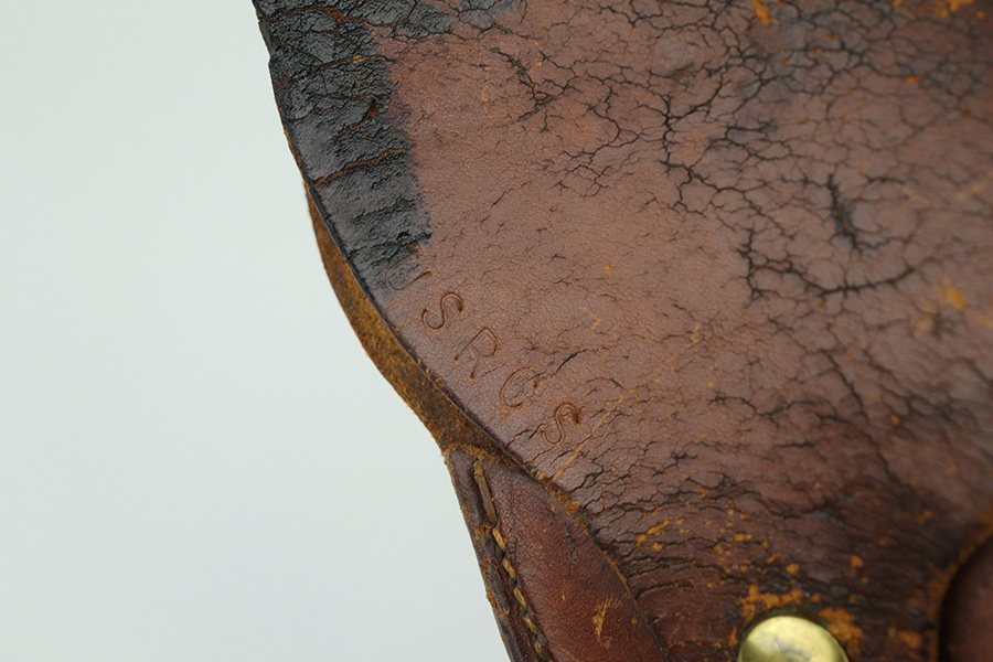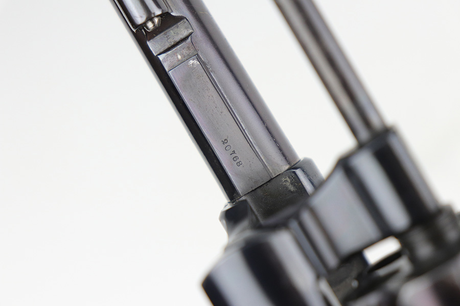 2/24/22 – This is an extraordinarily rare and perhaps one-of-a-kind Smith & Wesson Model 1902 that was part of a very small contract order by the United States Revenue Cutter Service, a precursor to the U.S. Coast Guard. The Smith & Wesson book by Supica & Nahas documents the accepted serial range as 20752-20801, indicating only 50 were ever ordered, and this is the only such example we could find that was ever offered for sale on the internet. This specific variation used serial numbers within the model 1899 range but are made in the model 1902 configuration. The bluing is excellent given it may be the only example left in existence, rating at 90-92%. There’s minor wear on the cylinder and muzzle but most of the bluing loss is on the back strap. Excellent, shiny bore. Matching numbers throughout, including the cylinder, barrel, frame and grips. Some of the original case hardening remains on the trigger and hammer. And perhaps just as rare as the firearm, it comes with an original ‘USRCS’ marked holster that is also serialized to the firearm. The top flap has notable cracking and staining but the leather is intact.