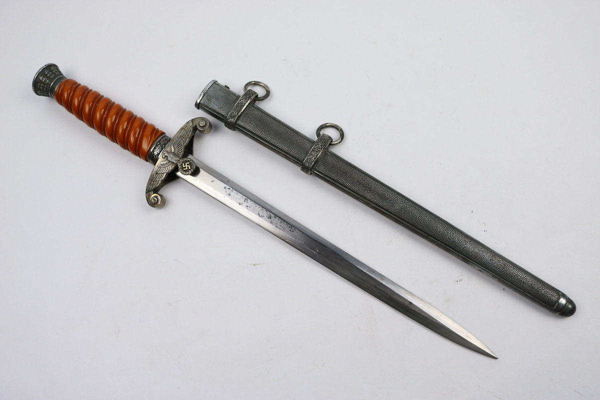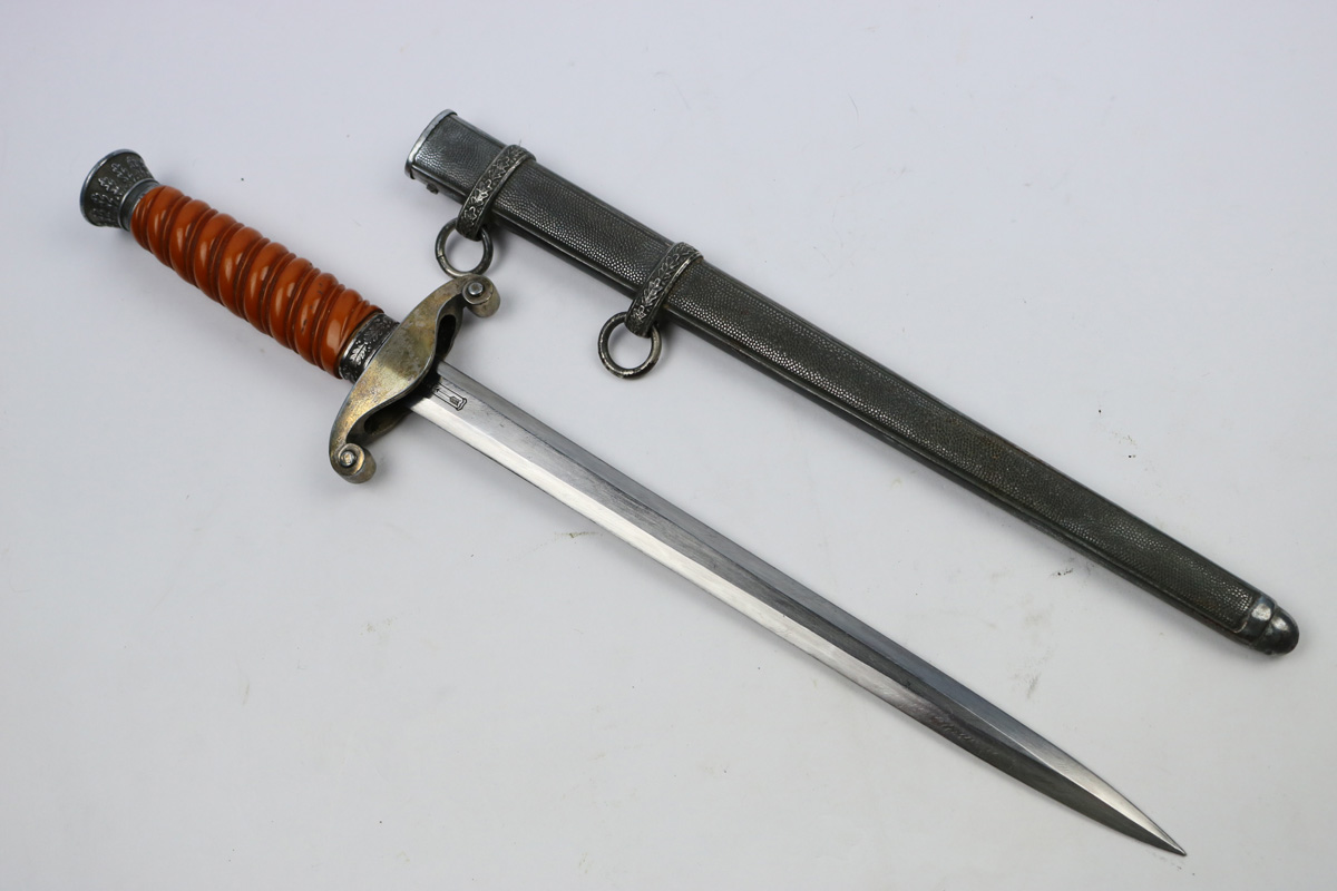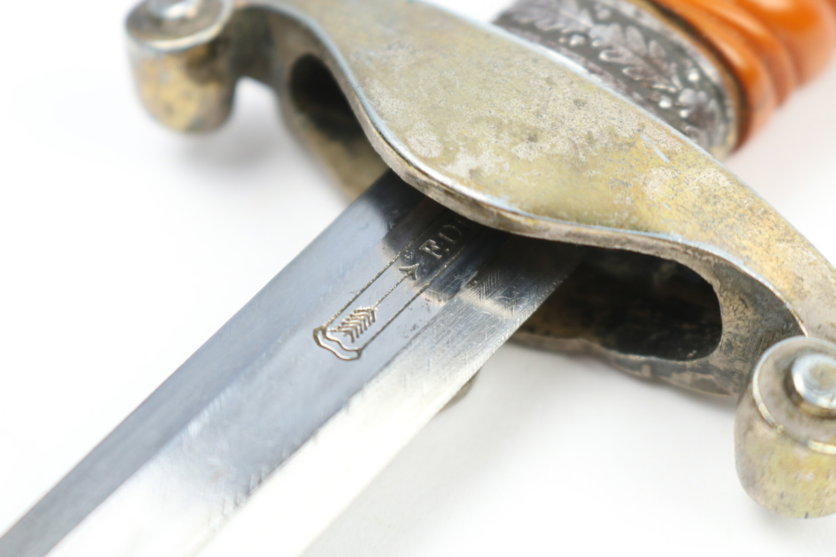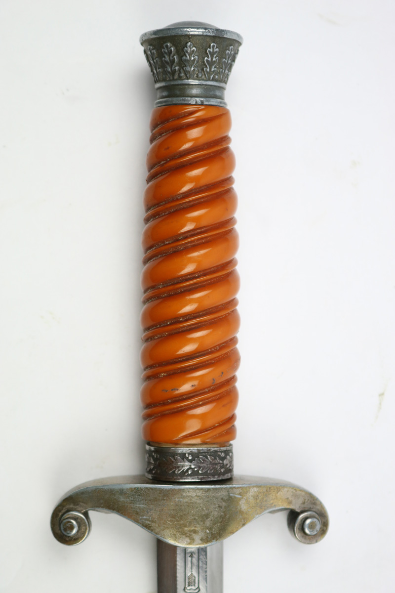 8/15/18 – This is an orignal and scarce WW2 nazi army dagger made by “F. Dick”. This producer is rarely found on these daggers, and is highly sought after by collectors. The dagger has an orange bakelite handle and origianl scabbard. The blade is maker stamped with the maker’s arrow logo. The blade has light scratches on the surface but this is normal and not excessive. The blade has never been sharpened. One side of the blade (front facing side) has oxidation discoloration in various spots. The handle is excellent with a few very light and surface scratches. These are not cracks or chips! Very nice dagger overall and comes with a nice scabbard. Guaranteed original.