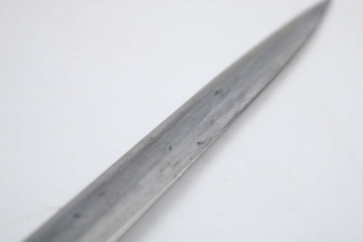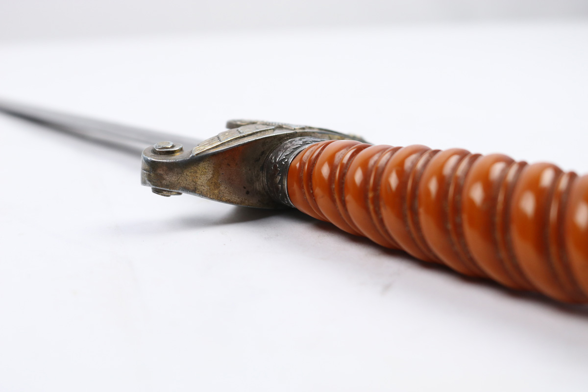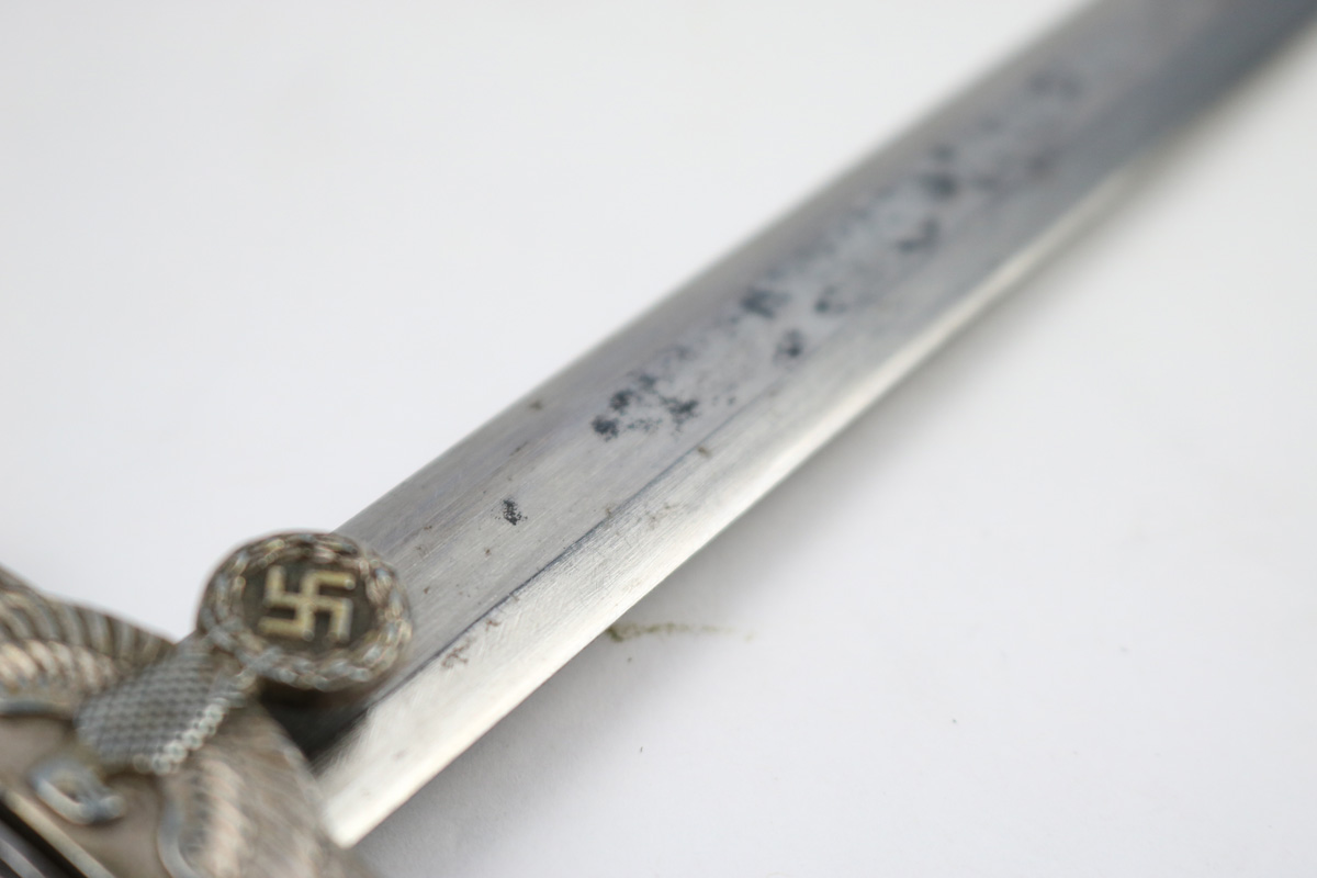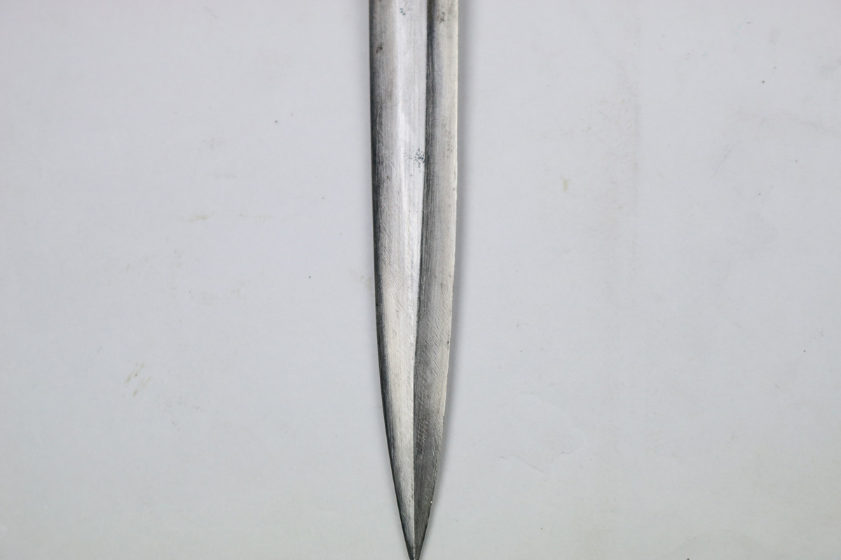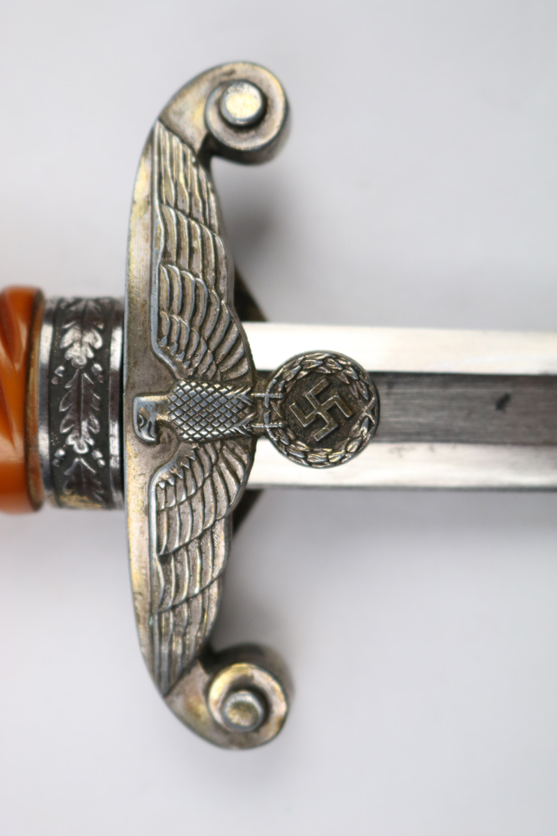 8/15/18 – This is an orignal and scarce WW2 nazi army dagger made by “F. Dick”. This producer is rarely found on these daggers, and is highly sought after by collectors. The dagger has an orange bakelite handle and origianl scabbard. The blade is maker stamped with the maker’s arrow logo. The blade has light scratches on the surface but this is normal and not excessive. The blade has never been sharpened. One side of the blade (front facing side) has oxidation discoloration in various spots. The handle is excellent with a few very light and surface scratches. These are not cracks or chips! Very nice dagger overall and comes with a nice scabbard. Guaranteed original.