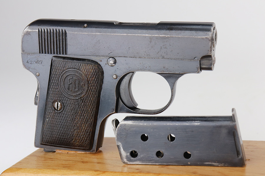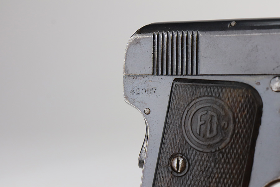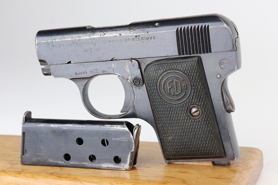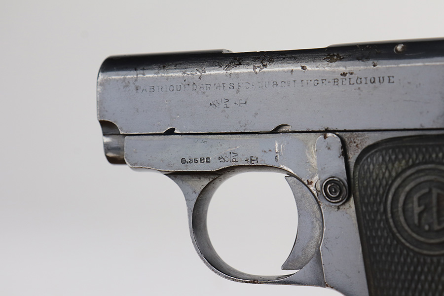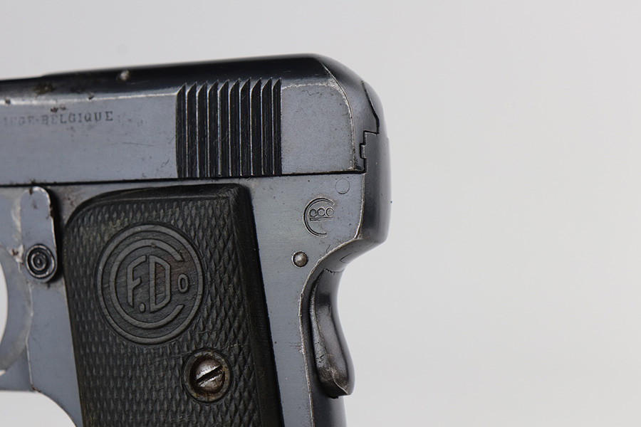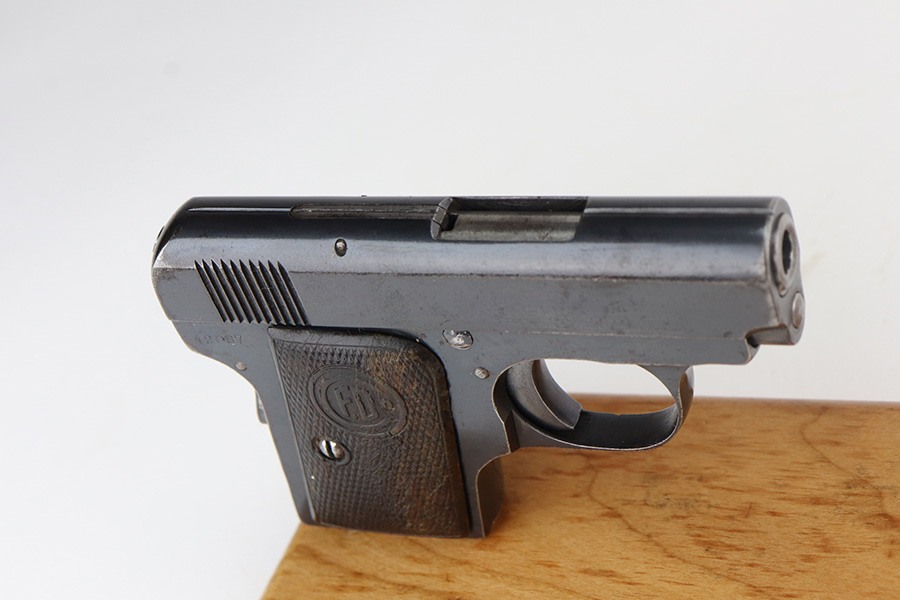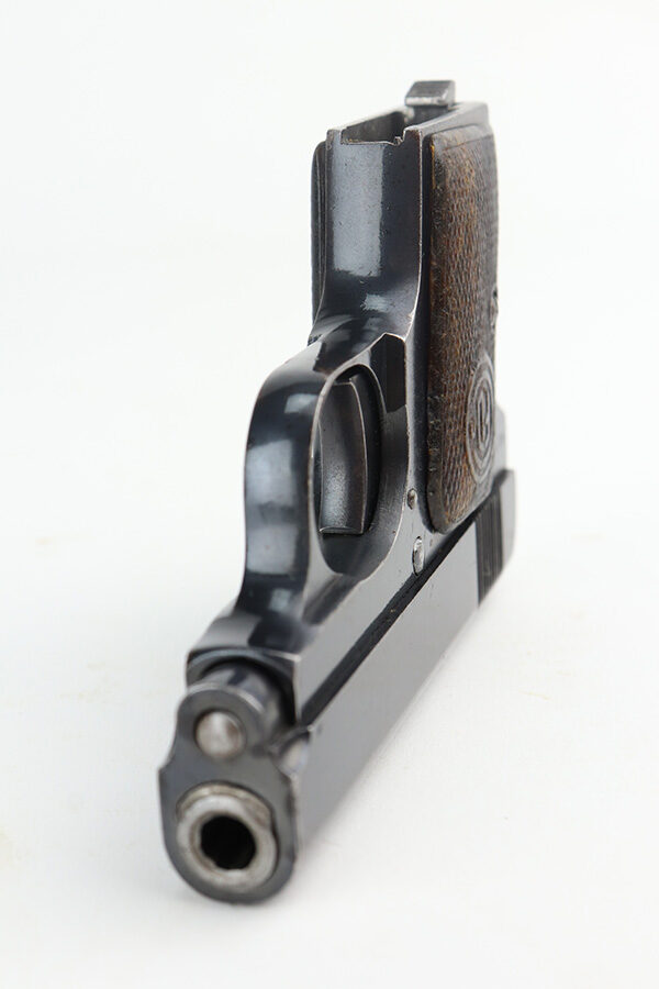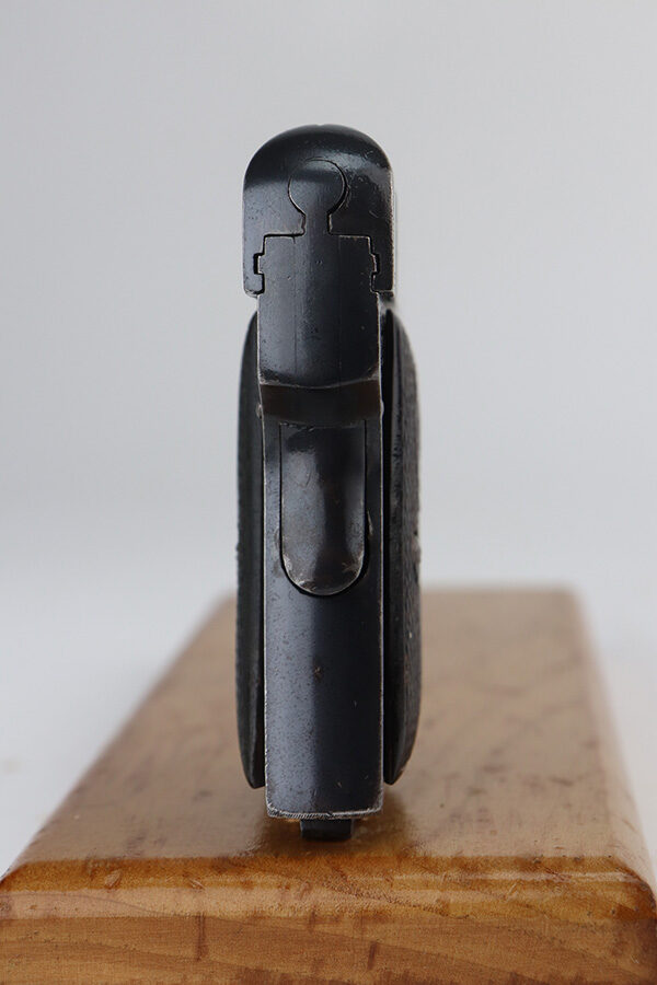 6/10/21 – This is a very nice example of a Belgian F. DELU Vest Pocket Pocket Pistol chambered in 6.35mm and manufactured in the early 1900’s. This gun is a copy of the Browning Model 1906. It is matching and has the proper Belgian proofs. It also has a “Geco” marking on the tang, indicating it was sold to a private retailer. It has retained about 93% of its original bluing with minor wear on the high edges of the slide and around the muzzle. Minor pitting on the left side of the slide and some light scratches on the left side of the frame. Comes with nice correct grips and a correct magazine. Excellent bore – shiny with strong rifling.